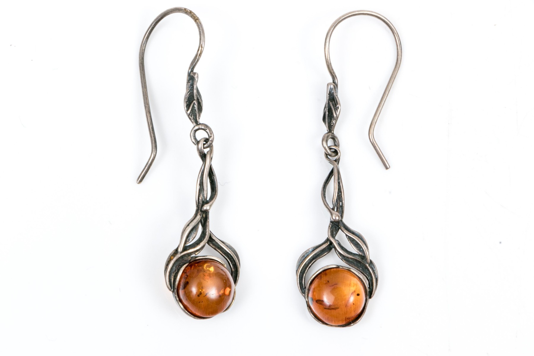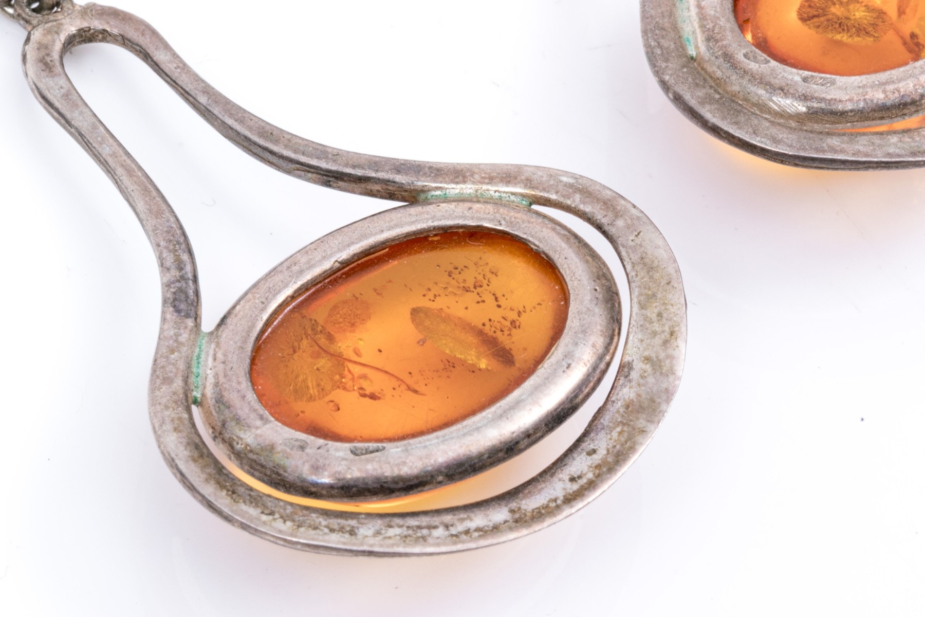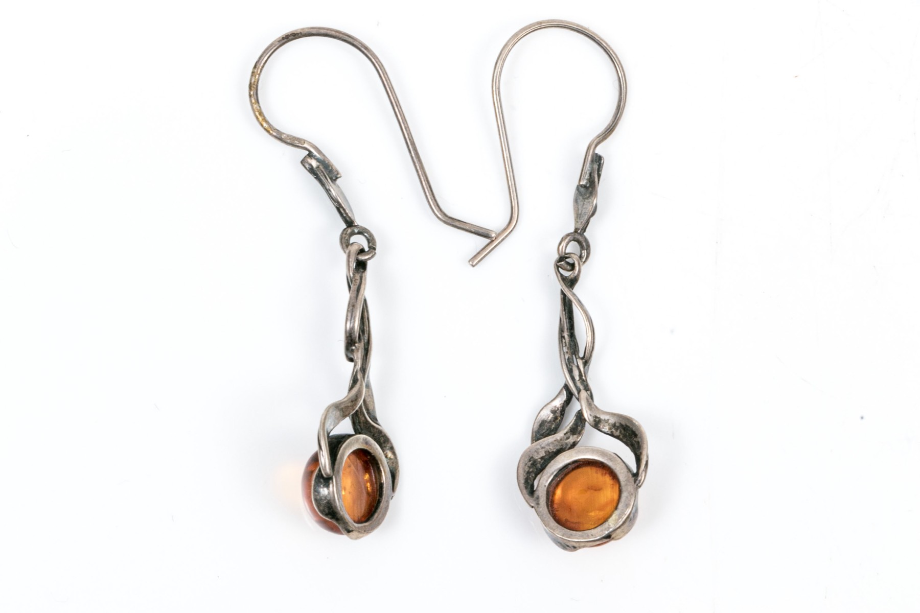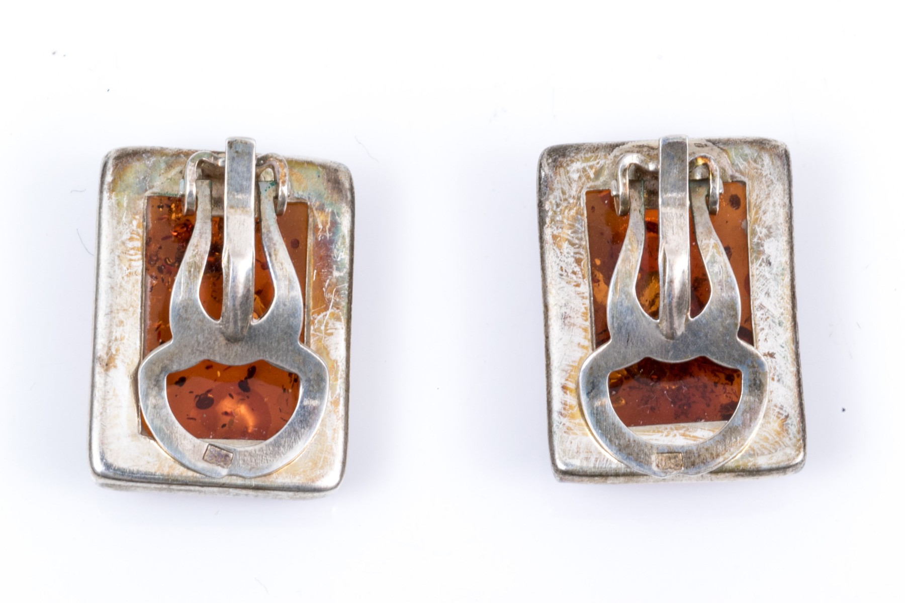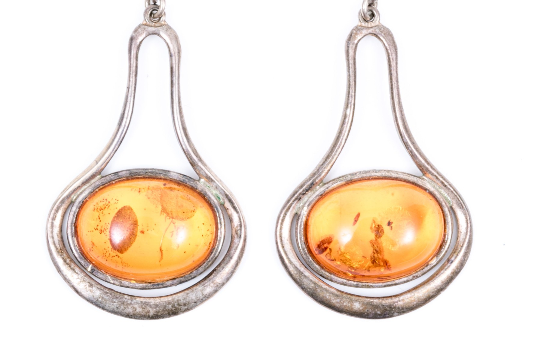 Collection of sterling and faux amber jewelry. Pendant necklace with hook clasps. Two pairs of pendant earrings with hook clasps. Pair of rectangular clip back earrings.