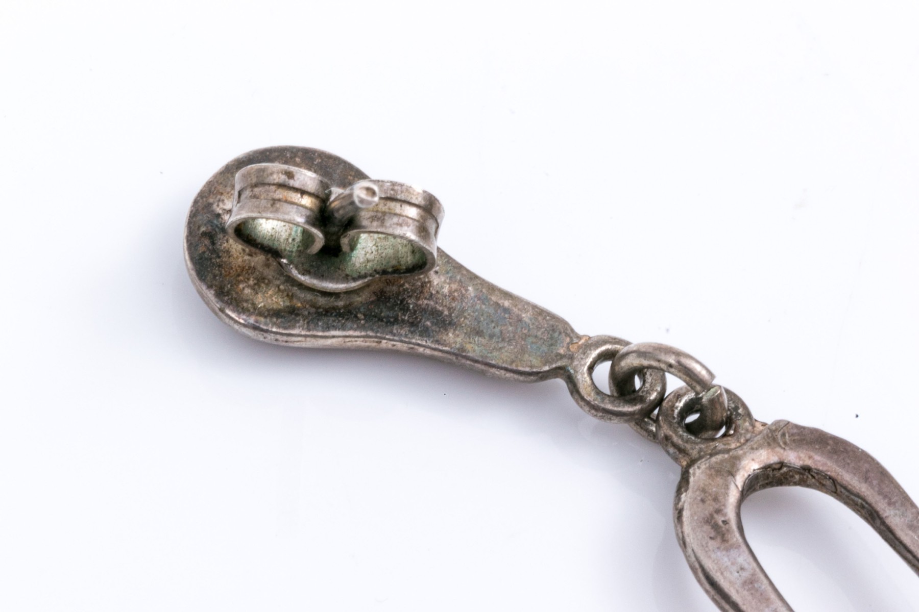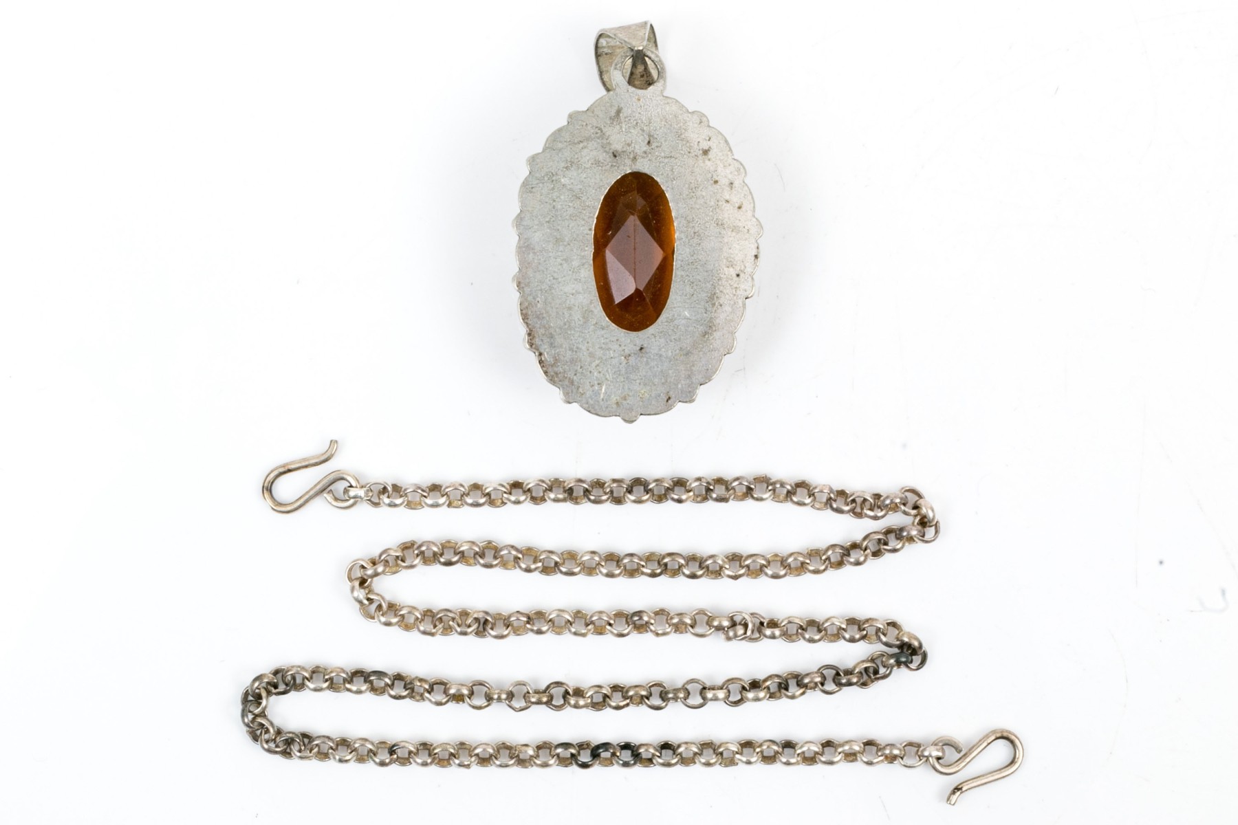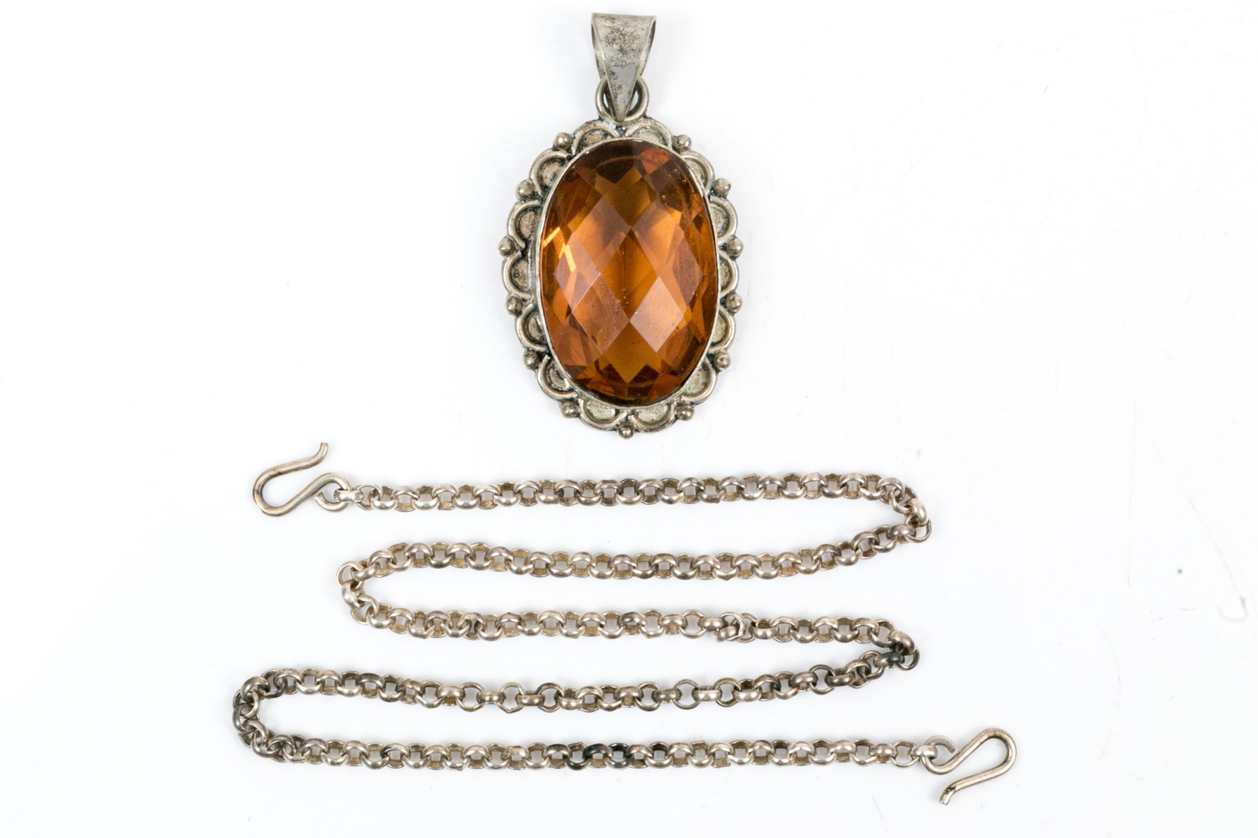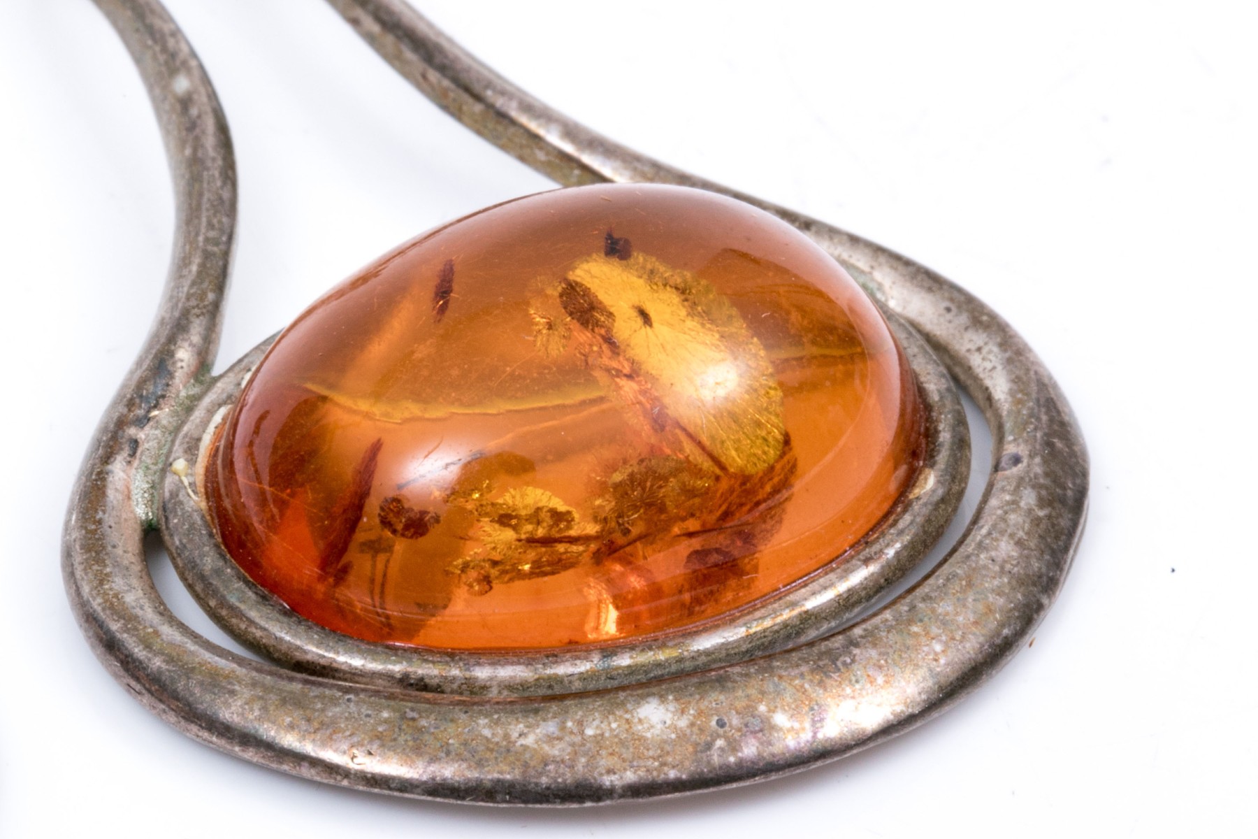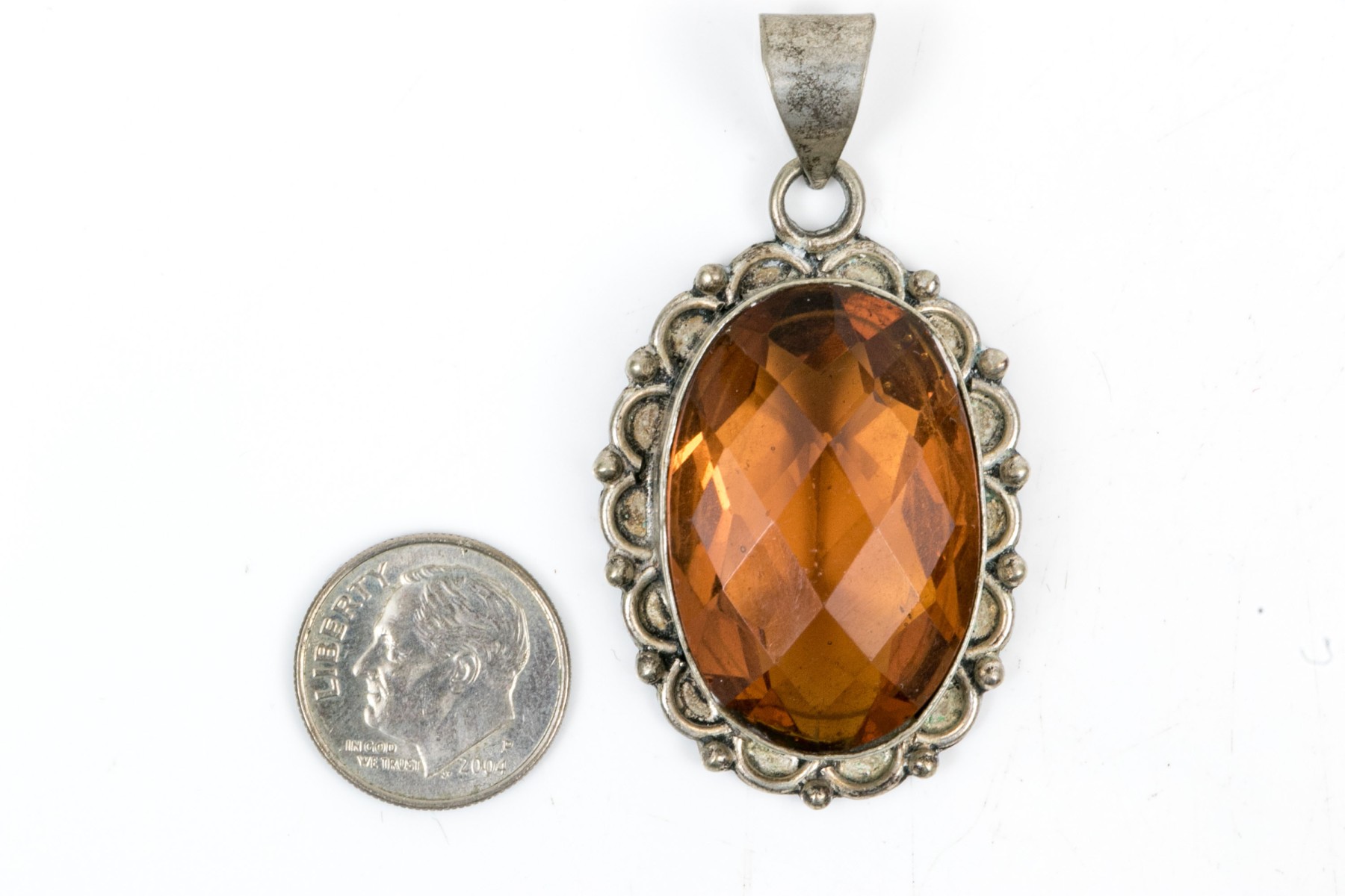 Collection of sterling and faux amber jewelry. Pendant necklace with hook clasps. Two pairs of pendant earrings with hook clasps. Pair of rectangular clip back earrings.