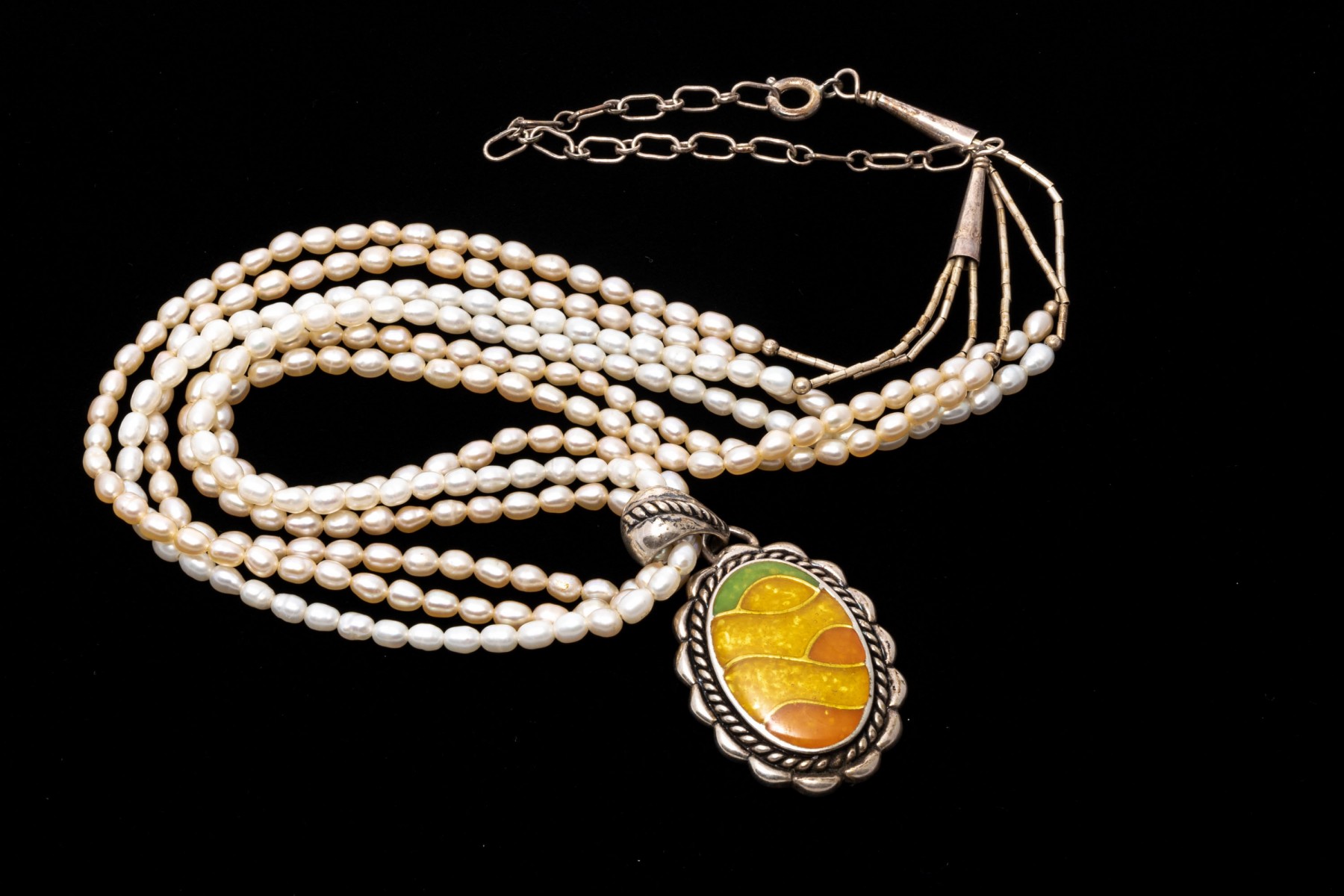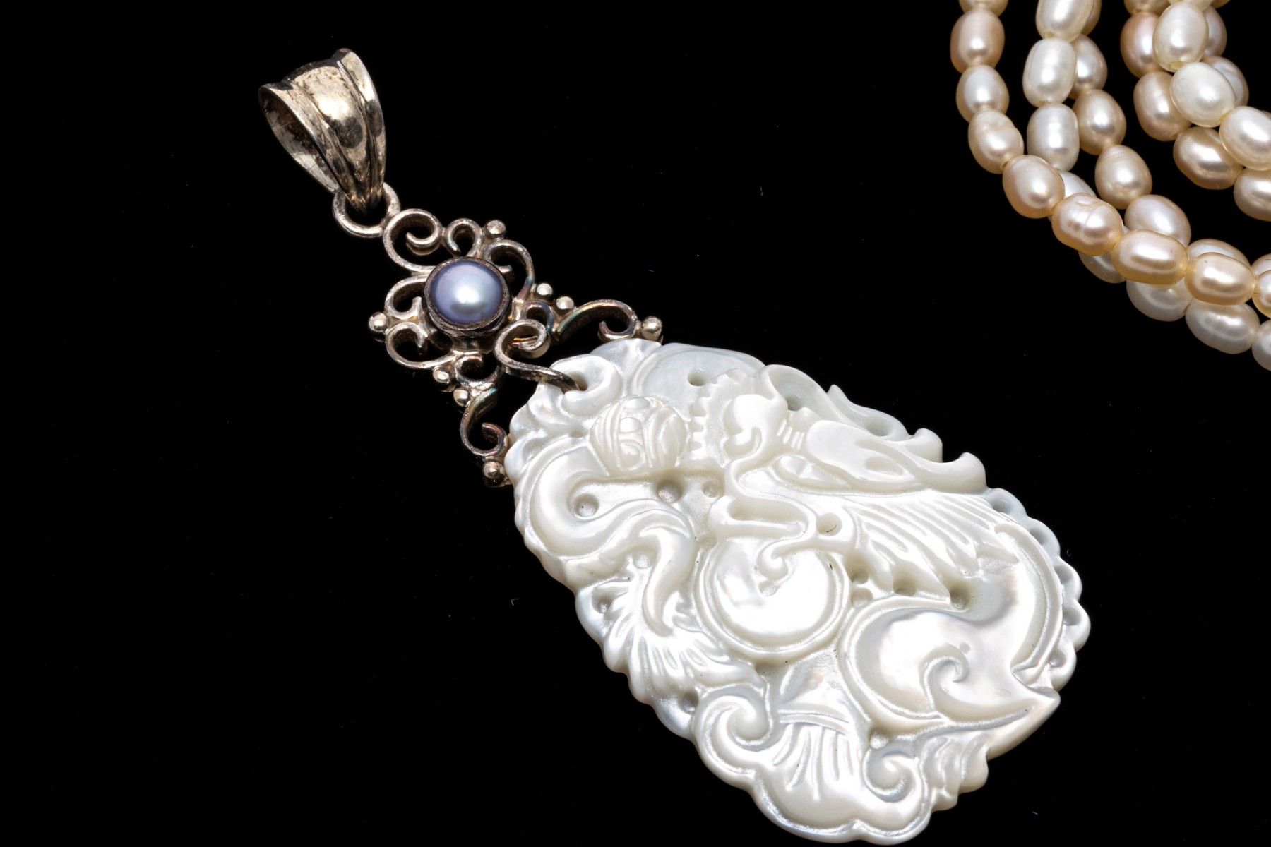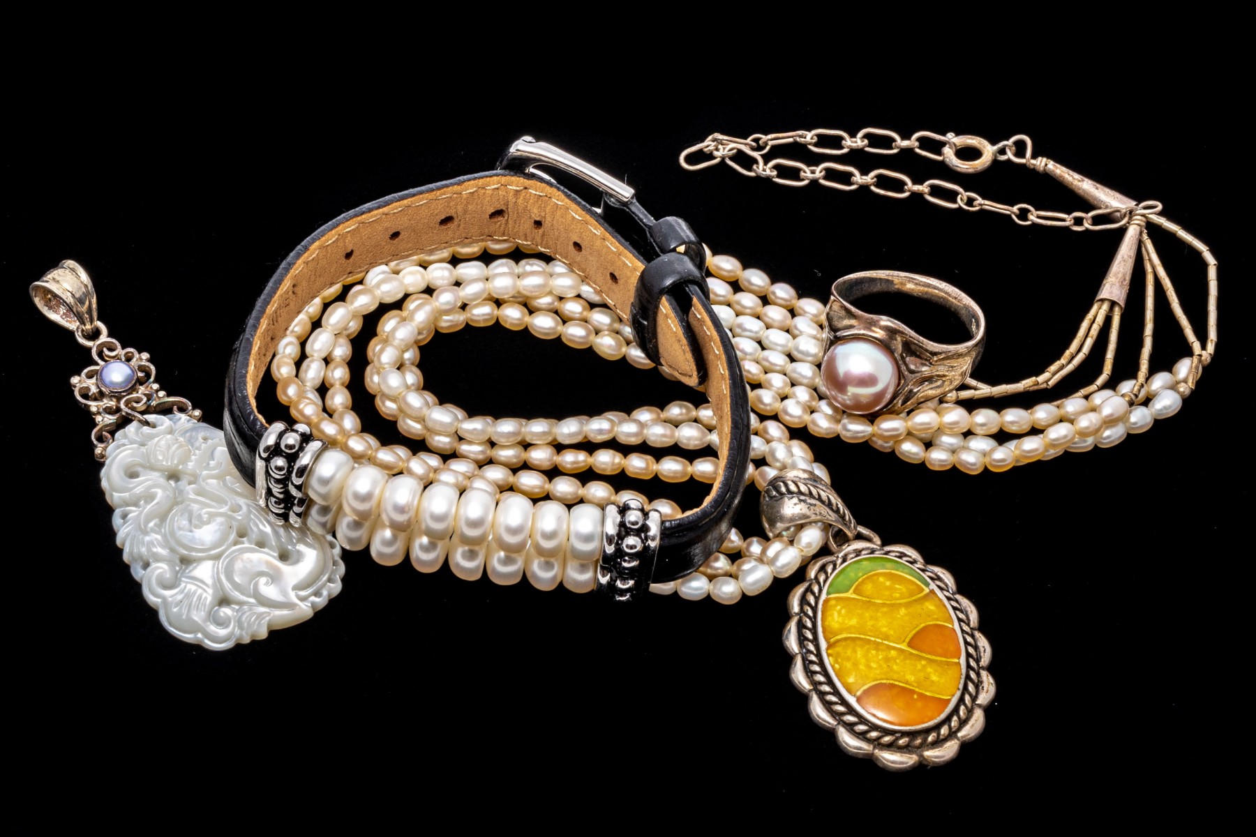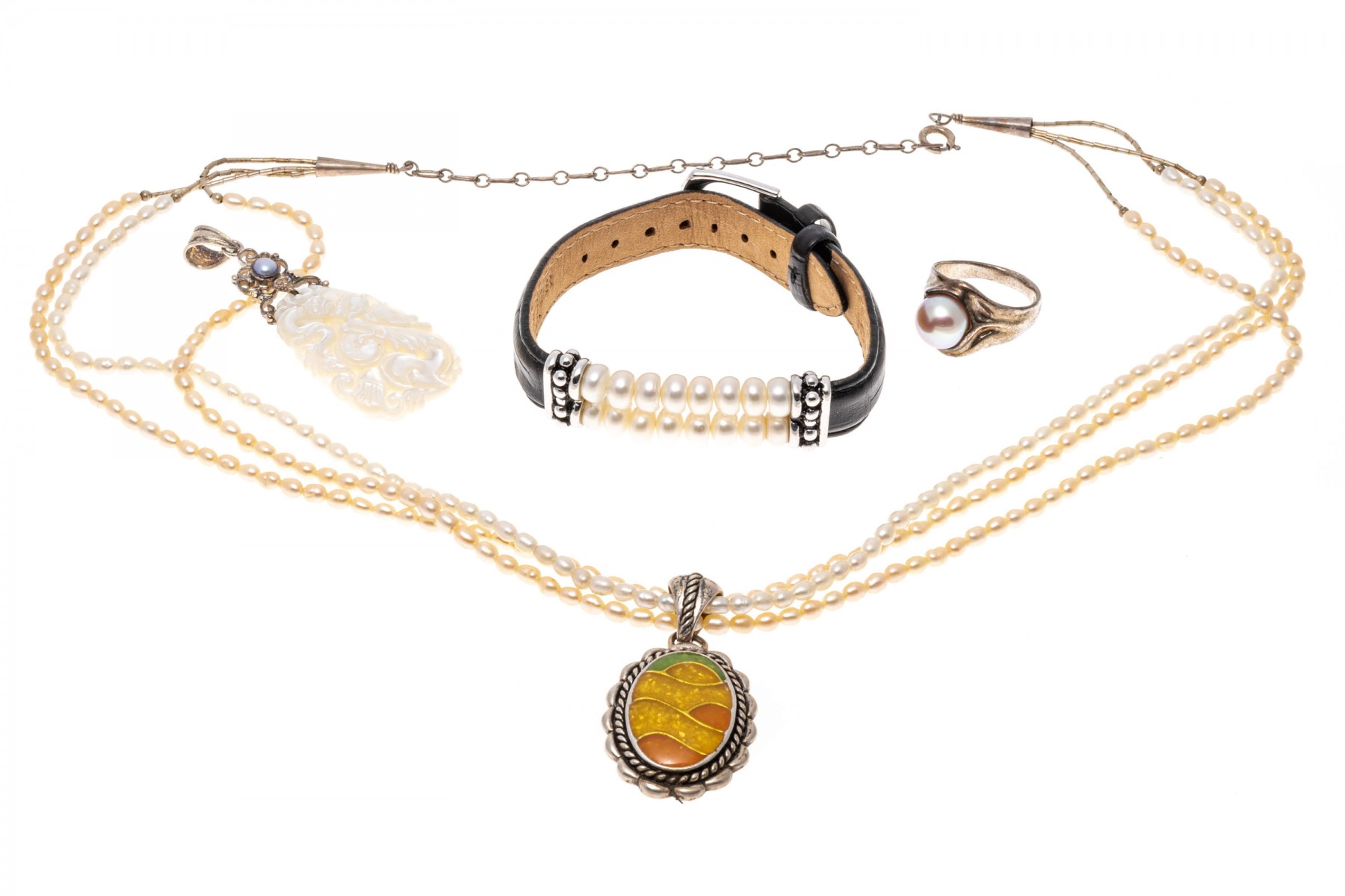 A group of complimentary jewelry. Sterling silver ring with pink pearl, size 8. A carved mother of pearl pedant with sterling silver bale. A leather bracelet with two strands of disk shaped pearls and sterling silver accents at the center, buckle clasp. Last is a three stranded necklace of strung kasha pearls and a brightly colored sterling silver pendant, spring ring clasp.