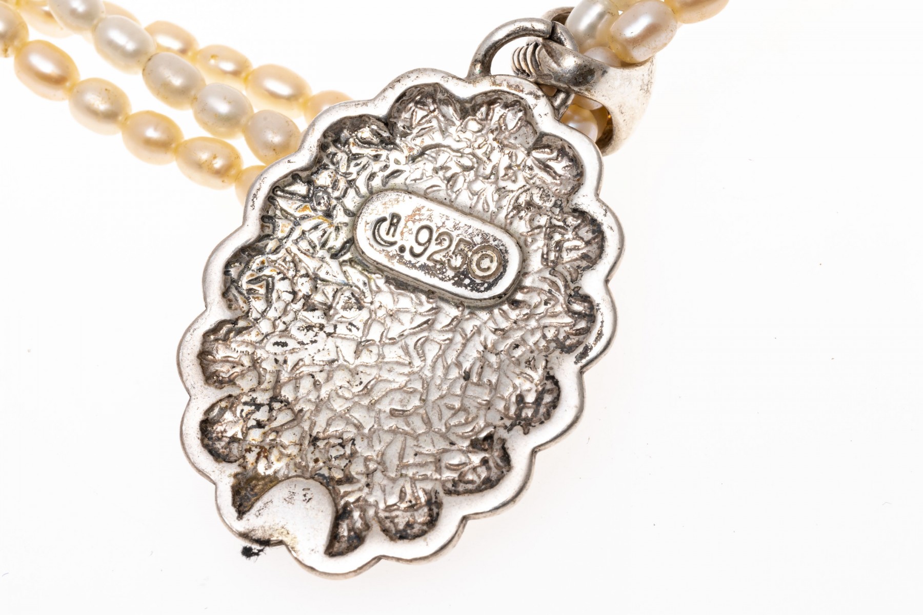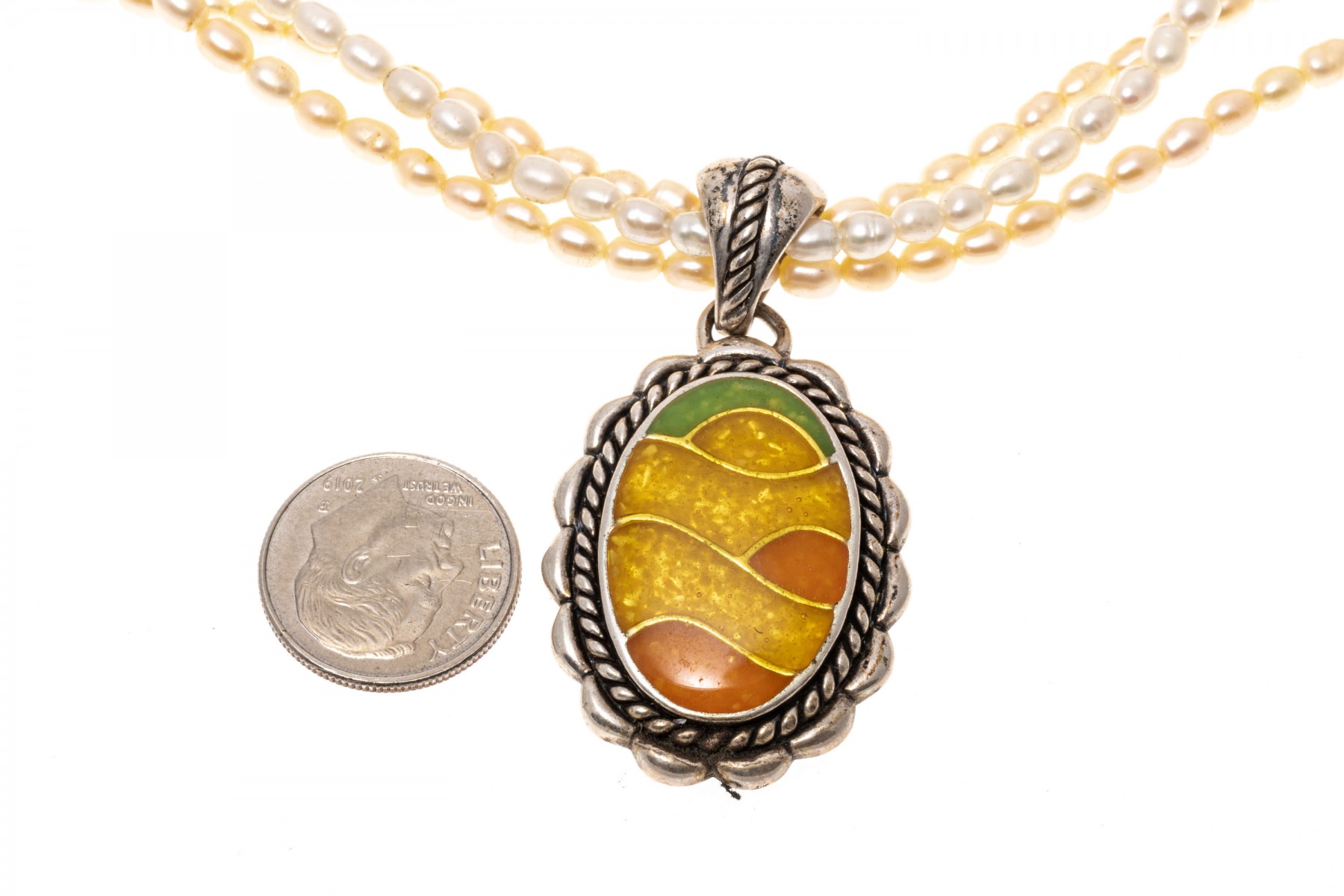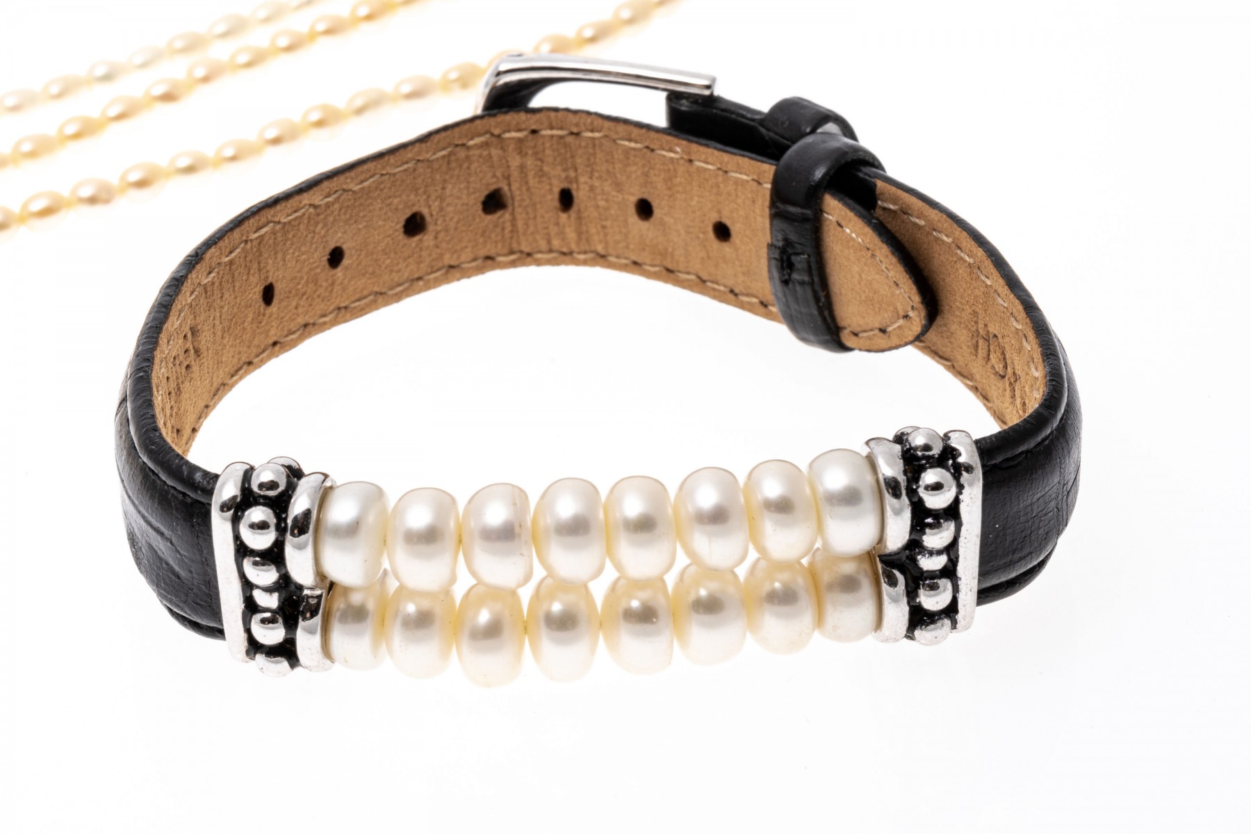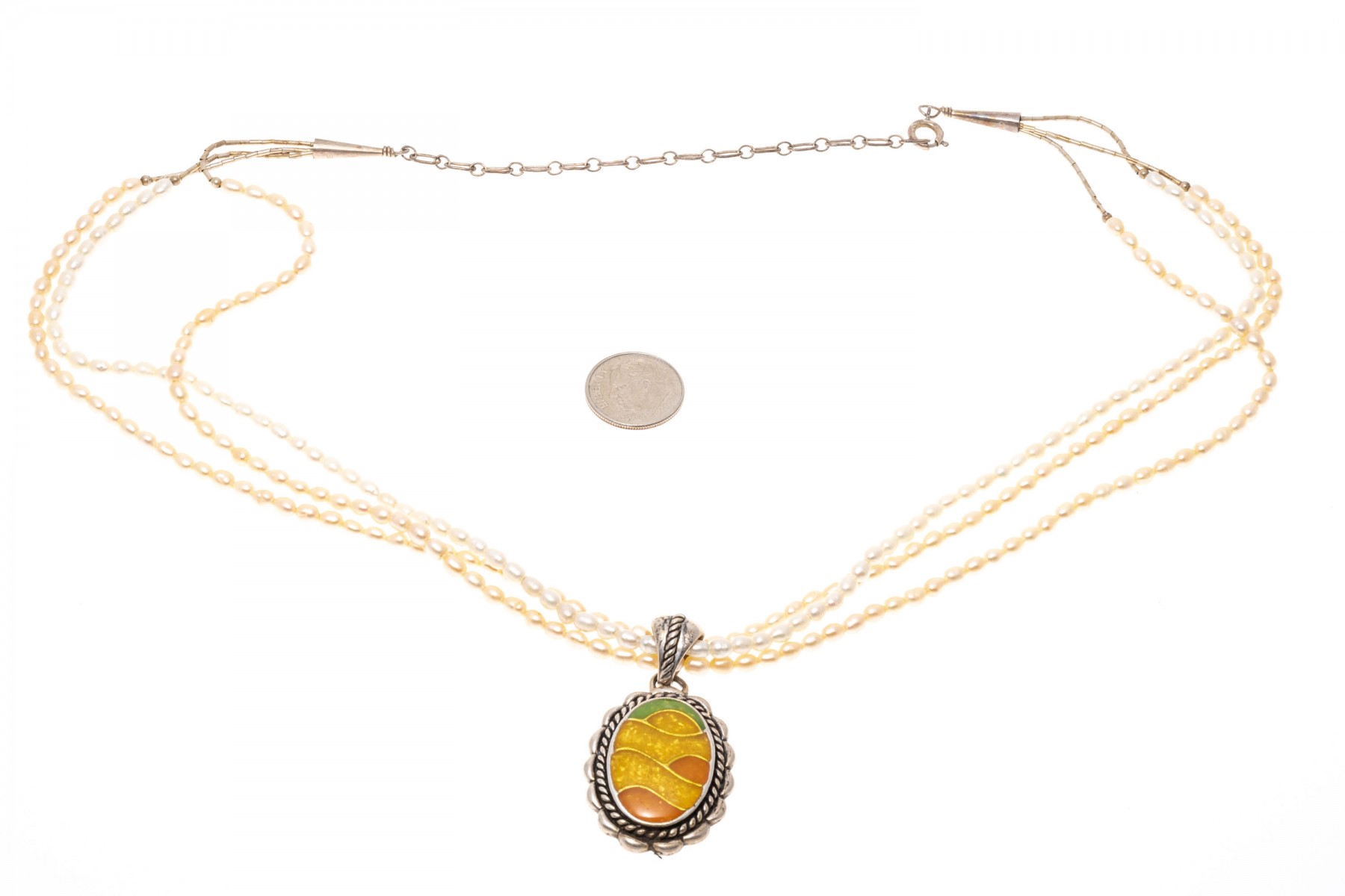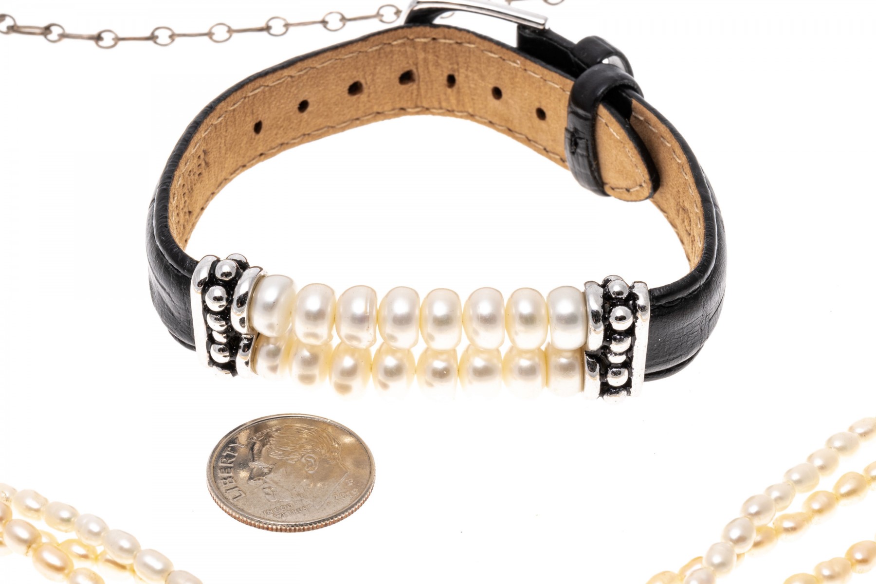 A group of complimentary jewelry. Sterling silver ring with pink pearl, size 8. A carved mother of pearl pedant with sterling silver bale. A leather bracelet with two strands of disk shaped pearls and sterling silver accents at the center, buckle clasp. Last is a three stranded necklace of strung kasha pearls and a brightly colored sterling silver pendant, spring ring clasp.