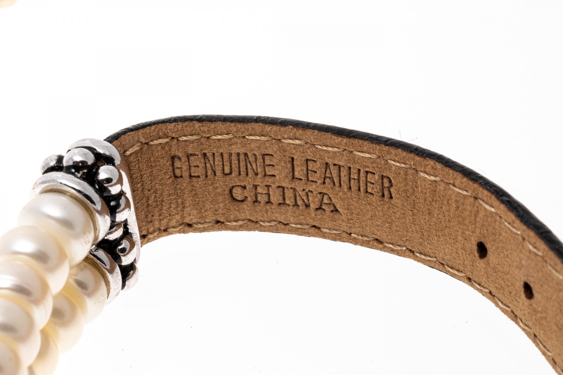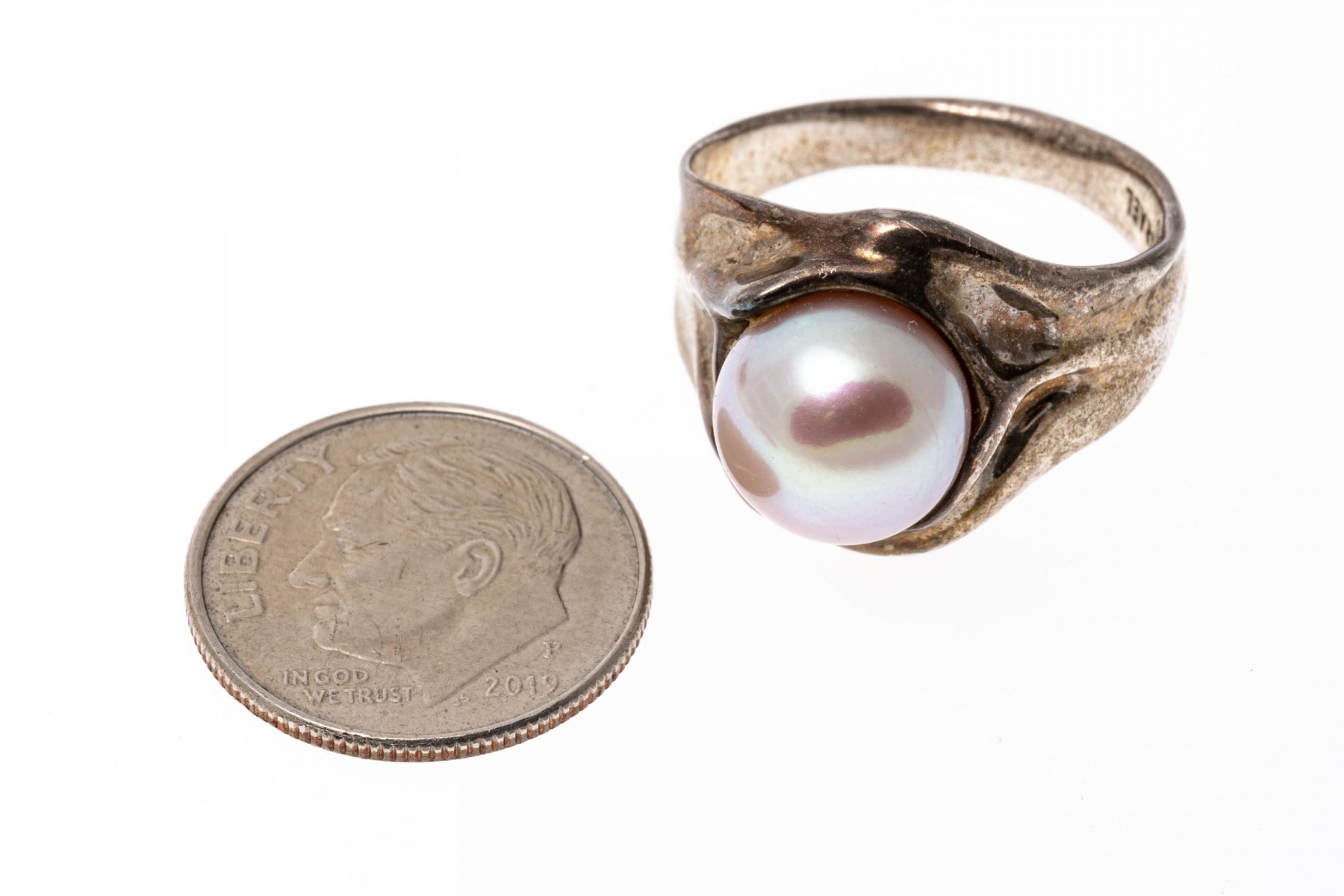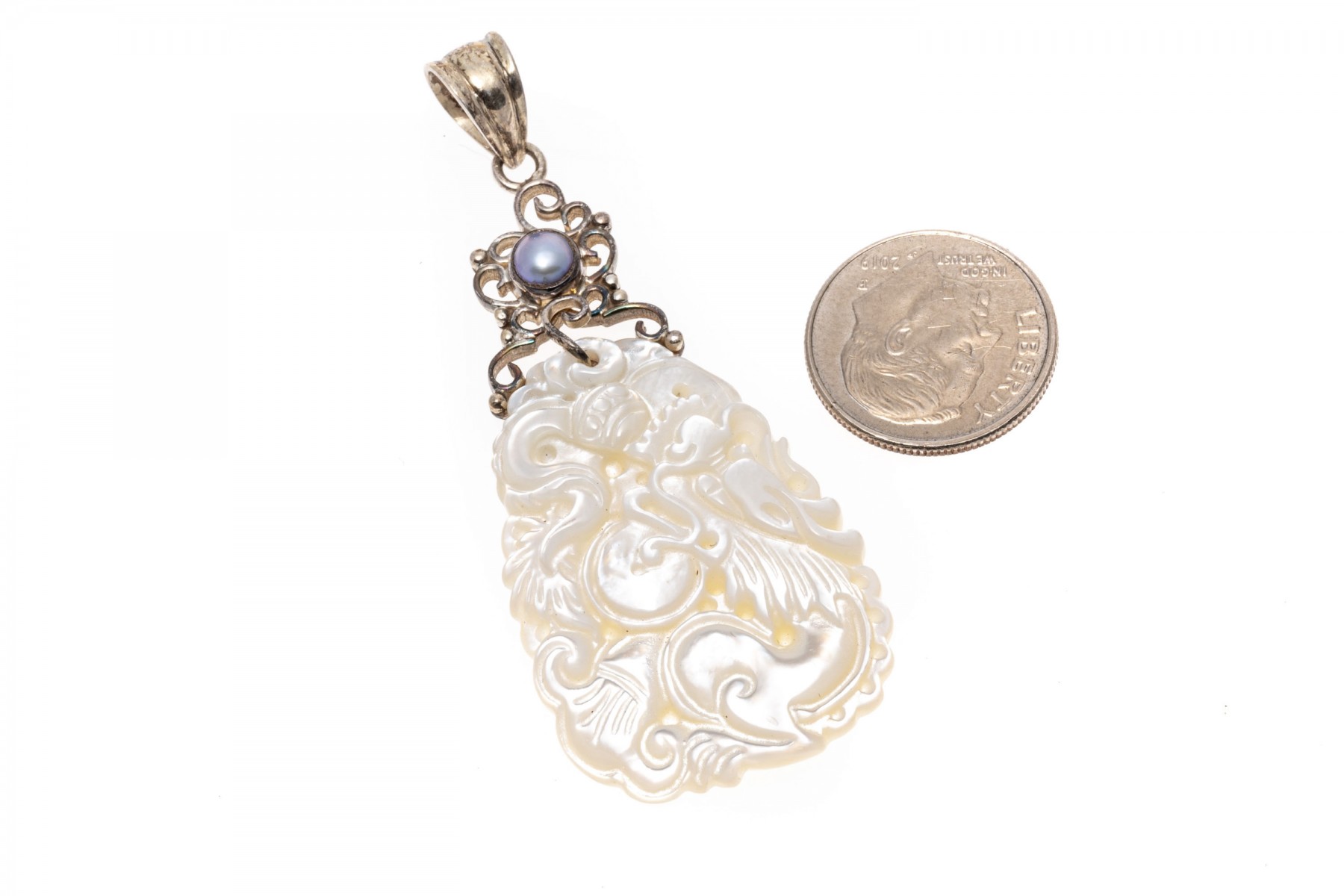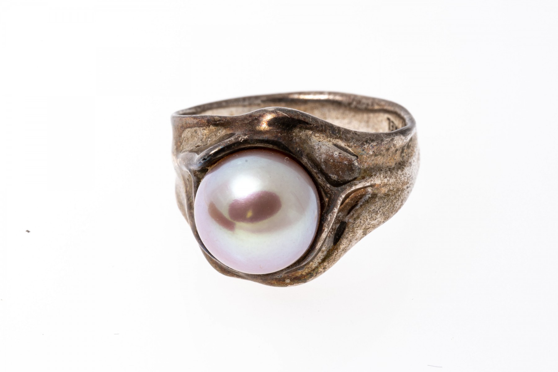A group of complimentary jewelry. Sterling silver ring with pink pearl, size 8. A carved mother of pearl pedant with sterling silver bale. A leather bracelet with two strands of disk shaped pearls and sterling silver accents at the center, buckle clasp. Last is a three stranded necklace of strung kasha pearls and a brightly colored sterling silver pendant, spring ring clasp.