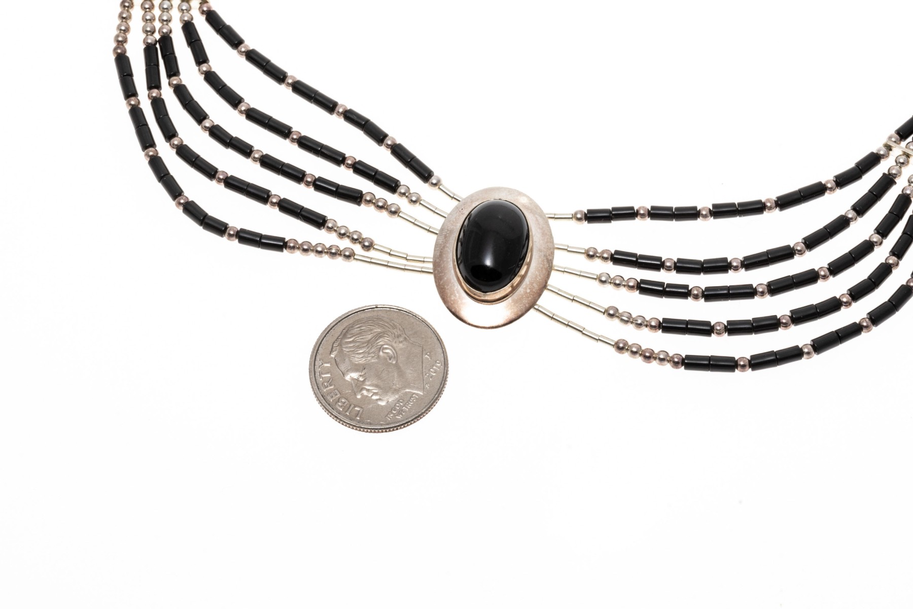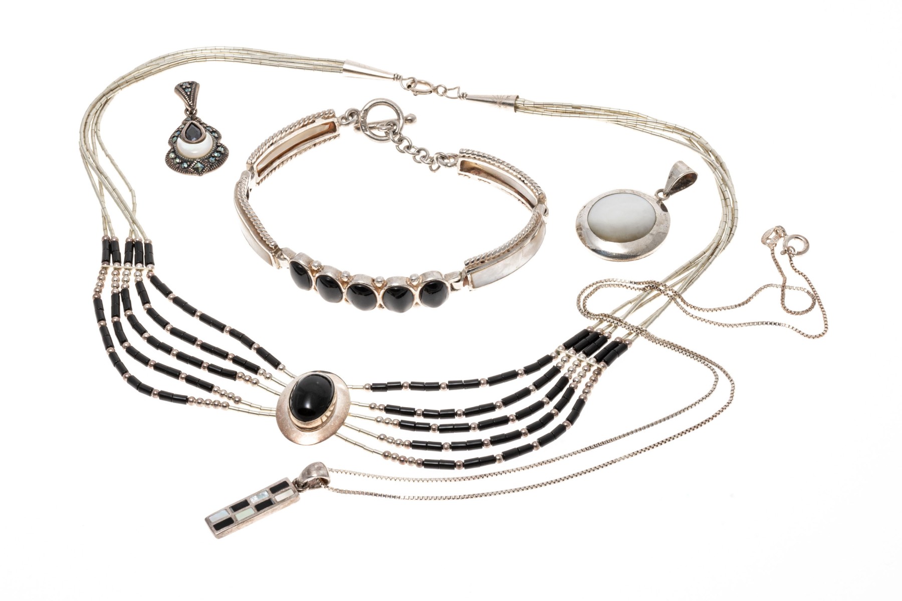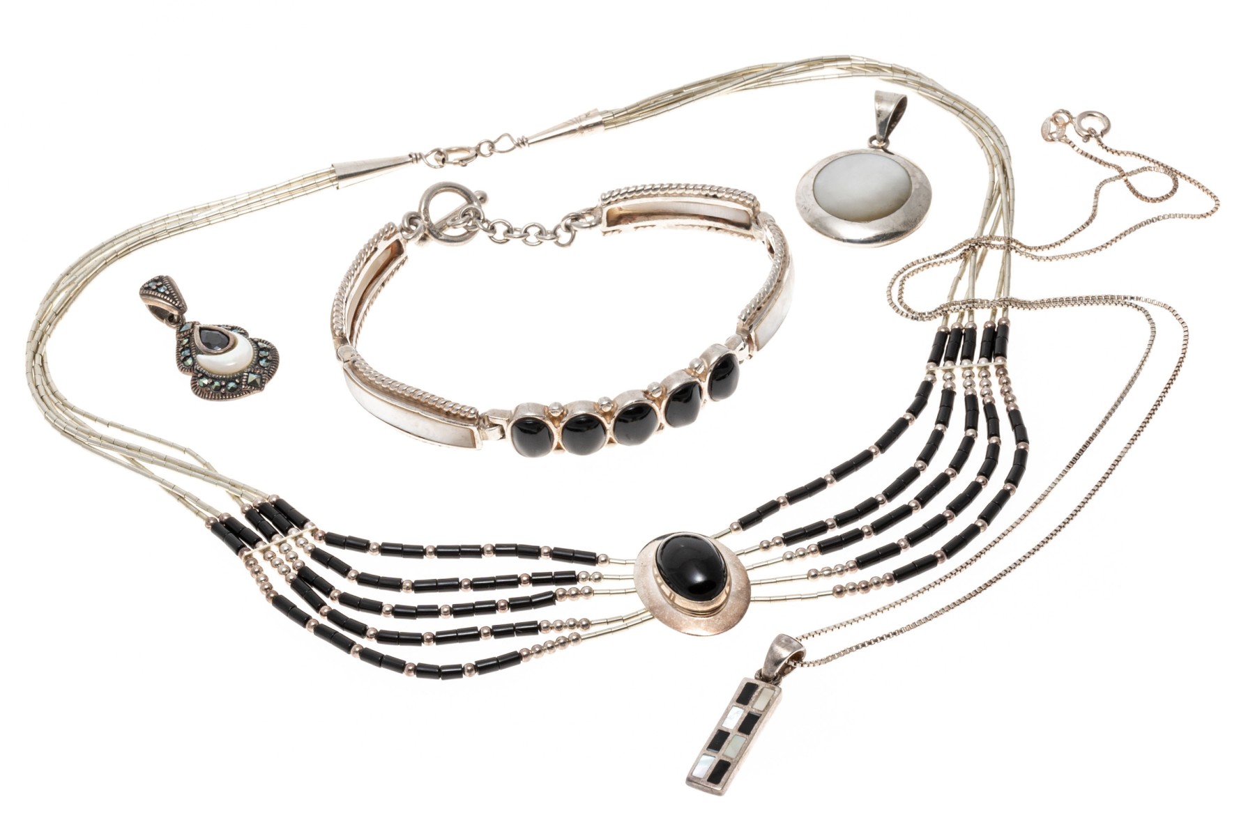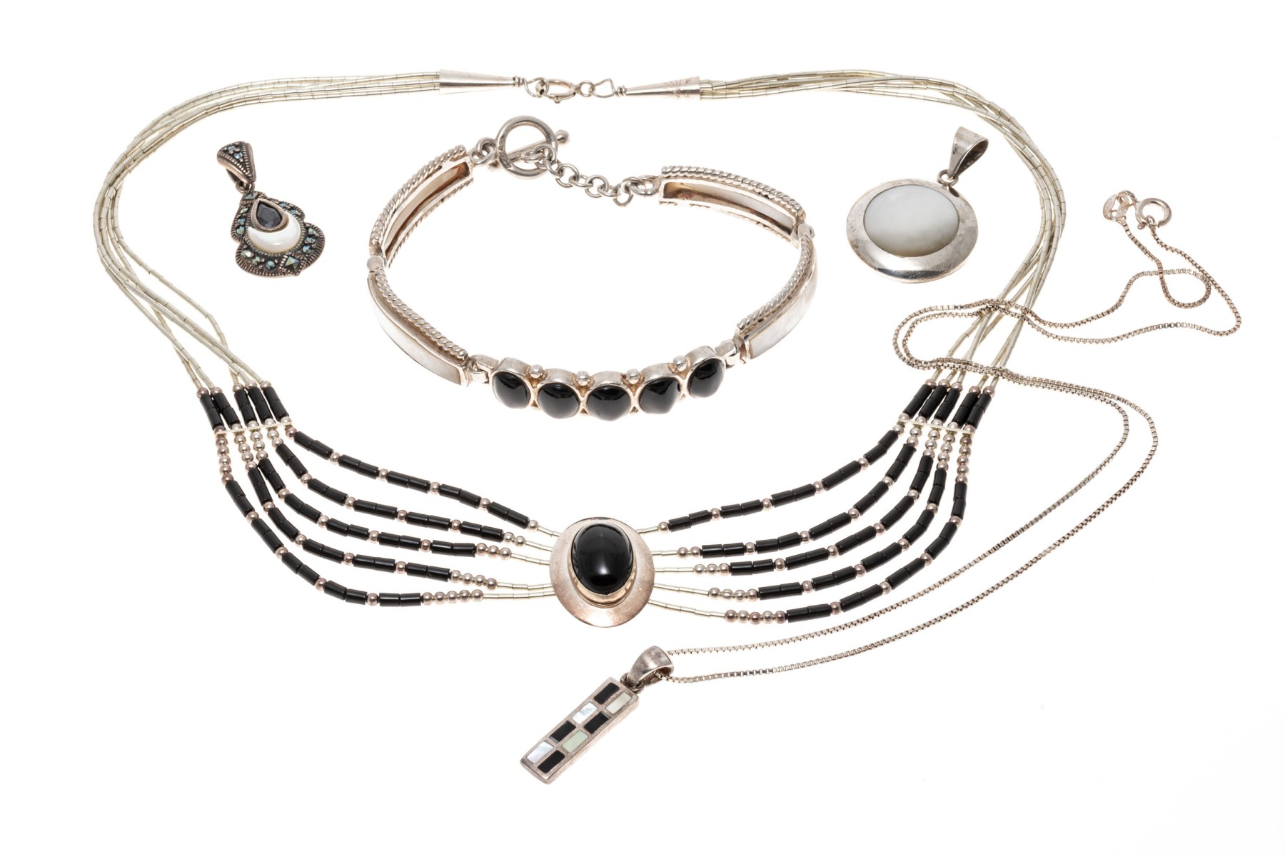 Collection of black onyx and mother of pearl jewelry. A multi-stranded necklace, pendant necklace, bracelet and two pendants.