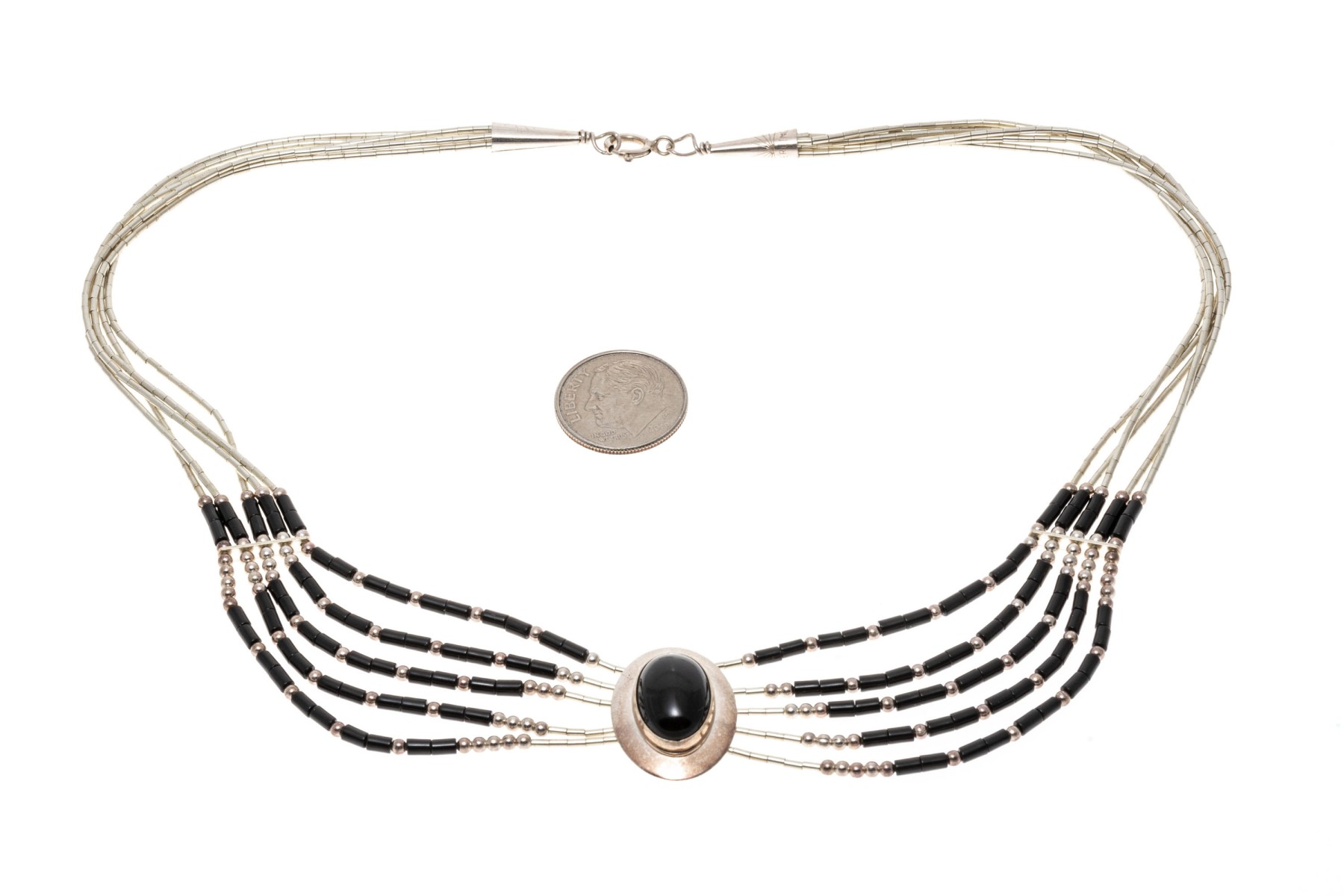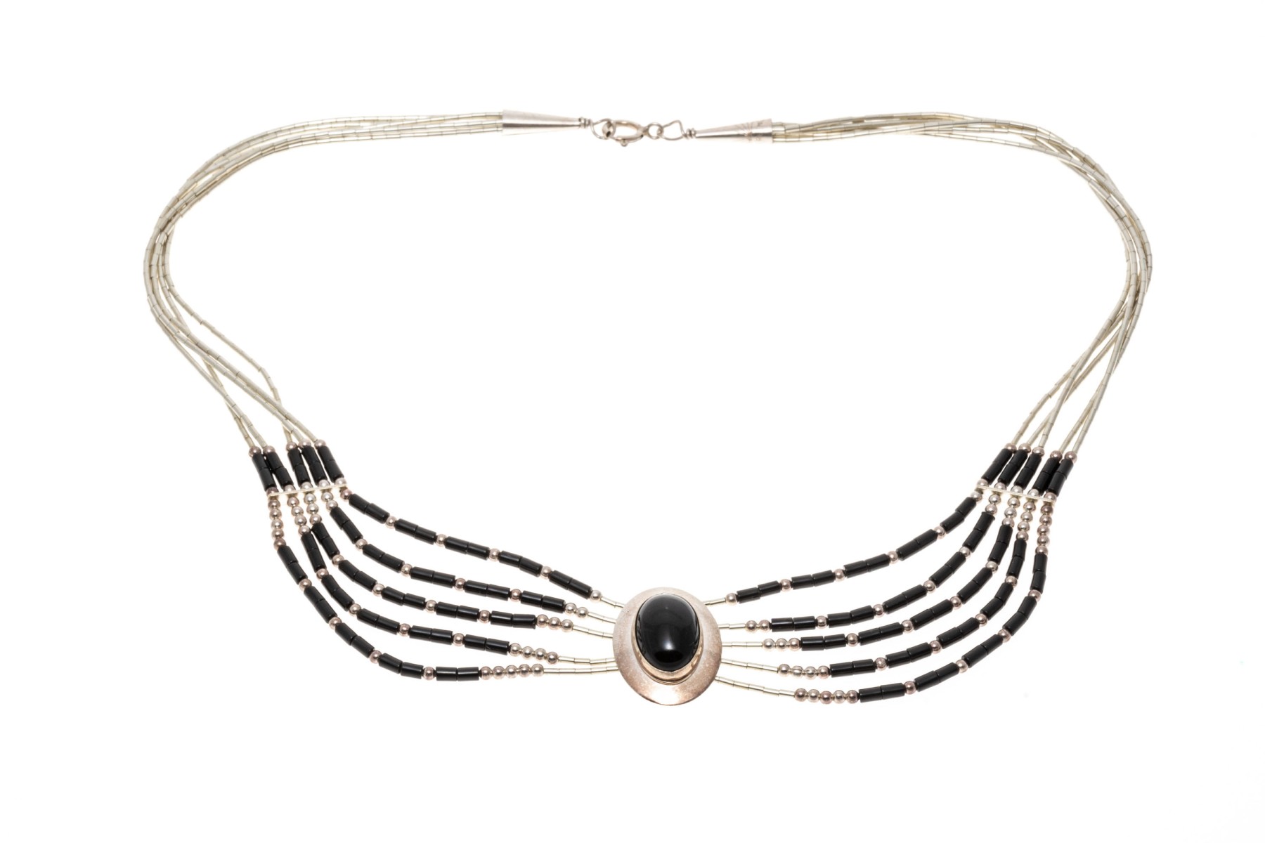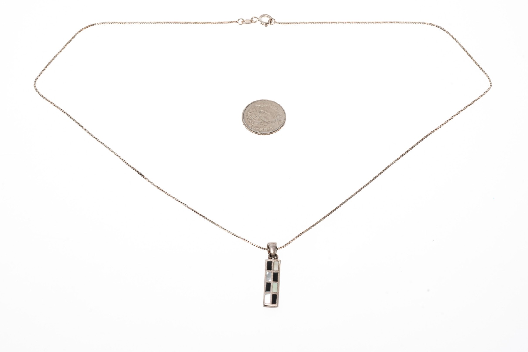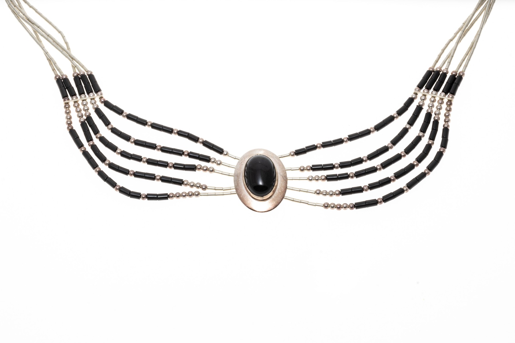 Collection of black onyx and mother of pearl jewelry. A multi-stranded necklace, pendant necklace, bracelet and two pendants.