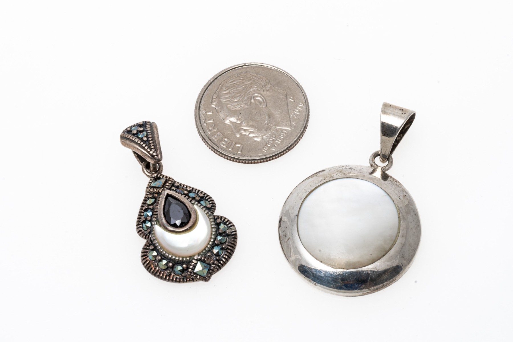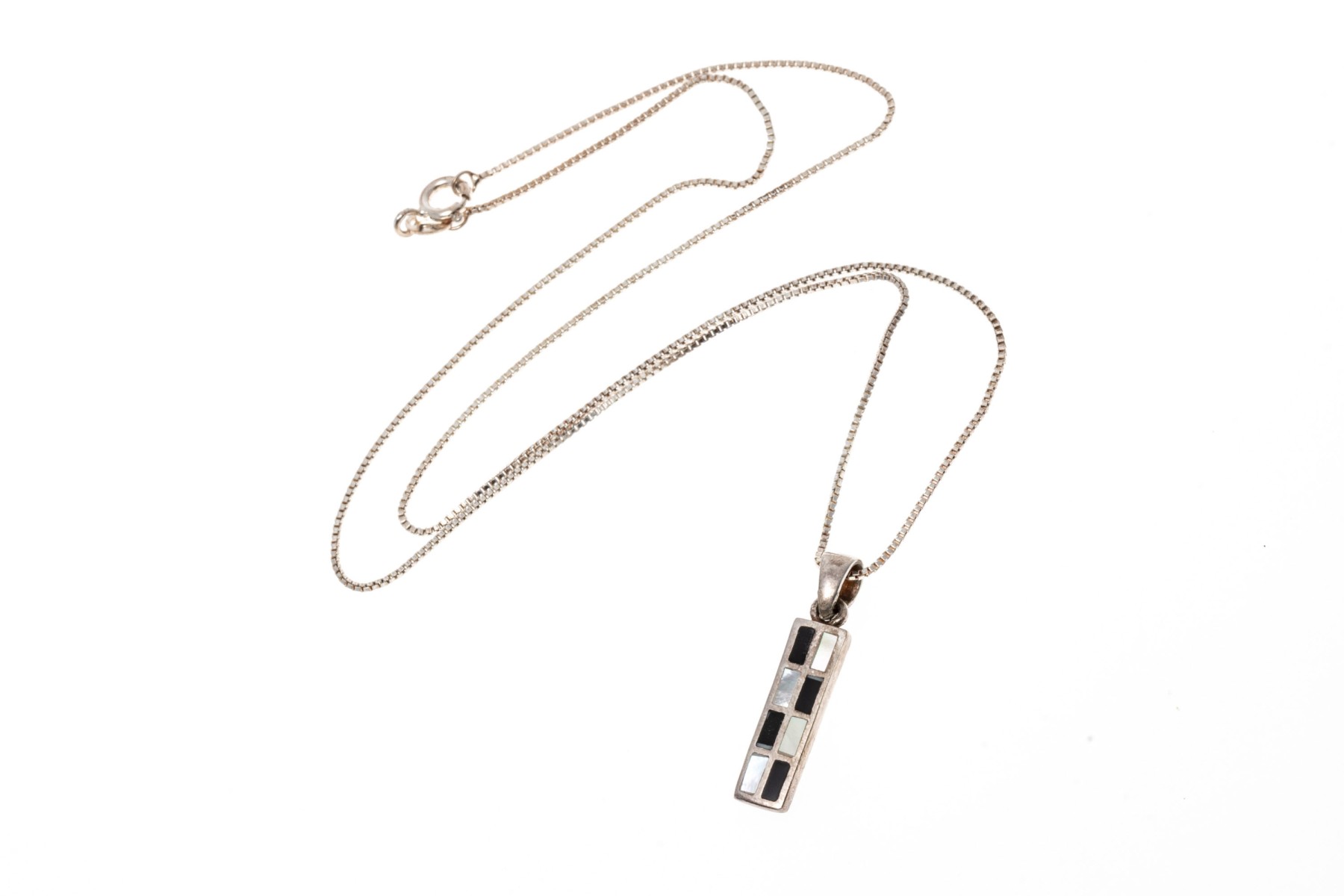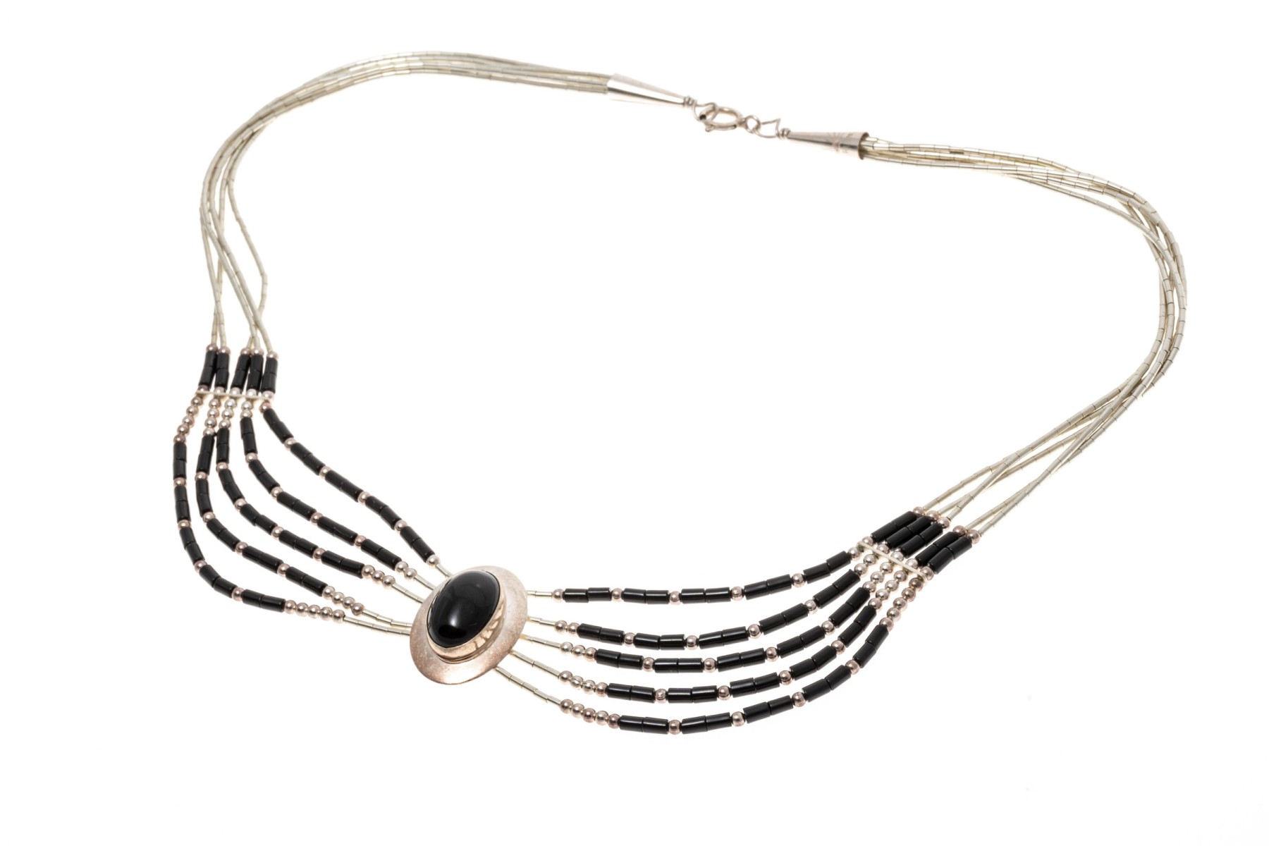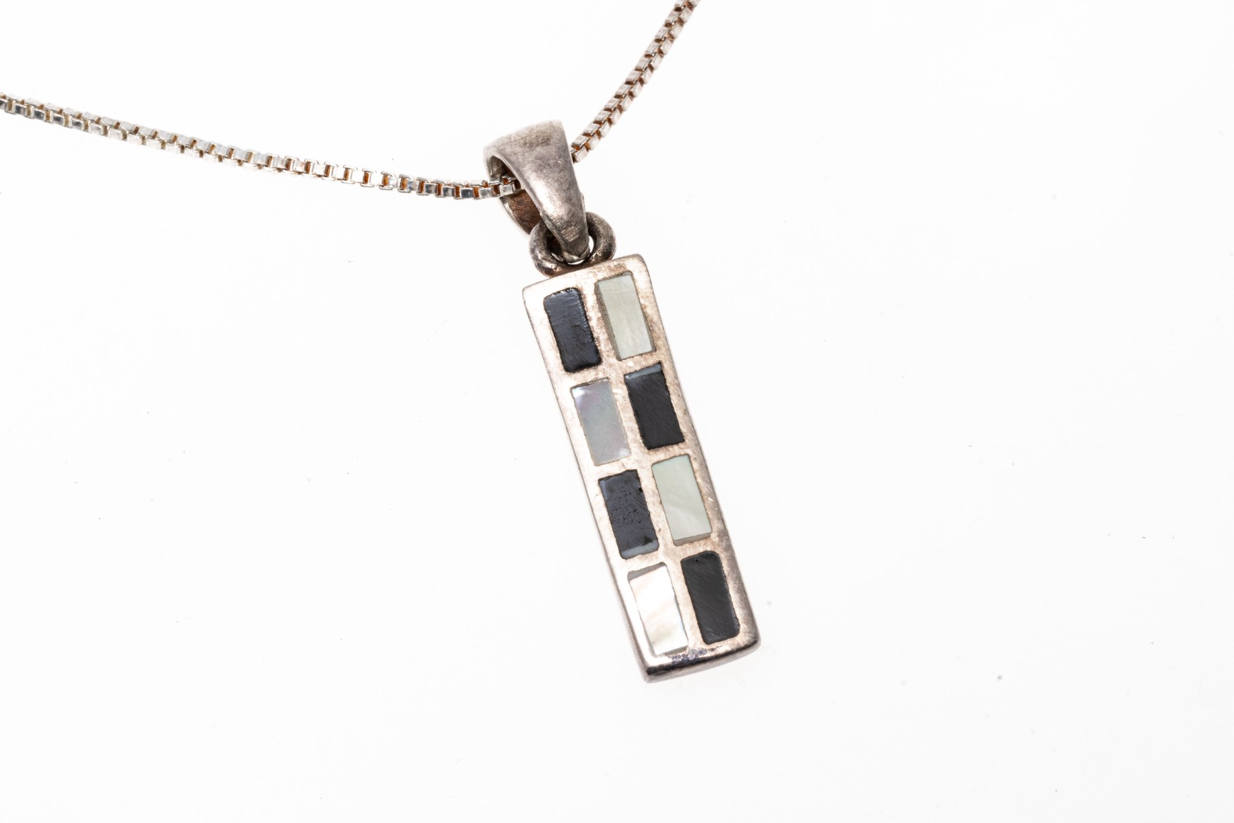 Collection of black onyx and mother of pearl jewelry. A multi-stranded necklace, pendant necklace, bracelet and two pendants.