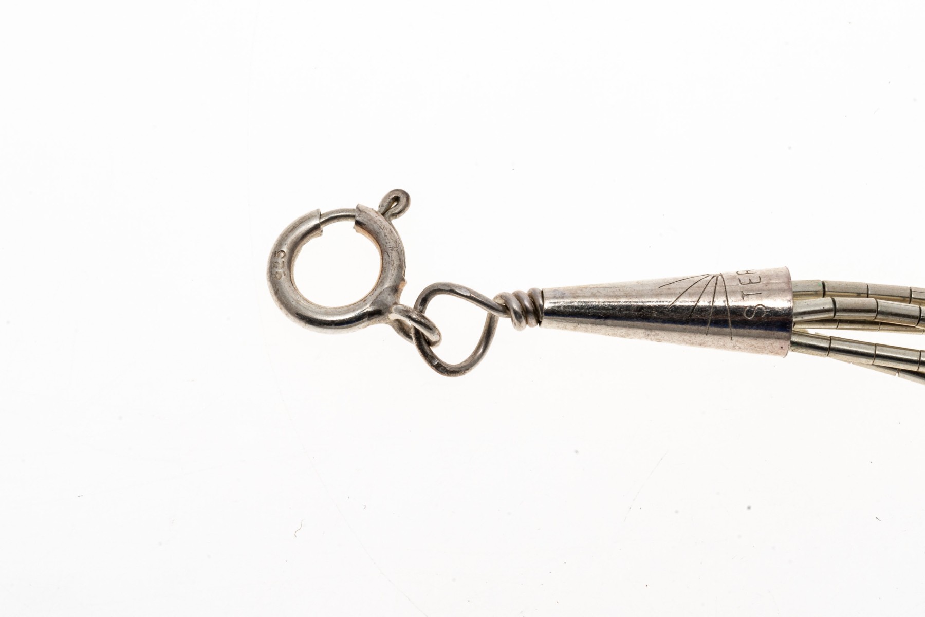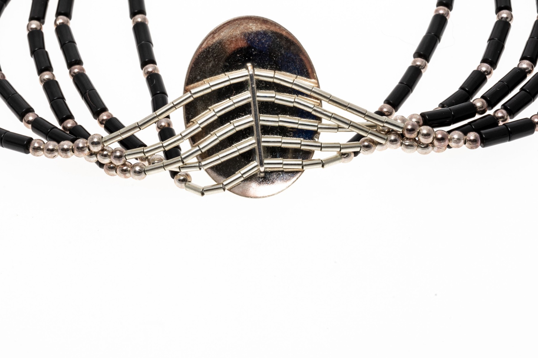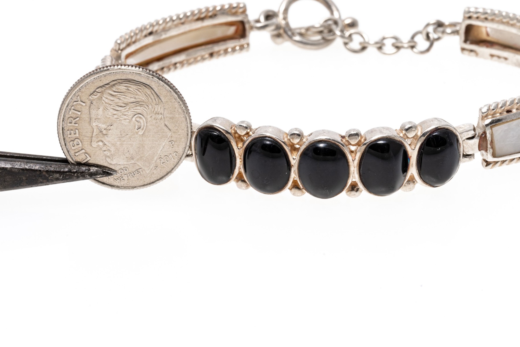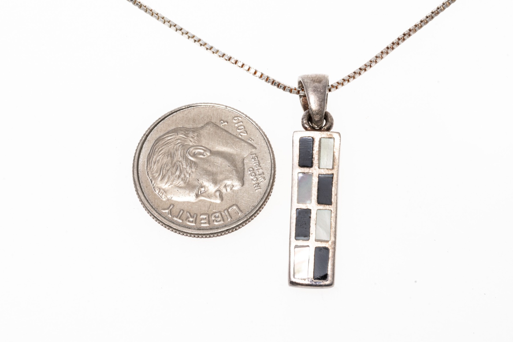 Collection of black onyx and mother of pearl jewelry. A multi-stranded necklace, pendant necklace, bracelet and two pendants.