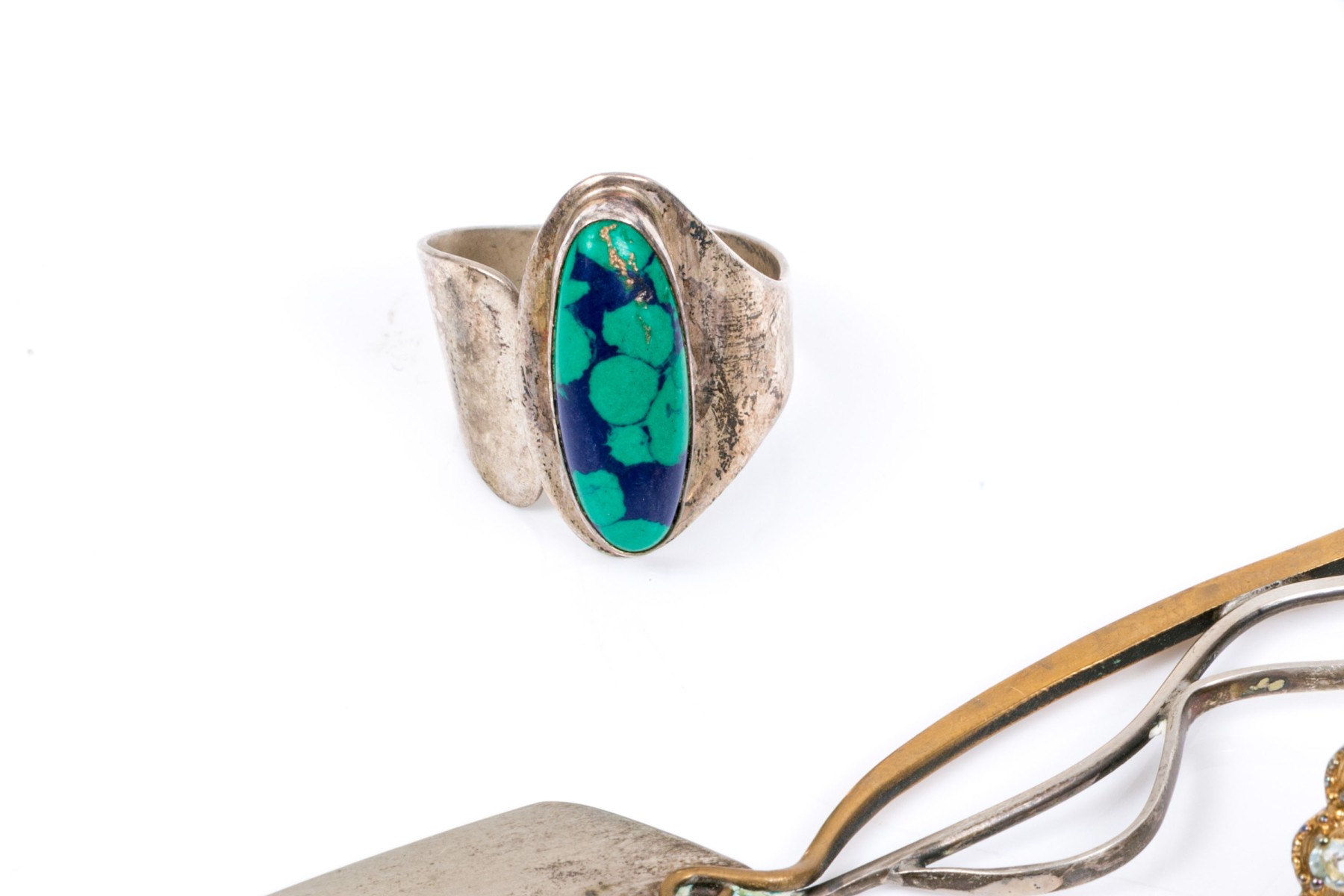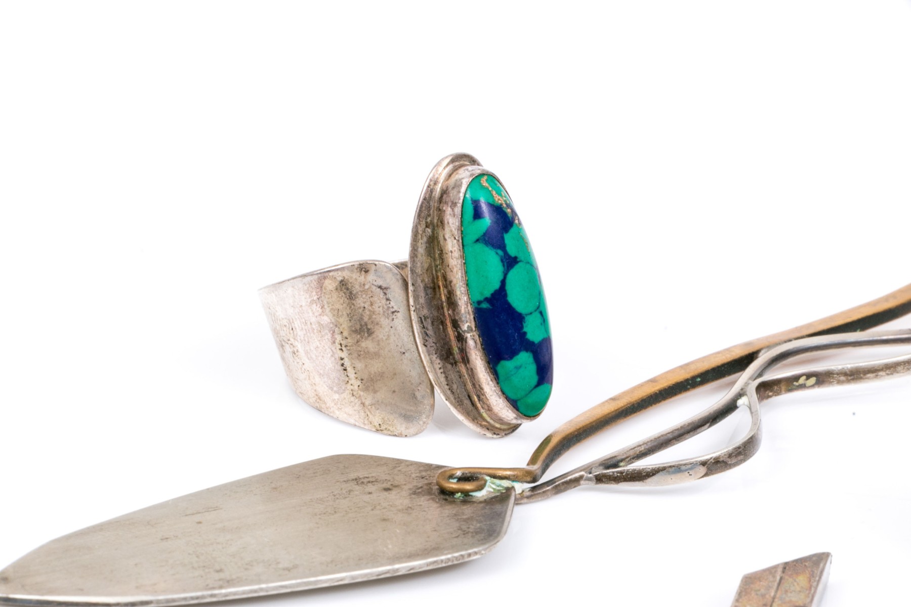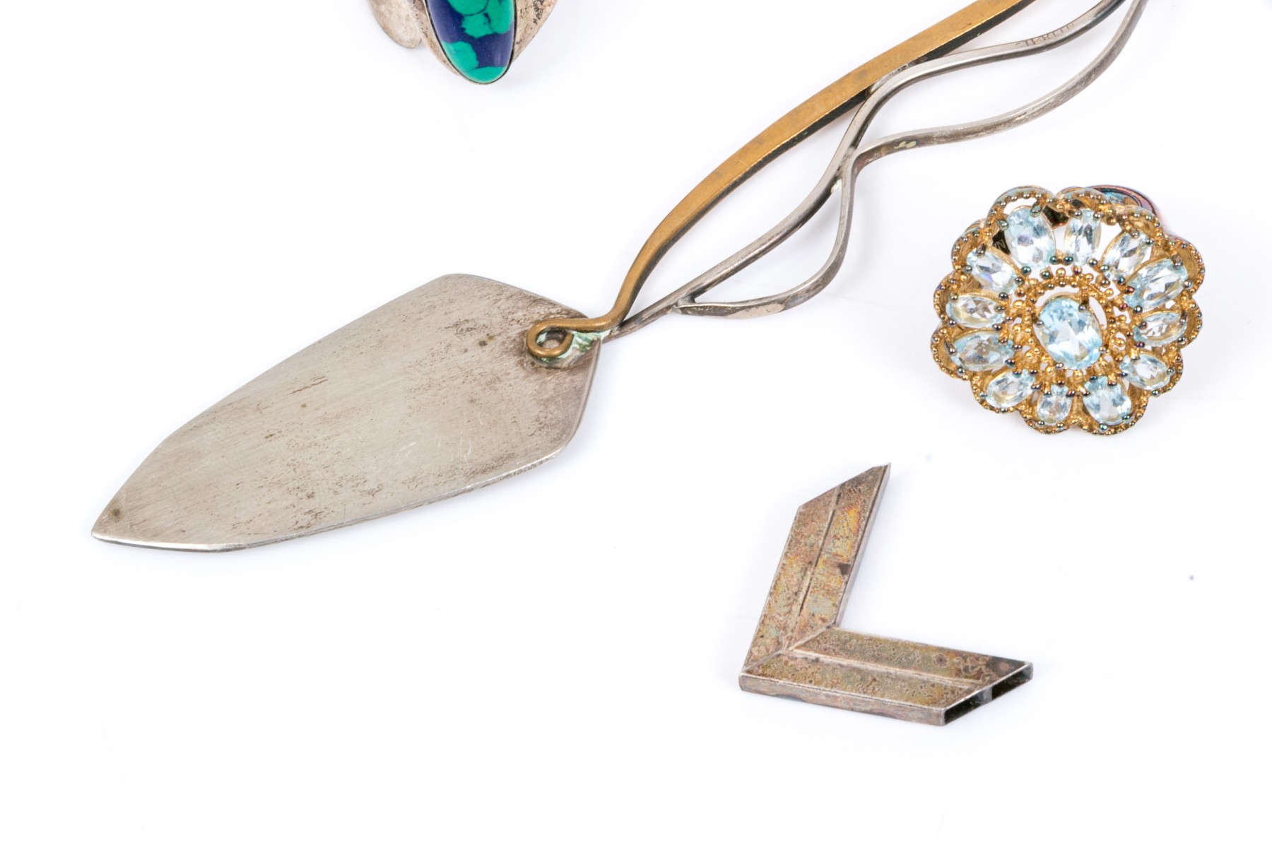 A group of sterling silver. Two rings a 'V' shaped pendant and a letter opener. Ring sizes approximately 6 and 10