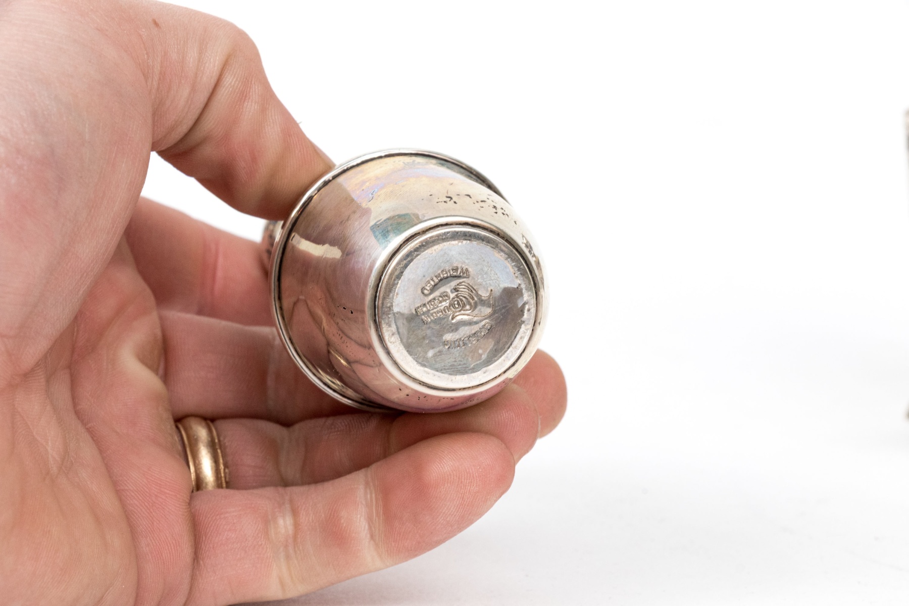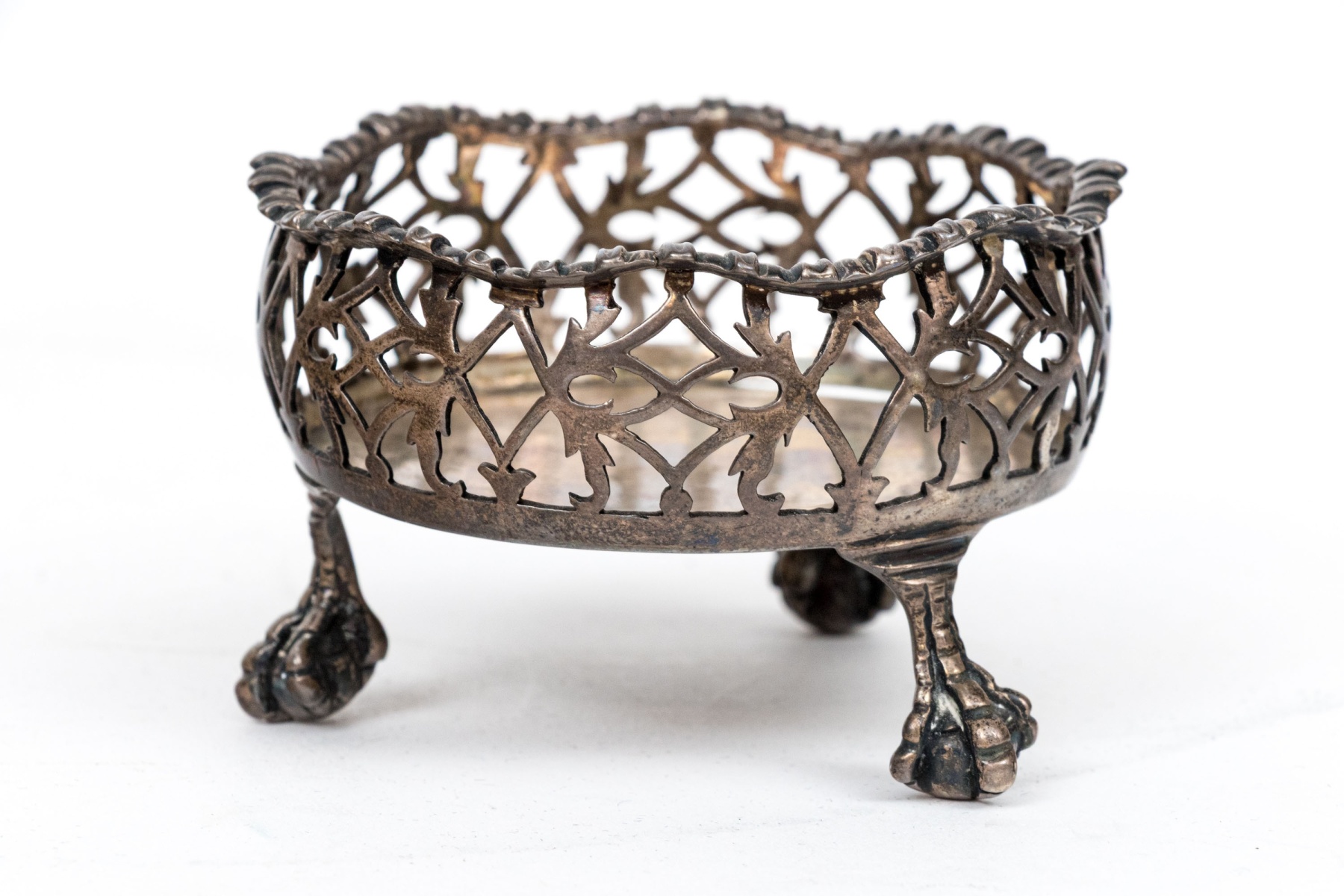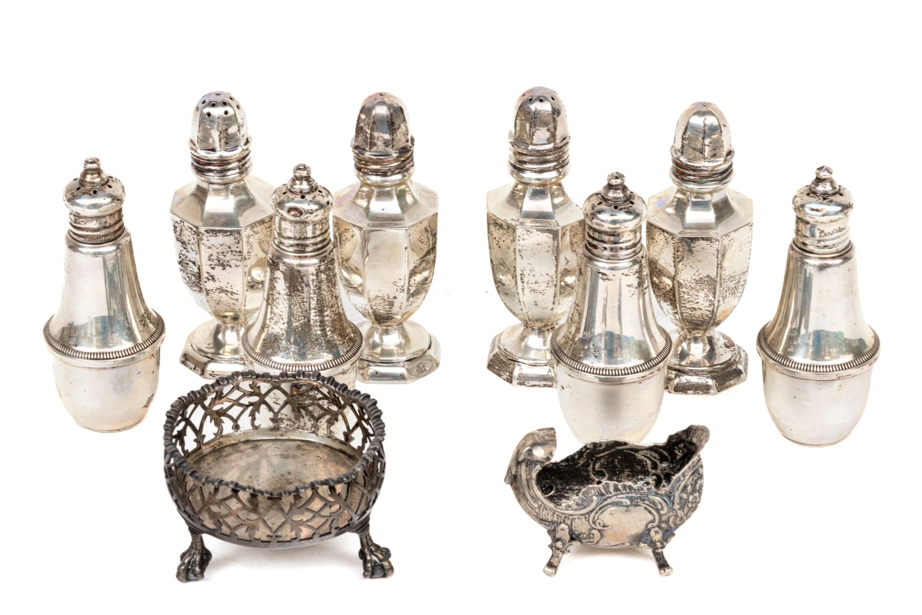 together with four sterling footed casters with lids, a footed bowl with openwork body, likely missing its liner, and a small footed salt cellar in shell form.