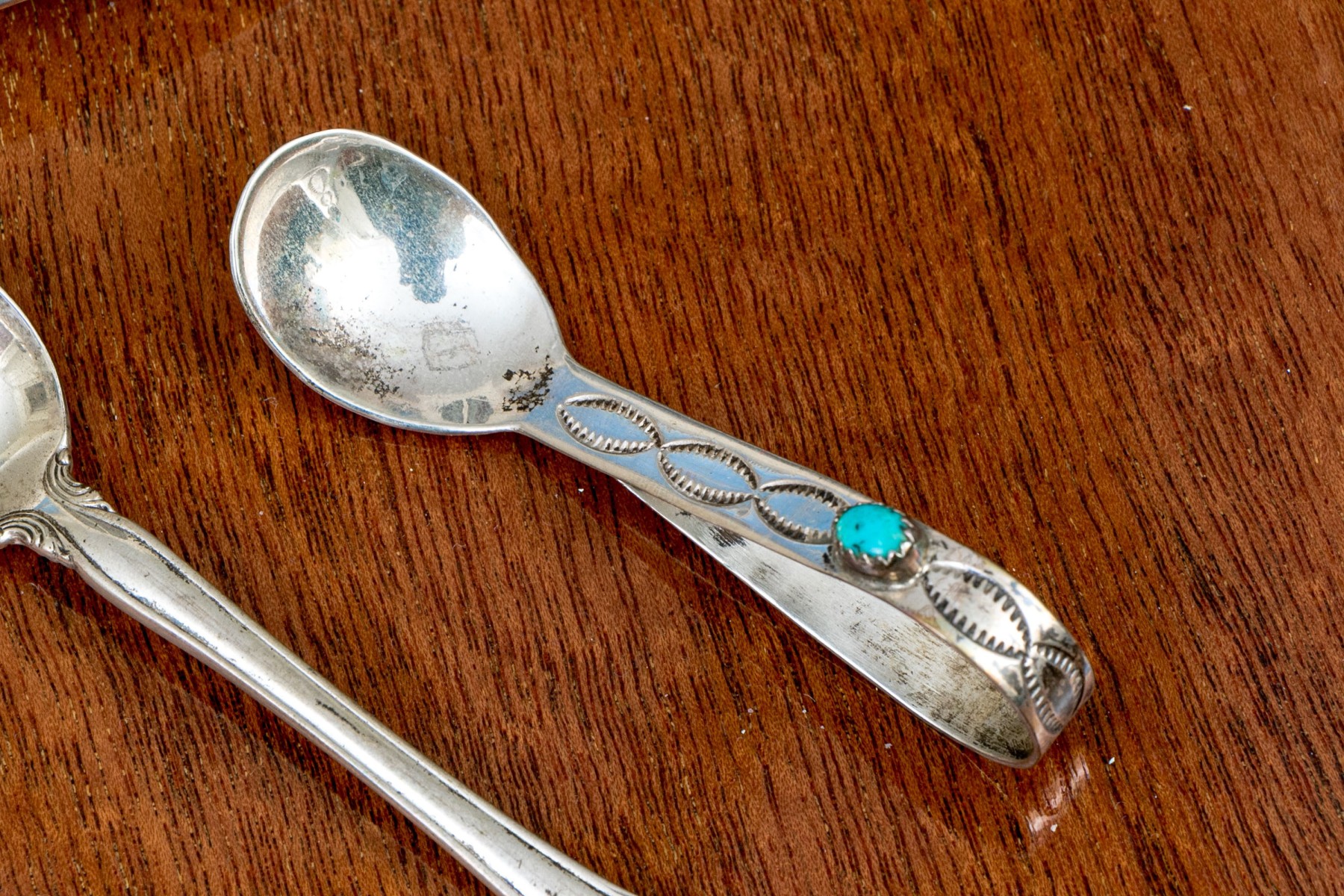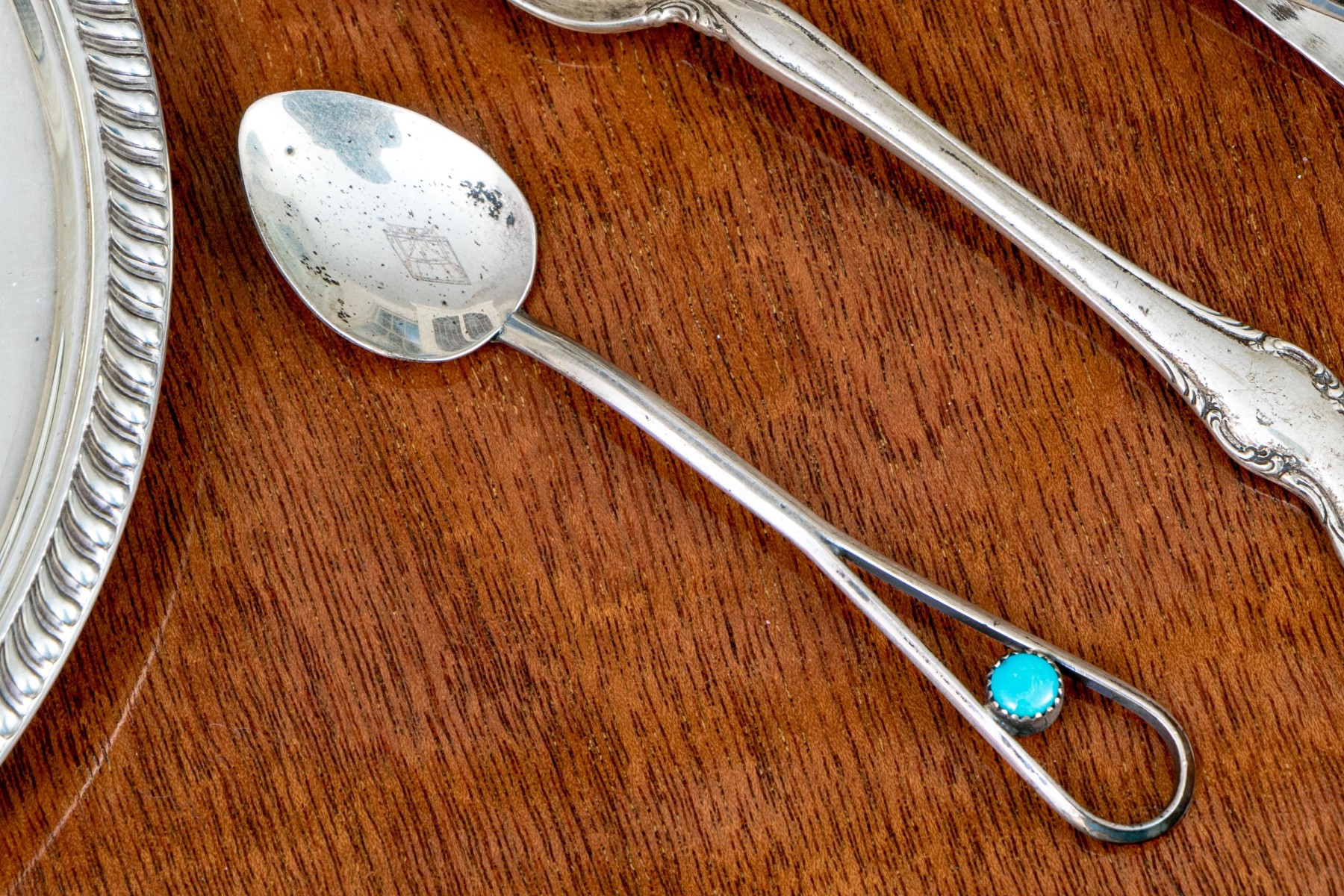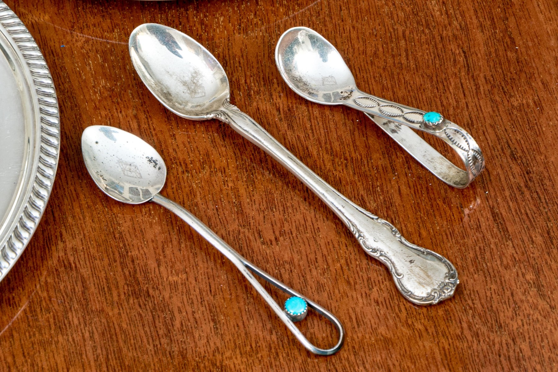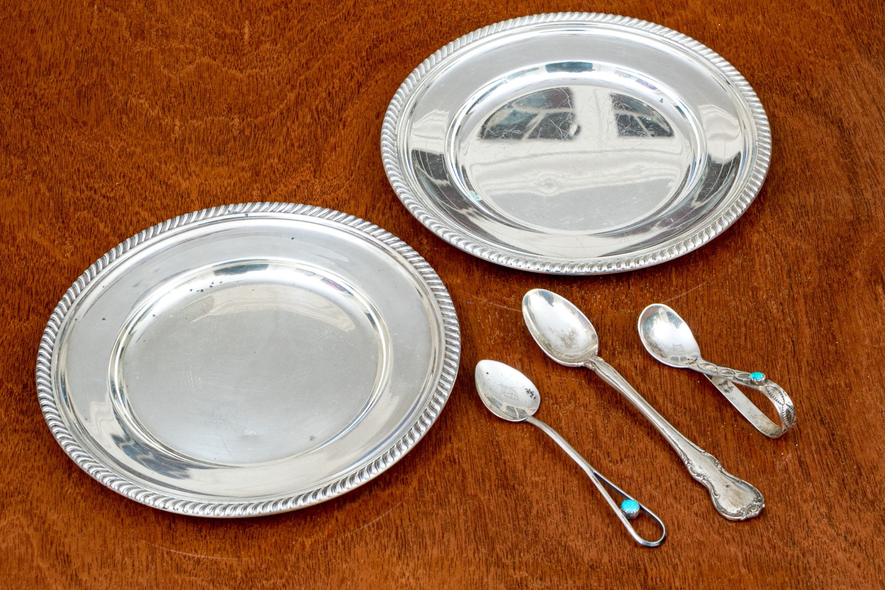Comprised of a pair of Gorham sterling bread and butter plates with decorative rims, together with two Navajo serving spoons with a Sterling demitasse spoon.
