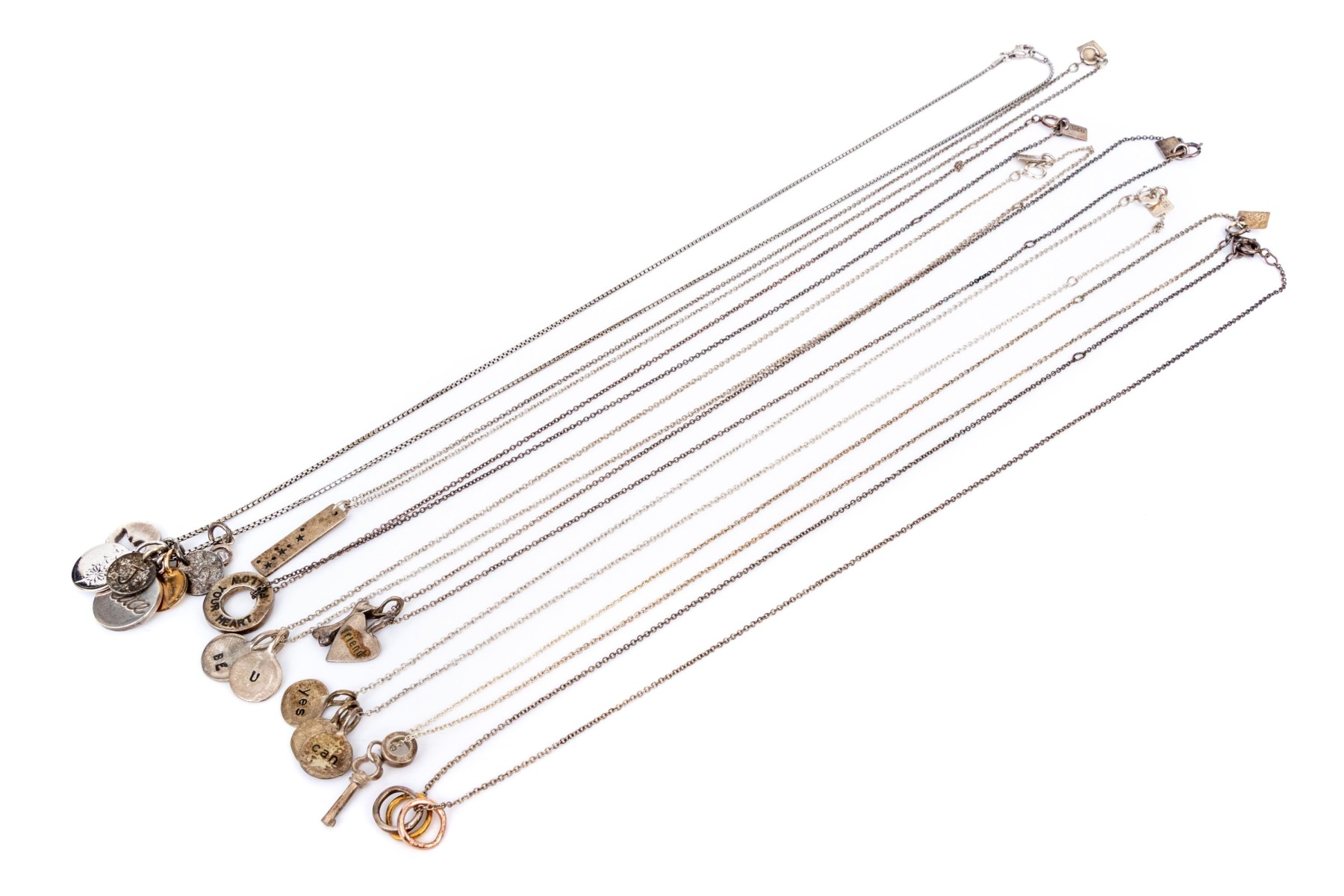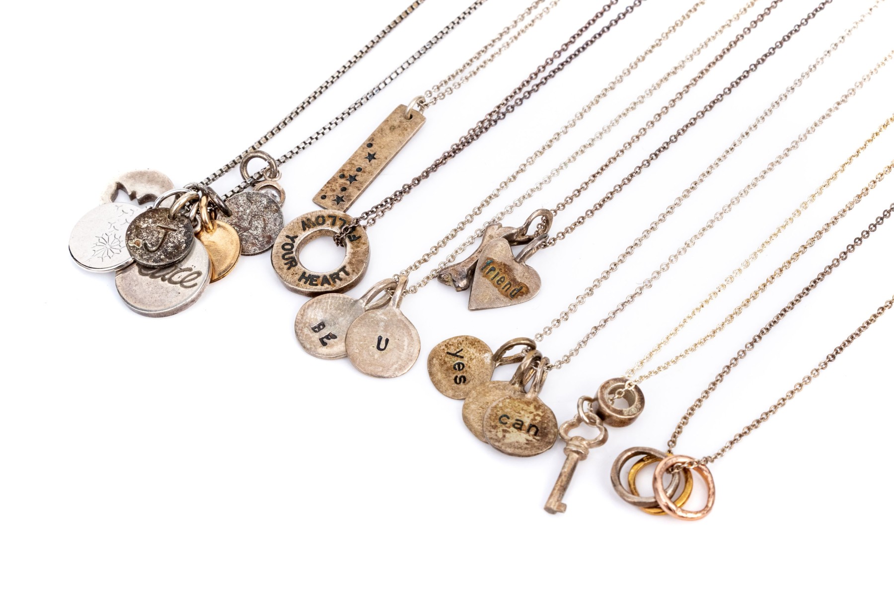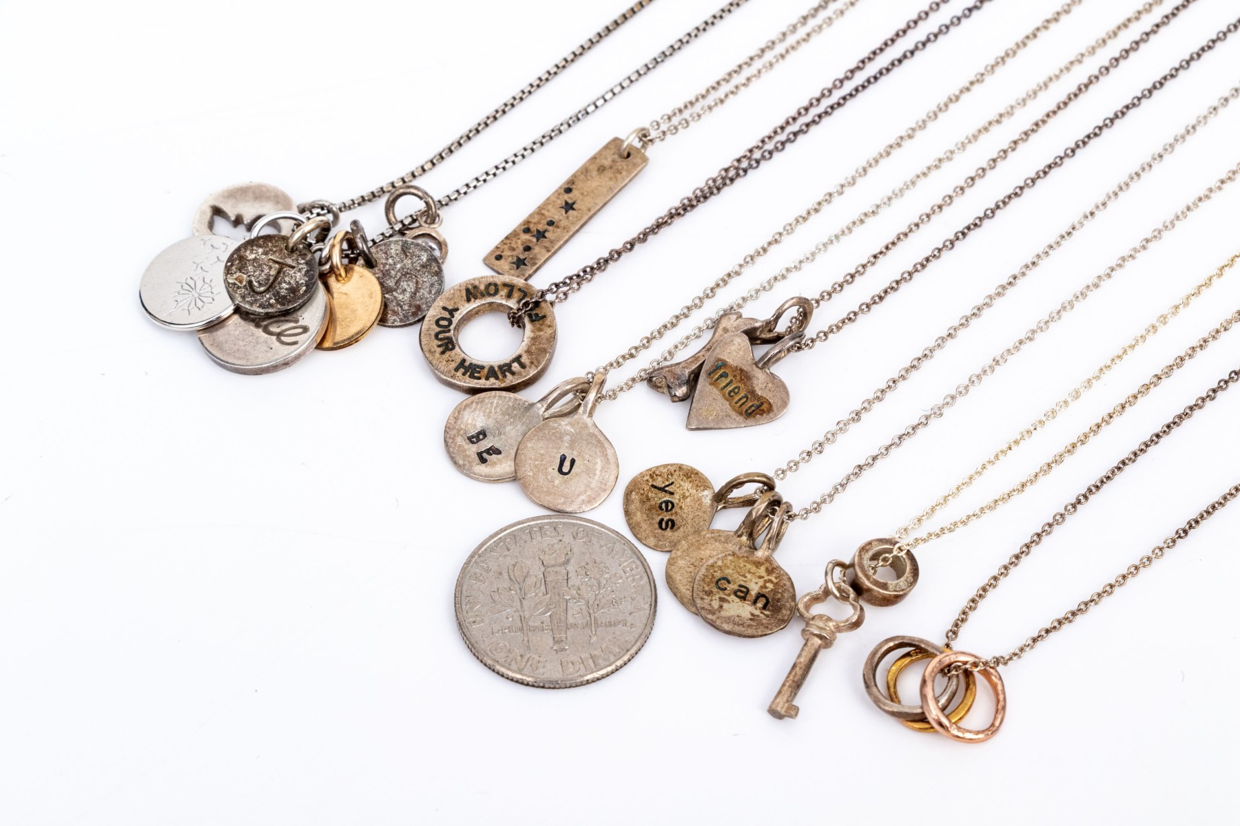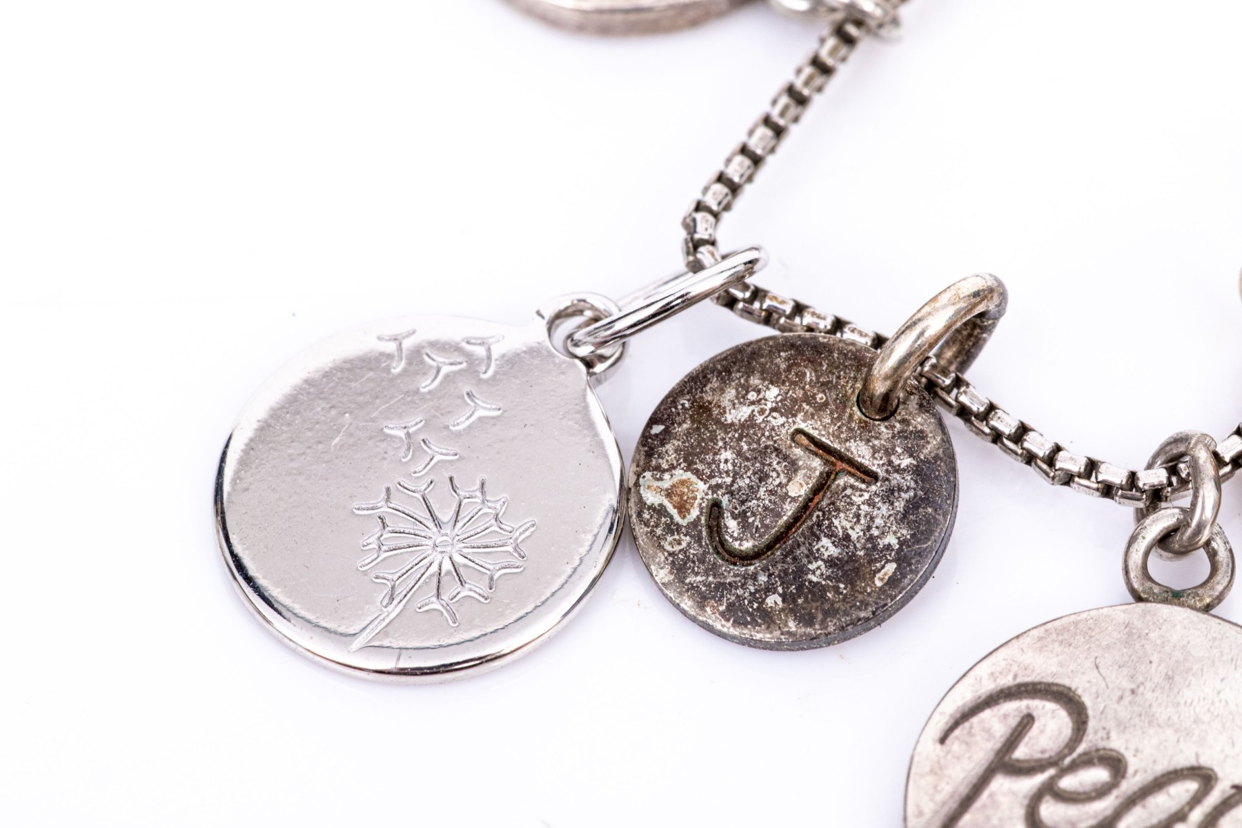 Collection of sterling silver inspirational message charms and pendants, including be u, peace, friend, on chain, and finished with spring ring and lobster claw style clasps
