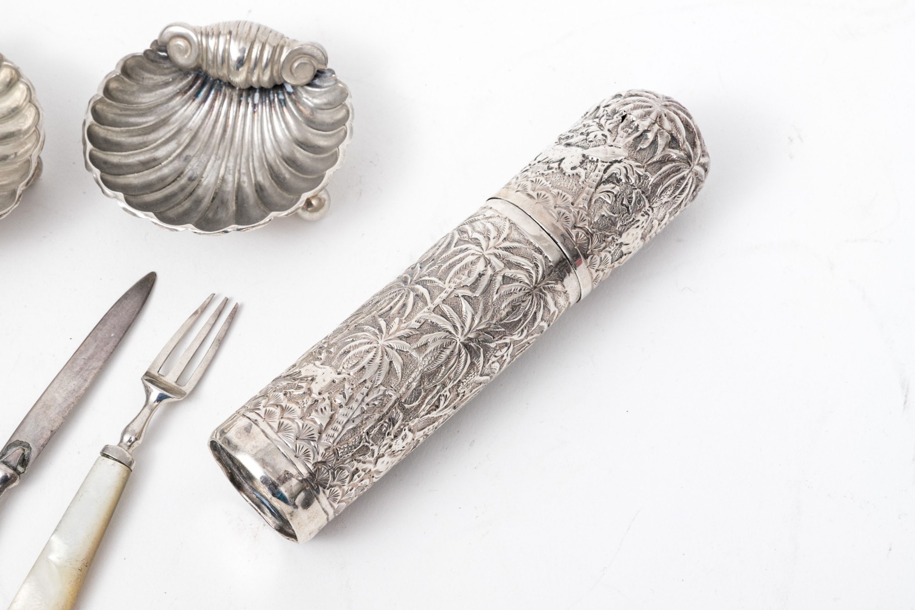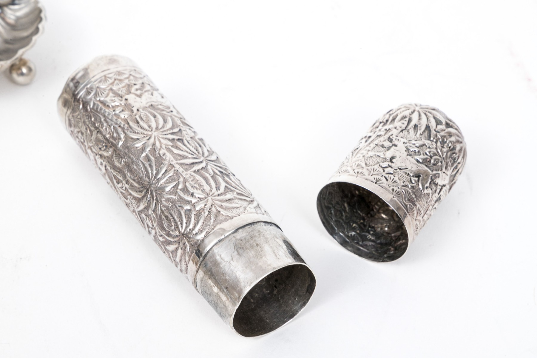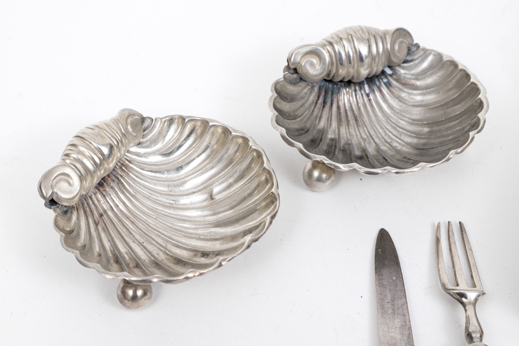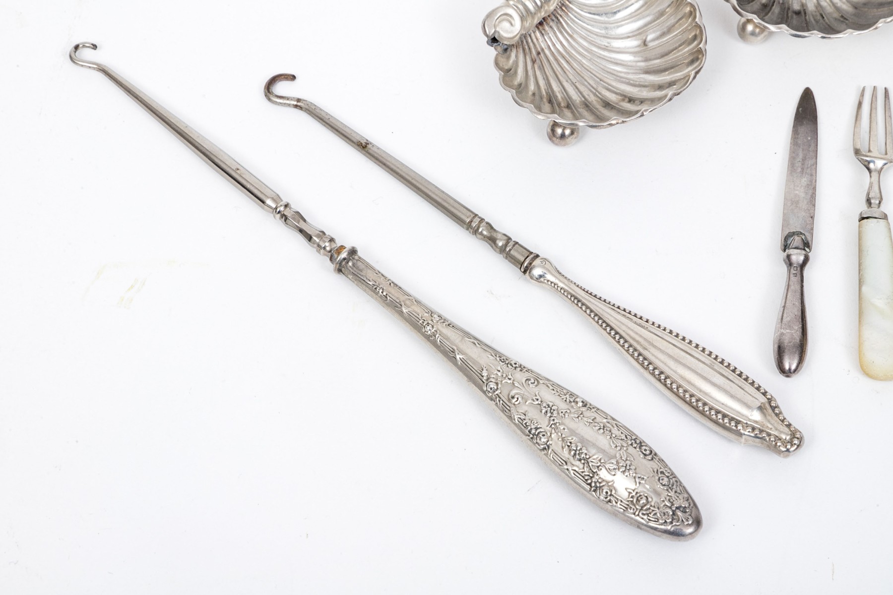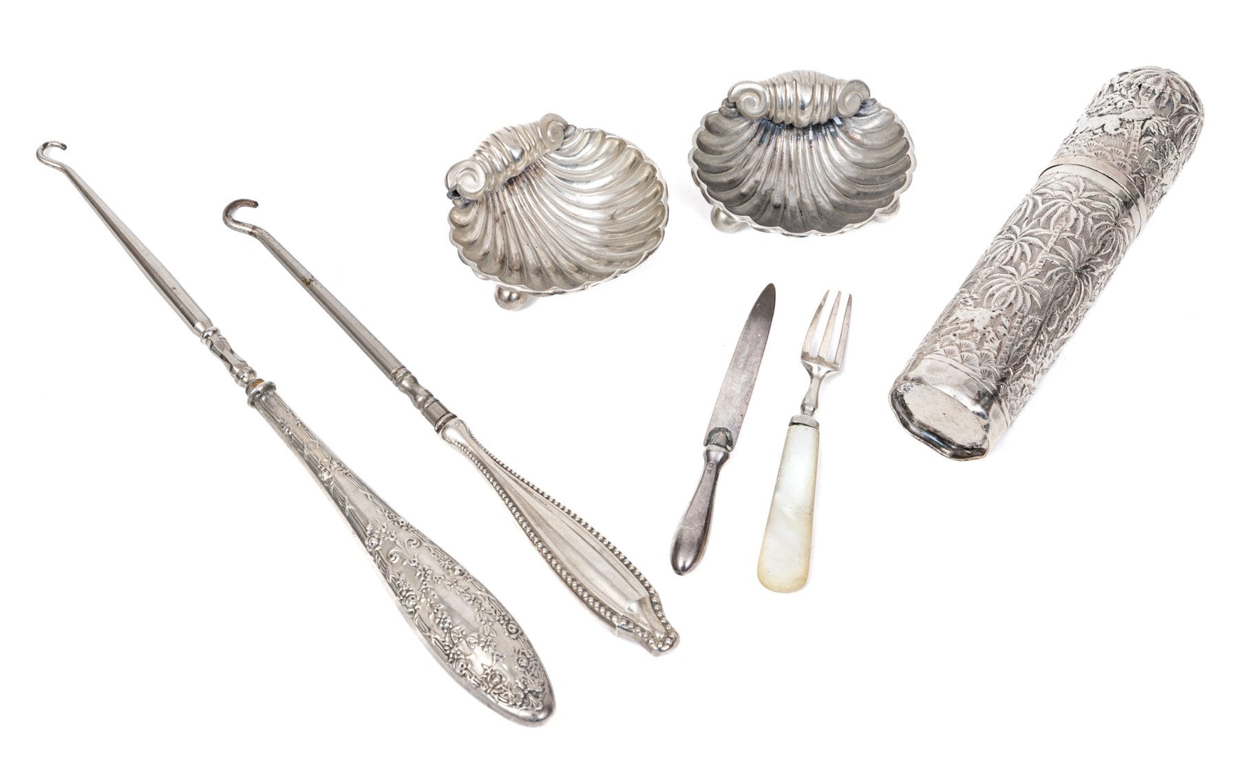 Collection of sterling silver items including hooks, pin case and salt dishes.