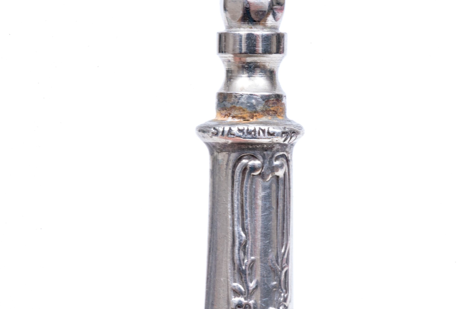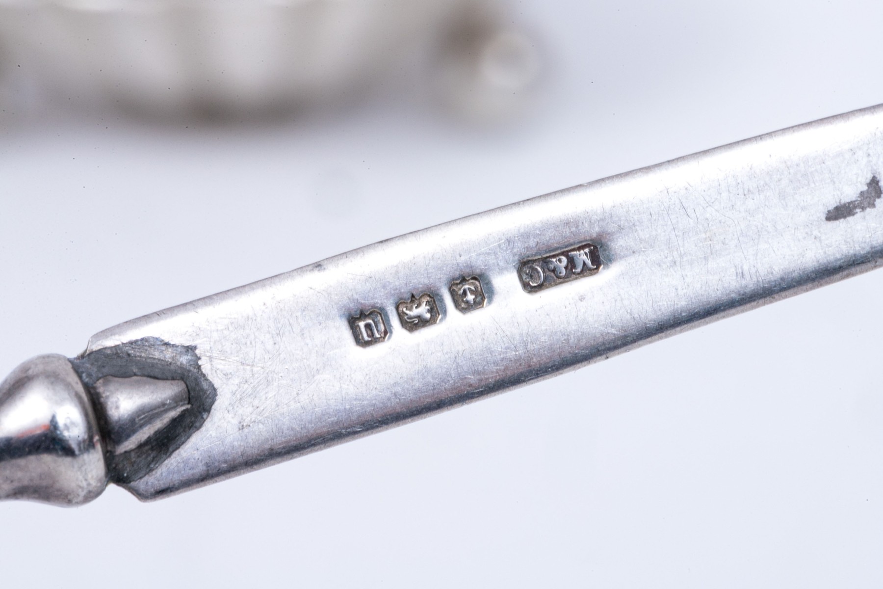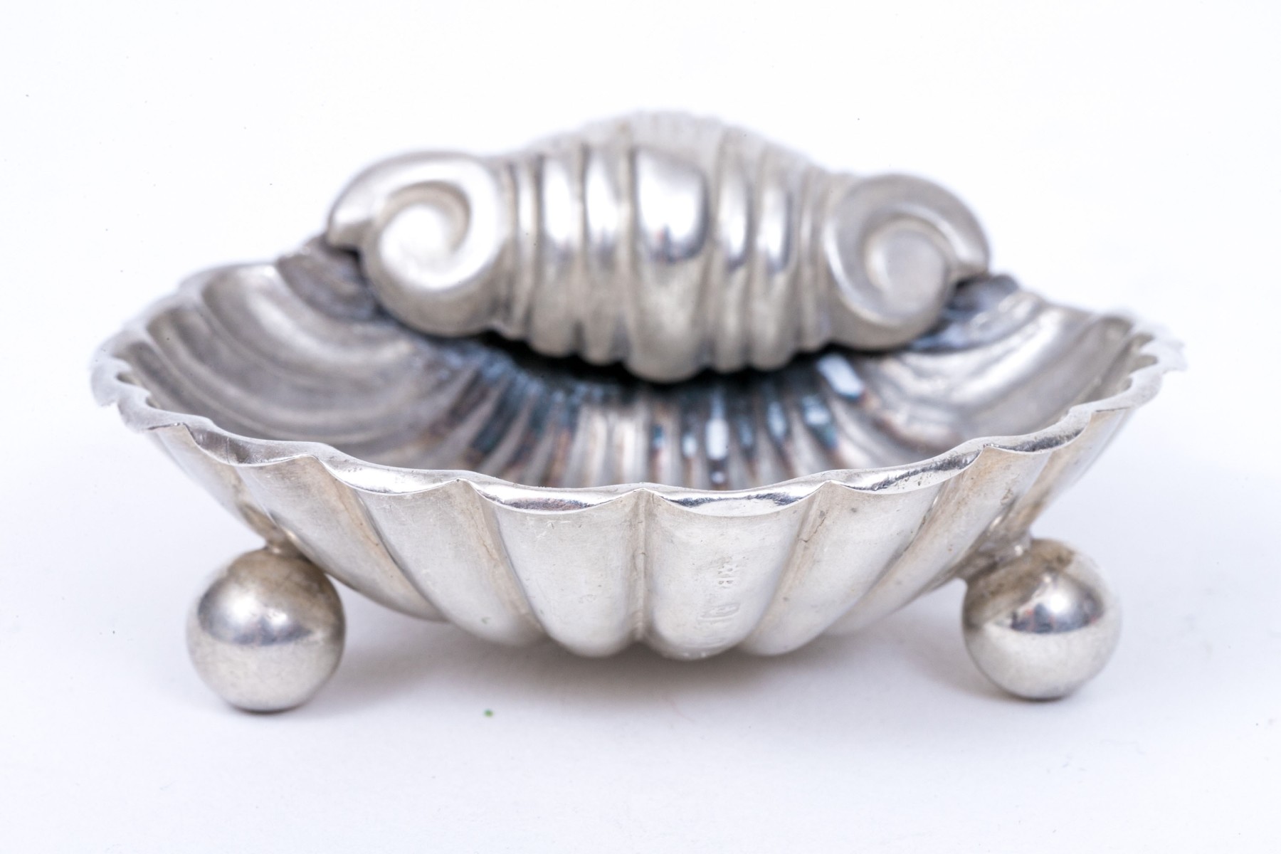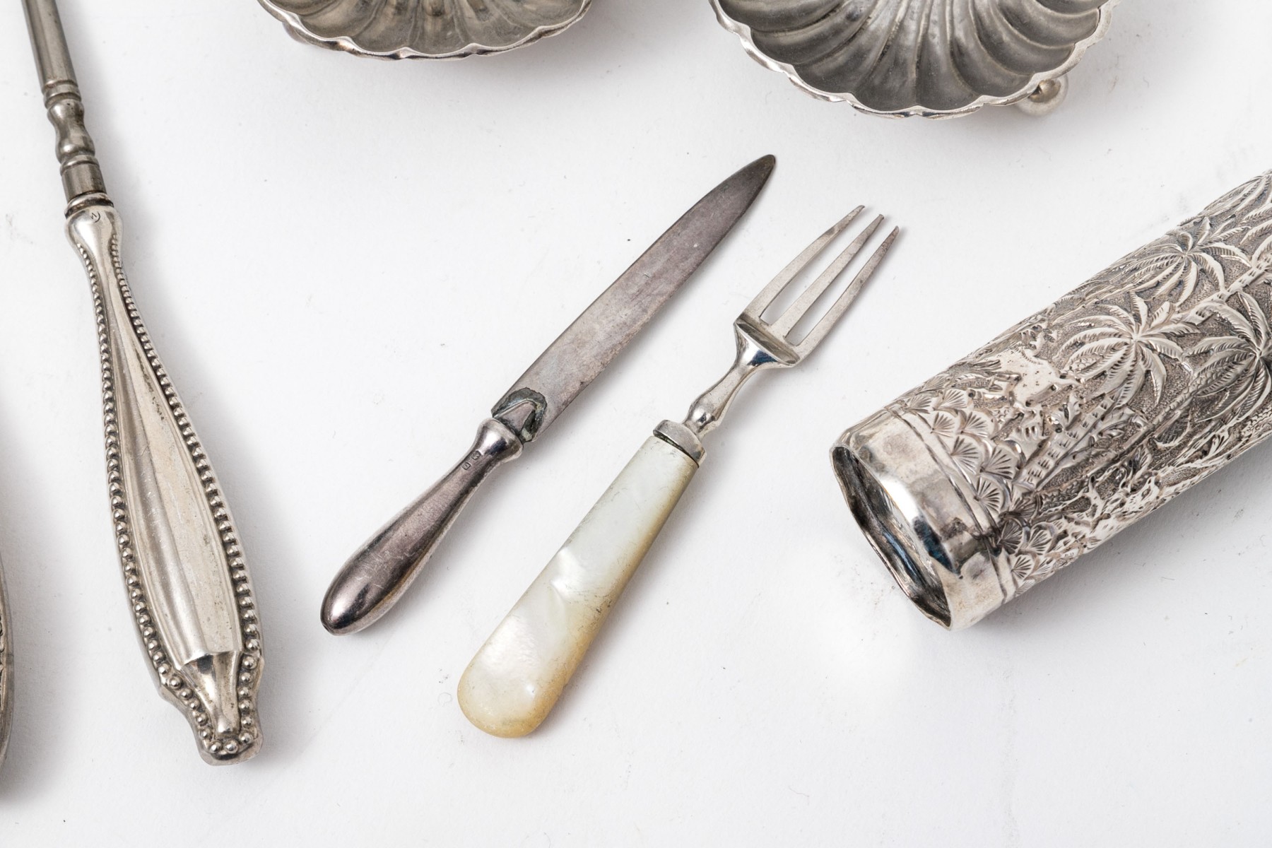 Collection of sterling silver items including hooks, pin case and salt dishes.