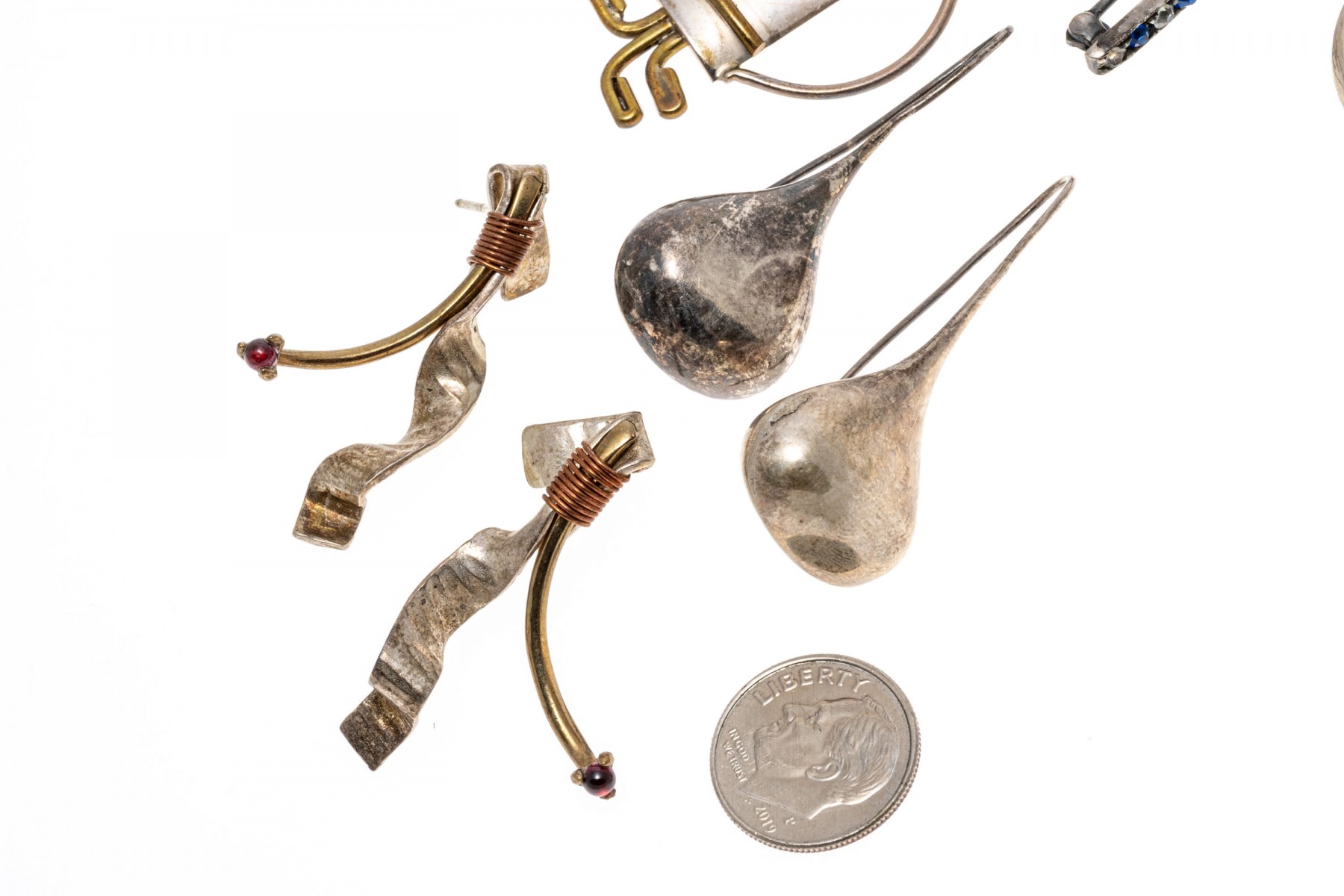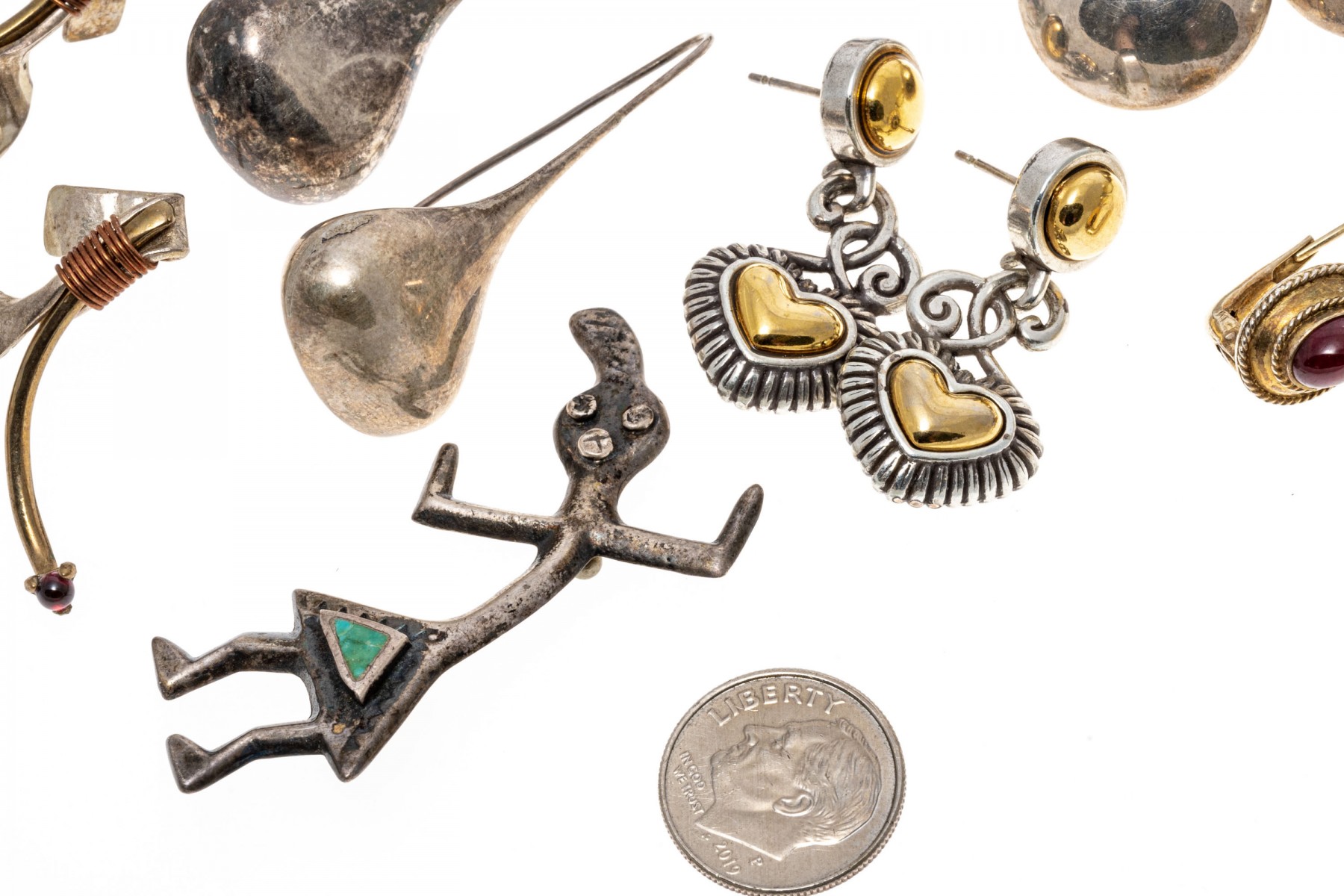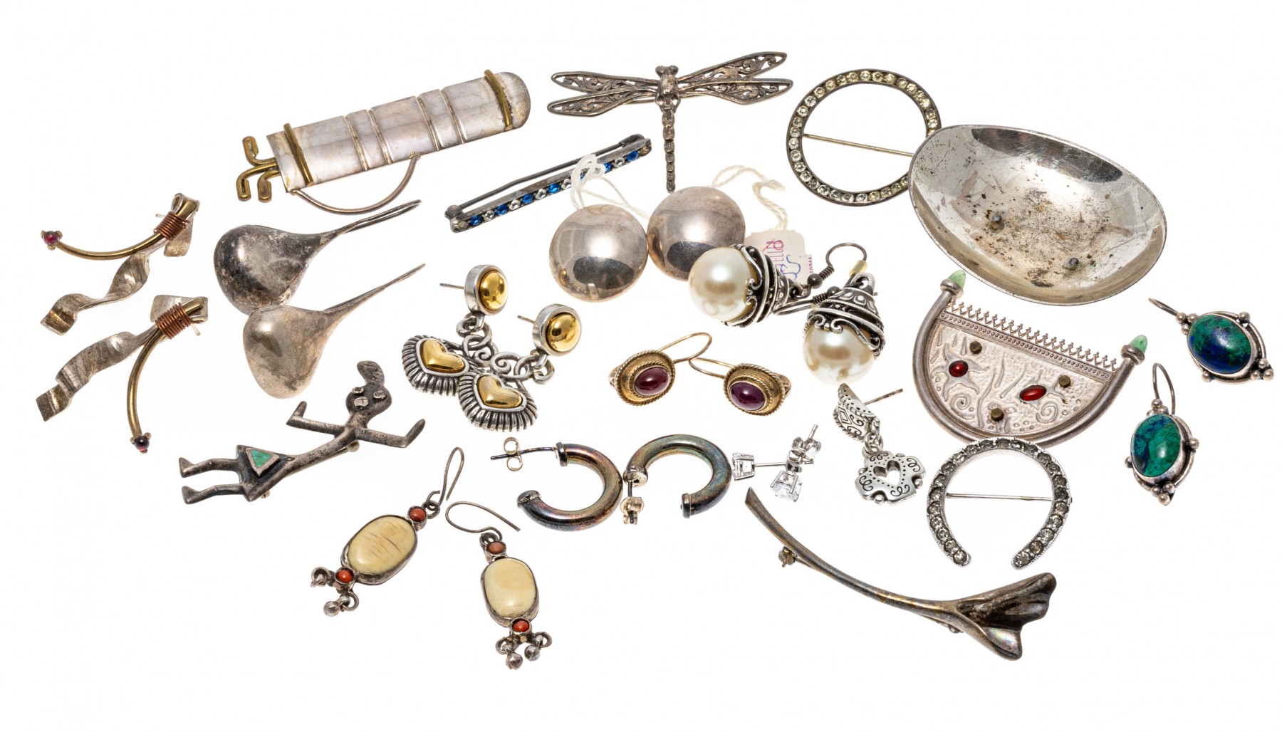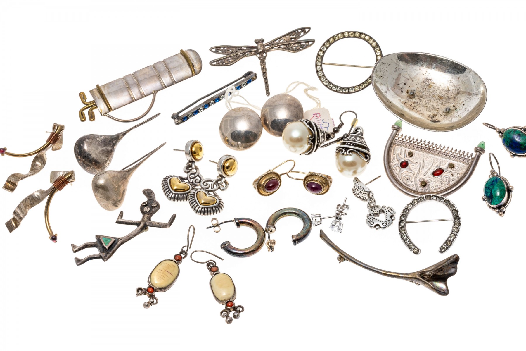 Condition: Tarnishing, bends and wear. Earring pairs and backings missing. Some pieces broken and/or missing parts.
