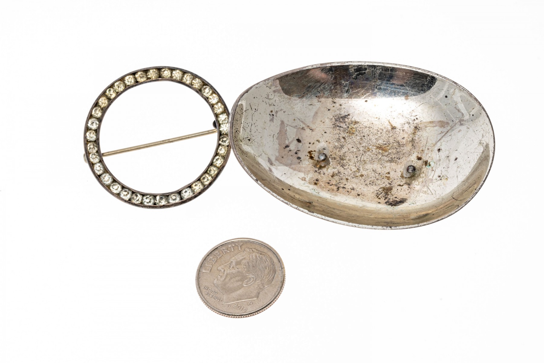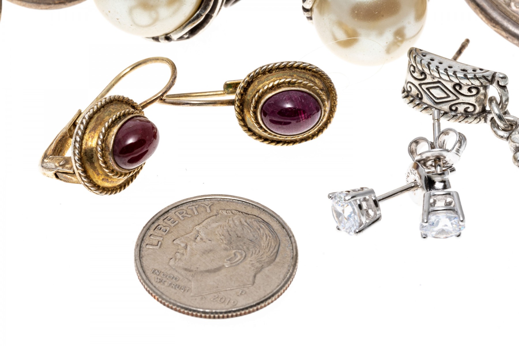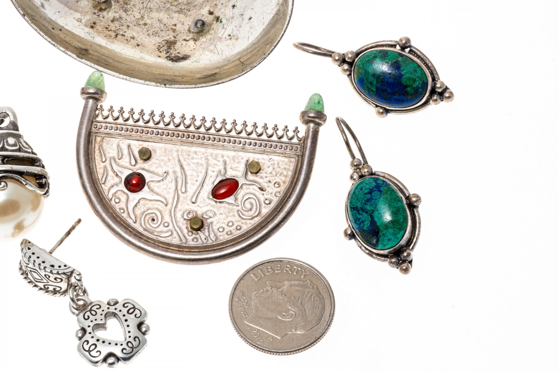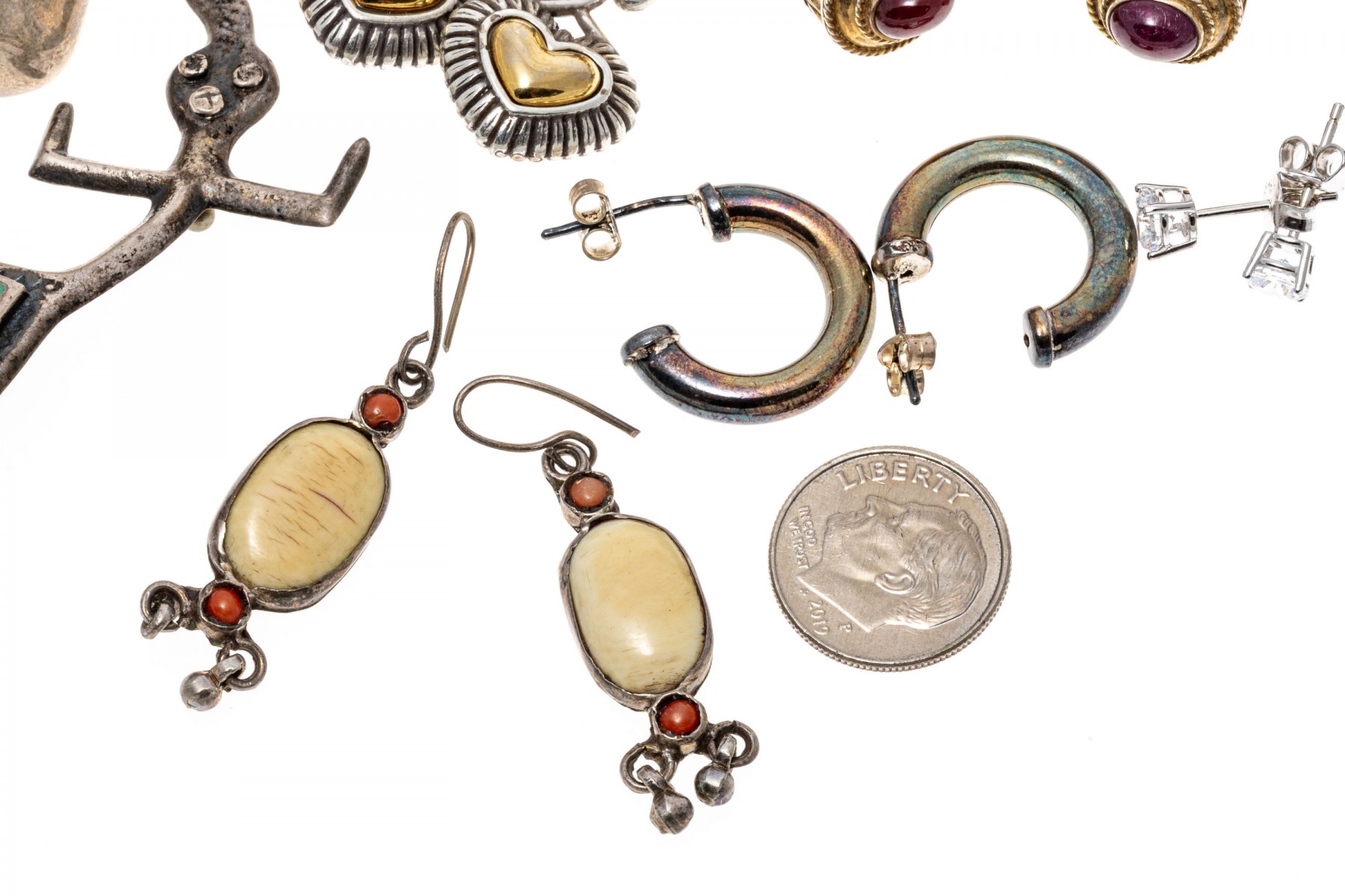 Condition: Tarnishing, bends and wear. Earring pairs and backings missing. Some pieces broken and/or missing parts.