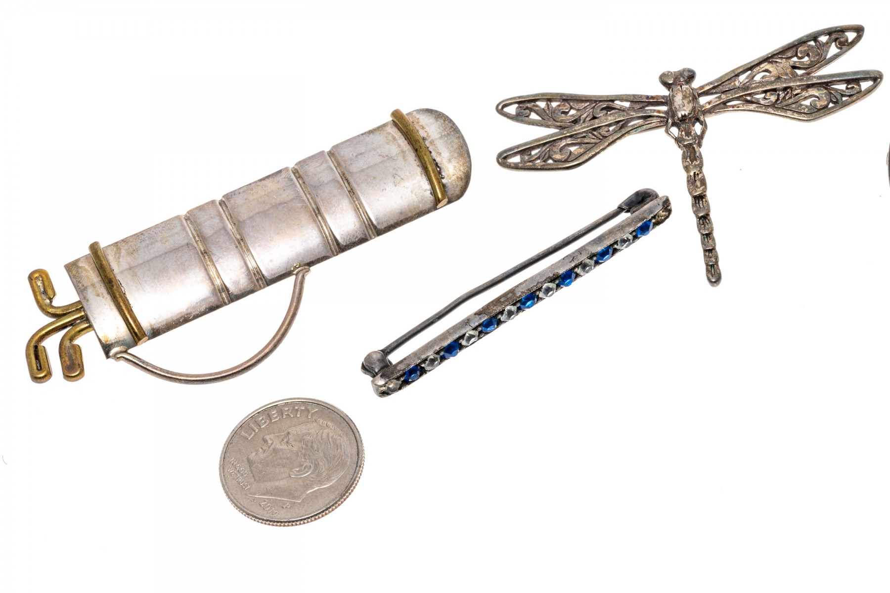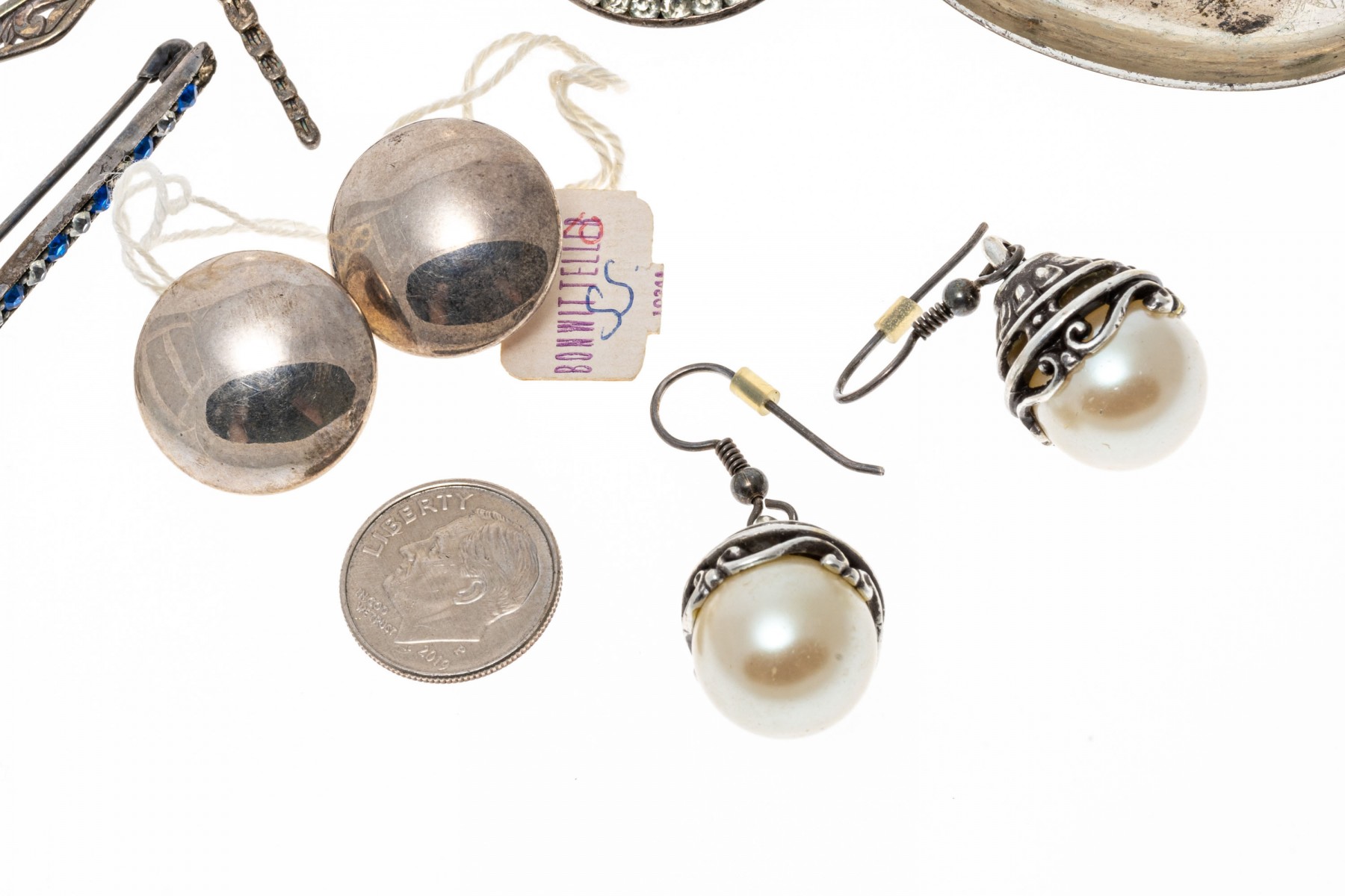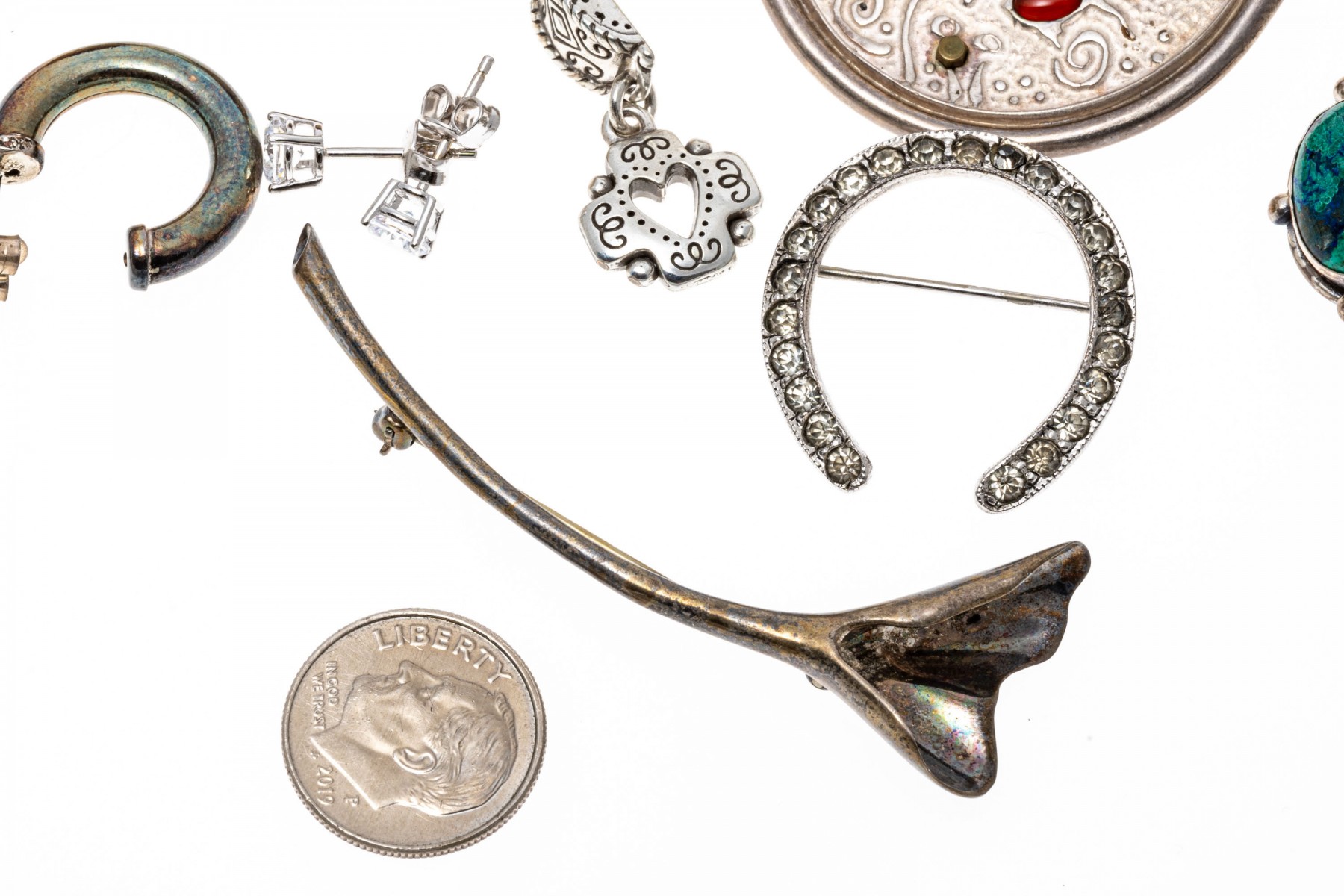 Collection of sterling silver jewelry, including brooches and earrings.