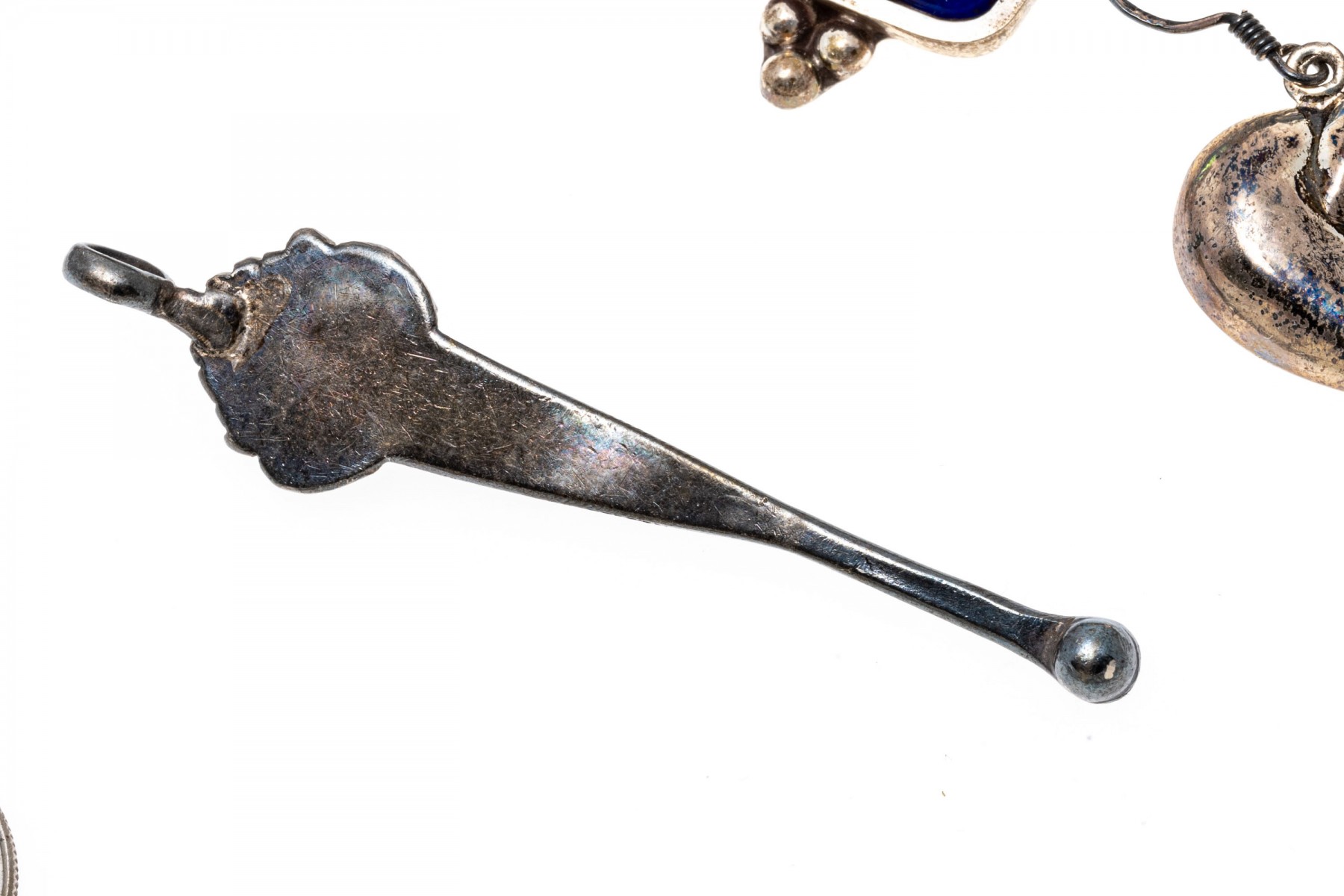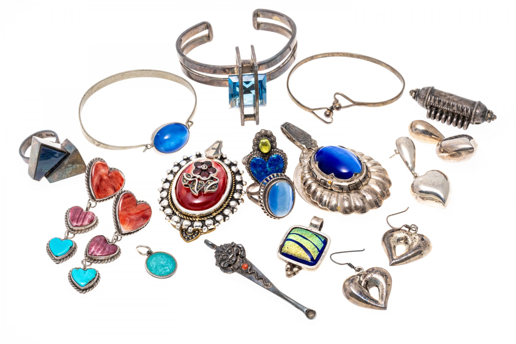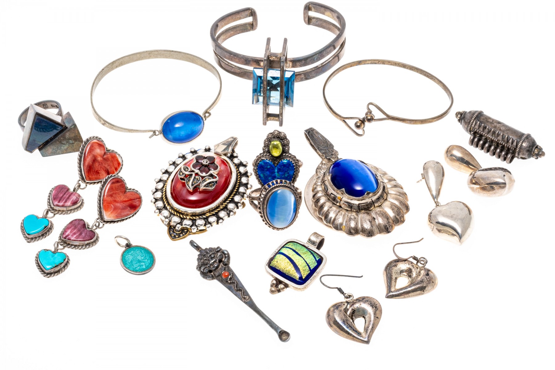 Collection of sterling silver jewelry, including, bracelets, earrings, pendants and rings. With this lot is a sterling silver Tiffany & Company bypass style bracelet with heart ends and 14K hook clasp.