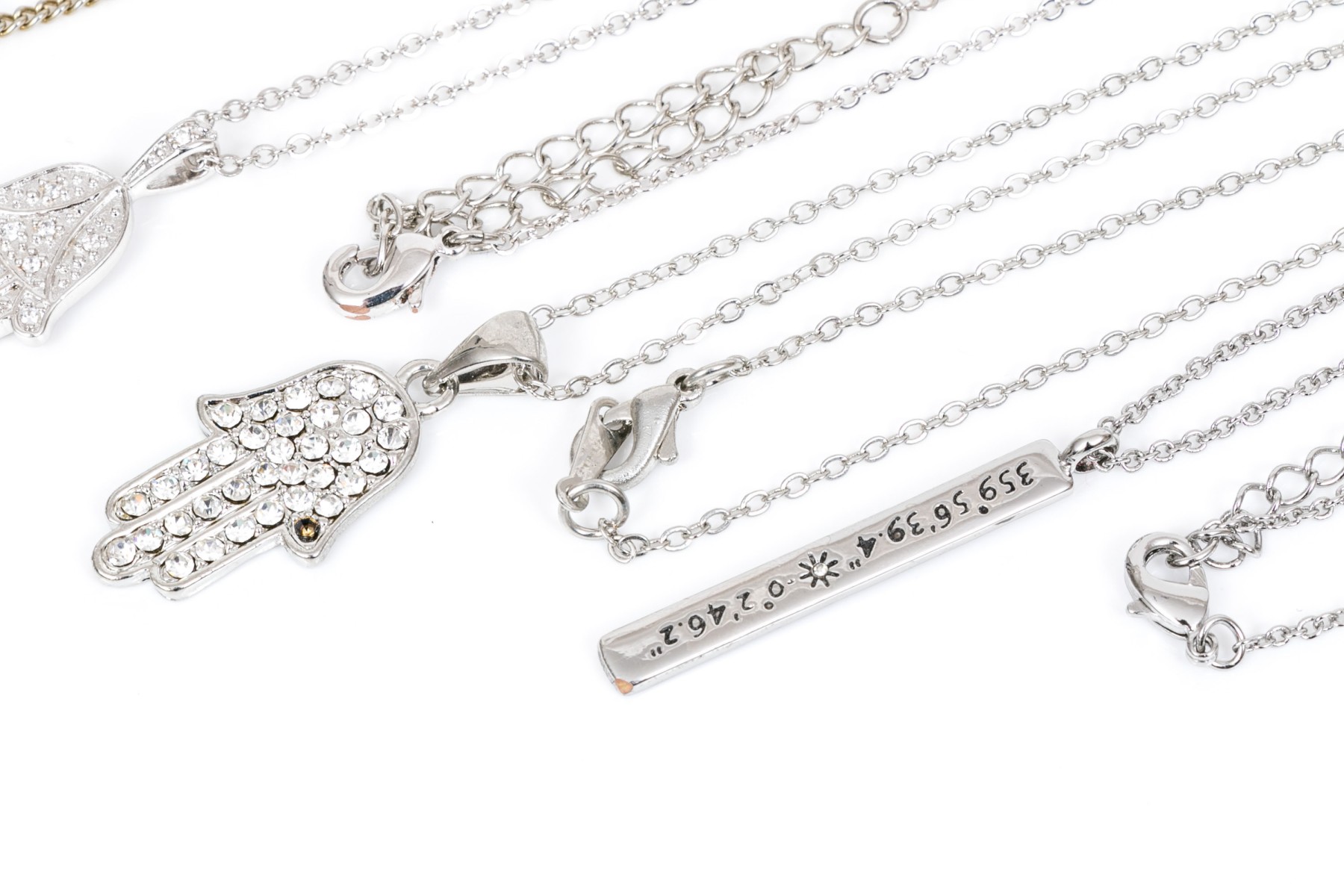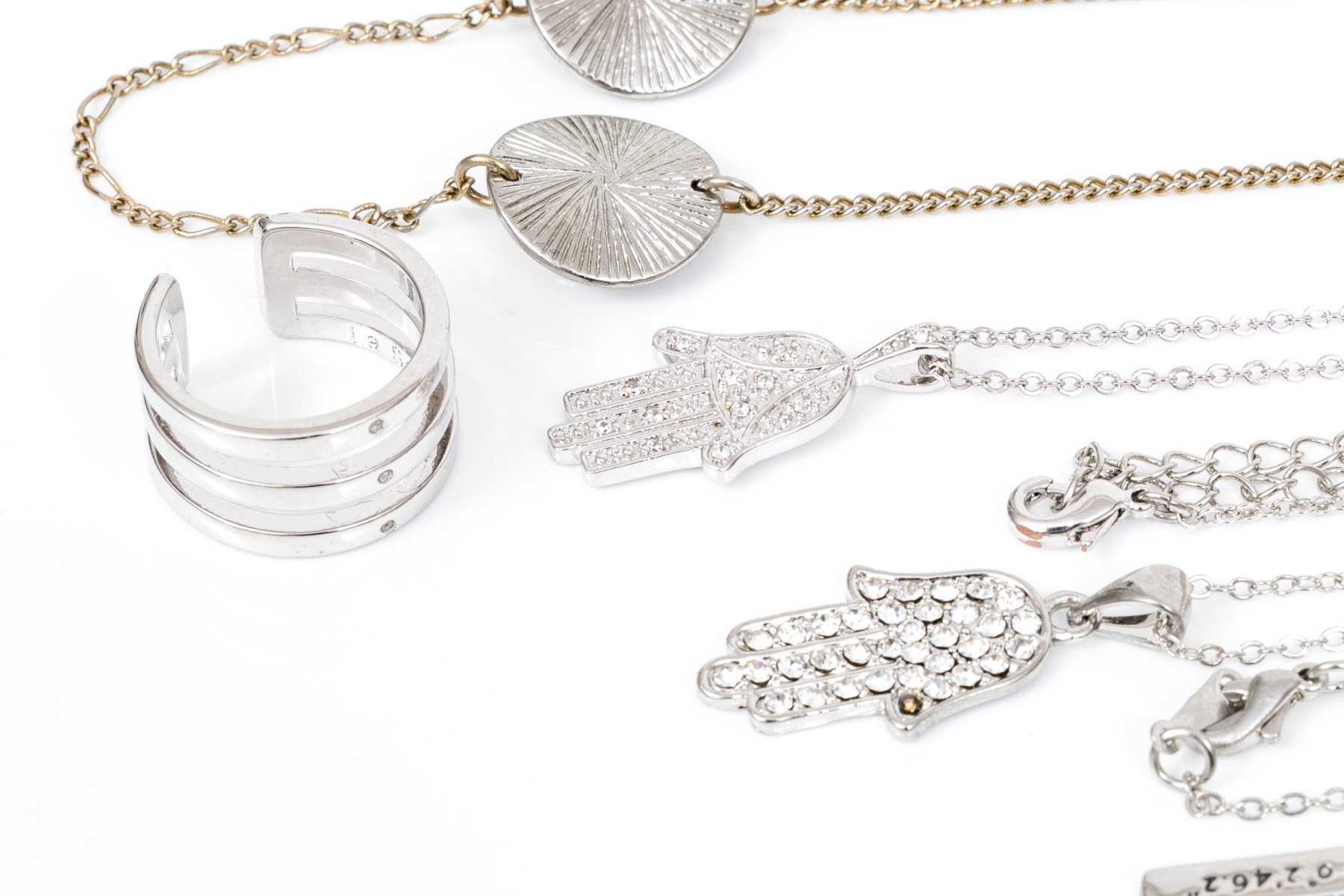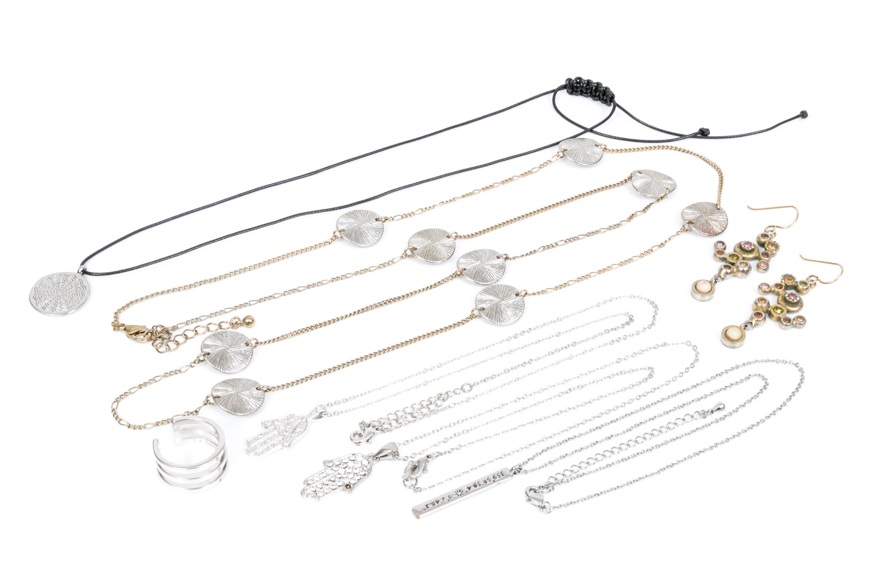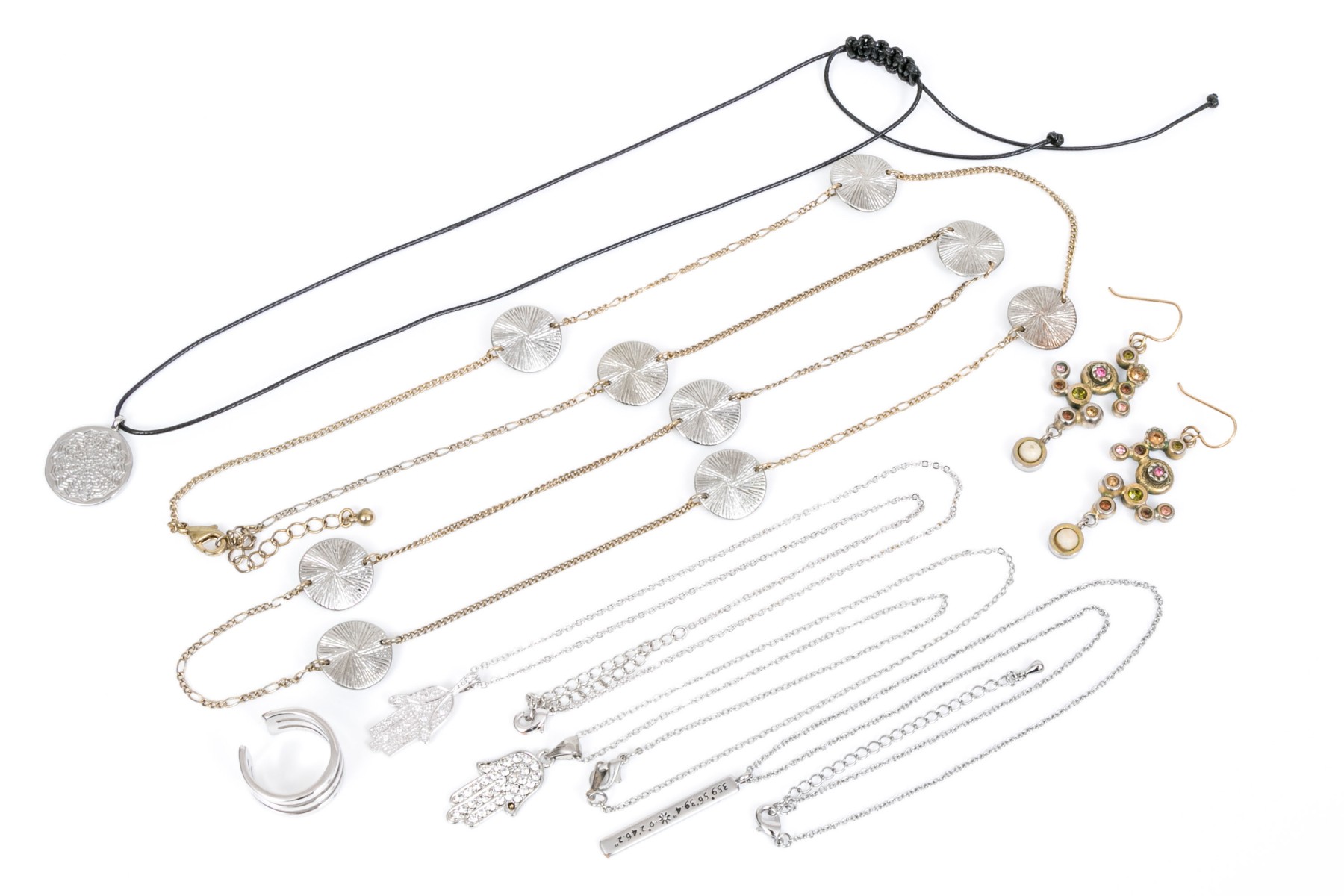 A collection of fashion jewelry. this collection includes necklaces, ring, bracelets and earrings.