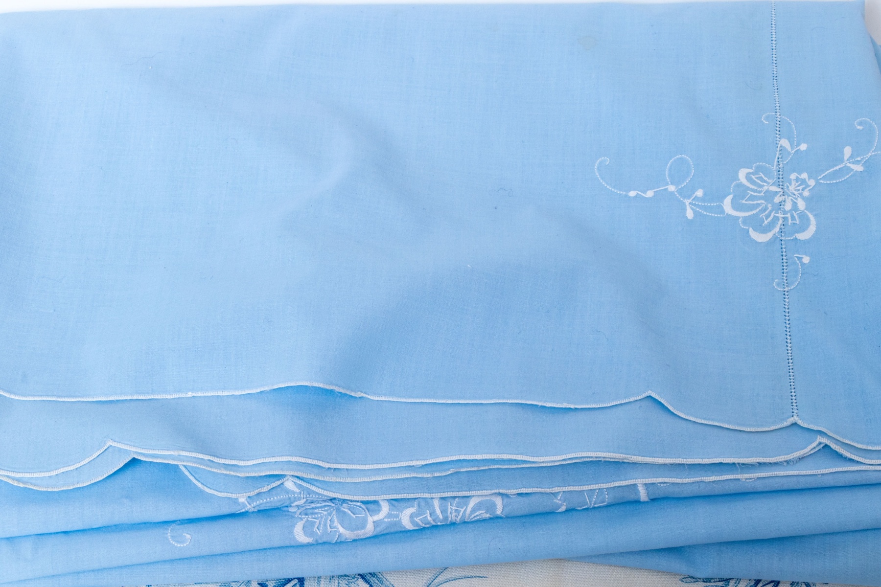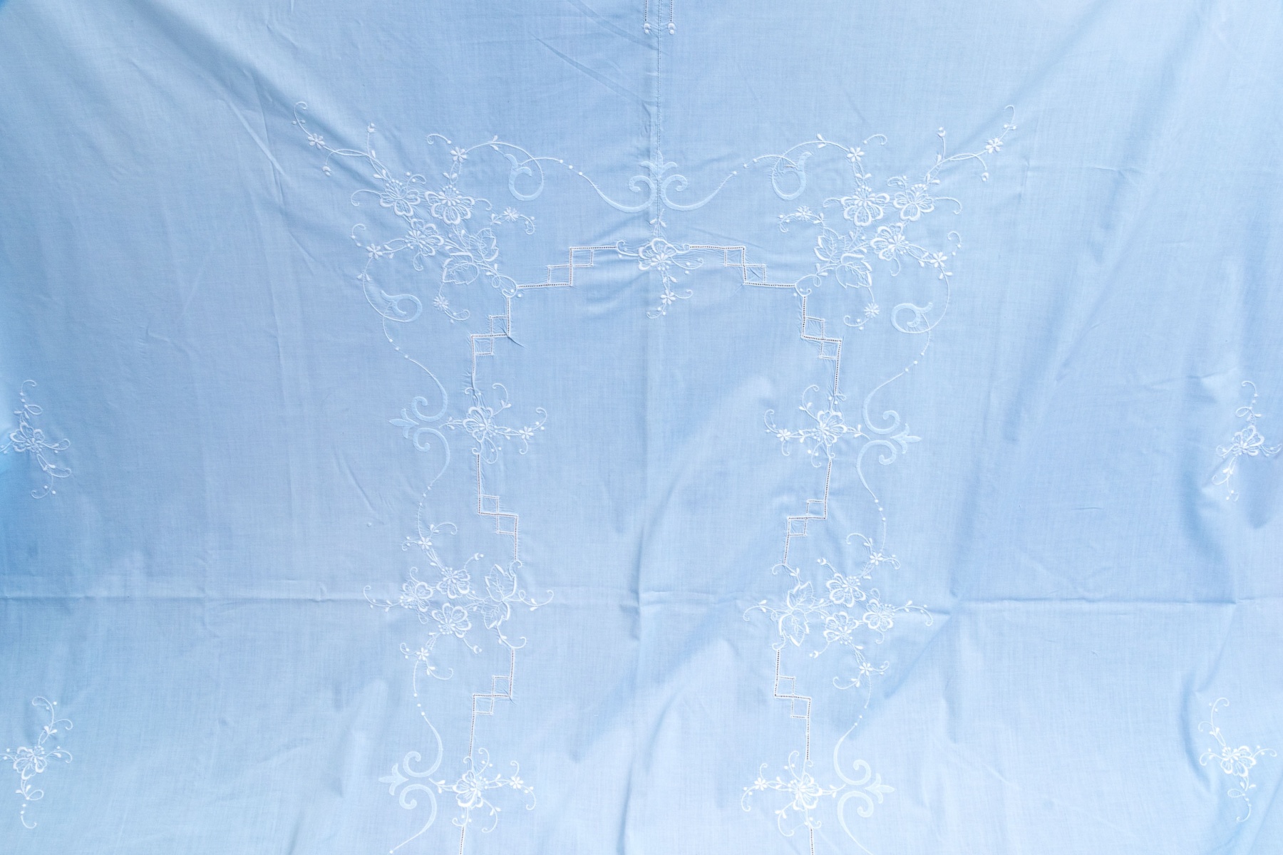 A beautiful blue and white embroidered tablecloth: 67" x 82 1/2"
