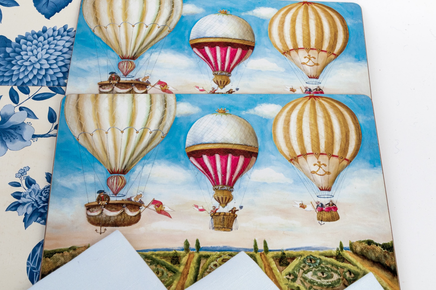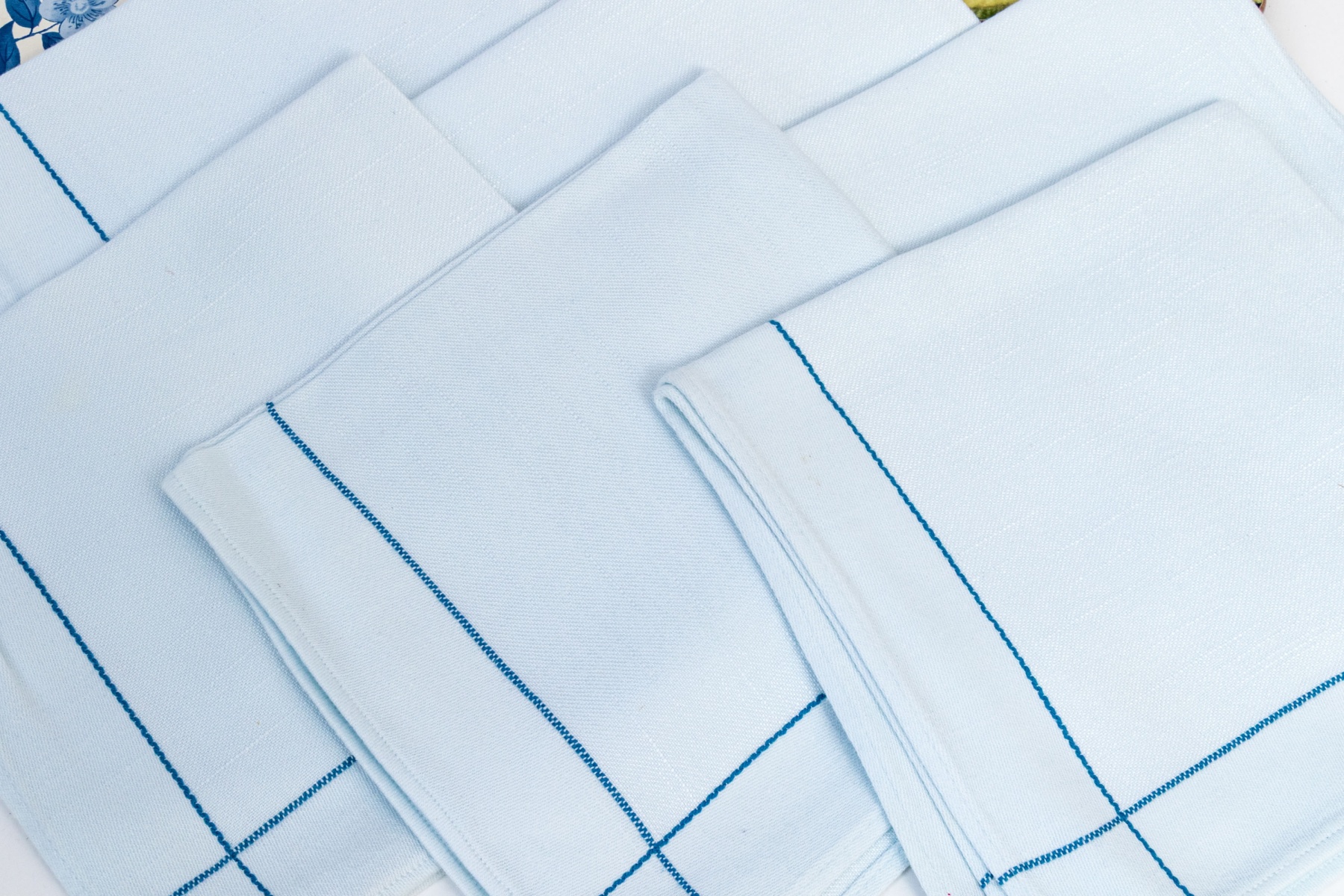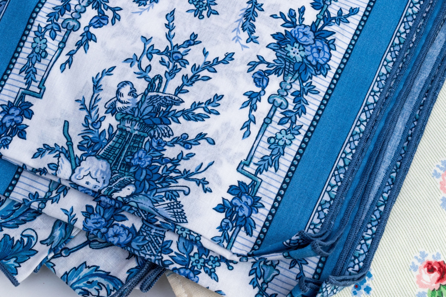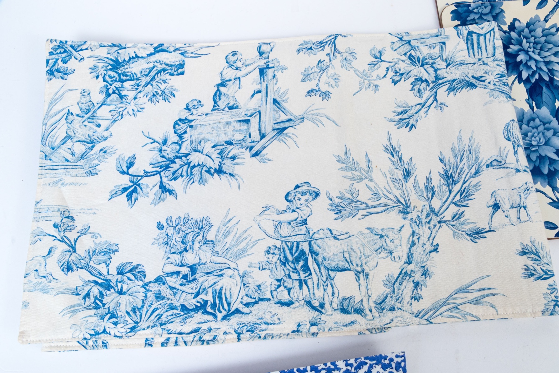 Six well made, heavy blue placemats with floral centers and eight matching napkins
