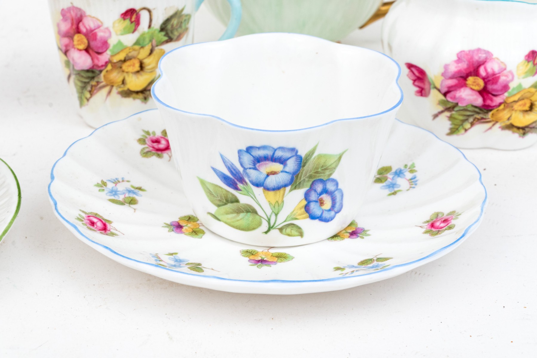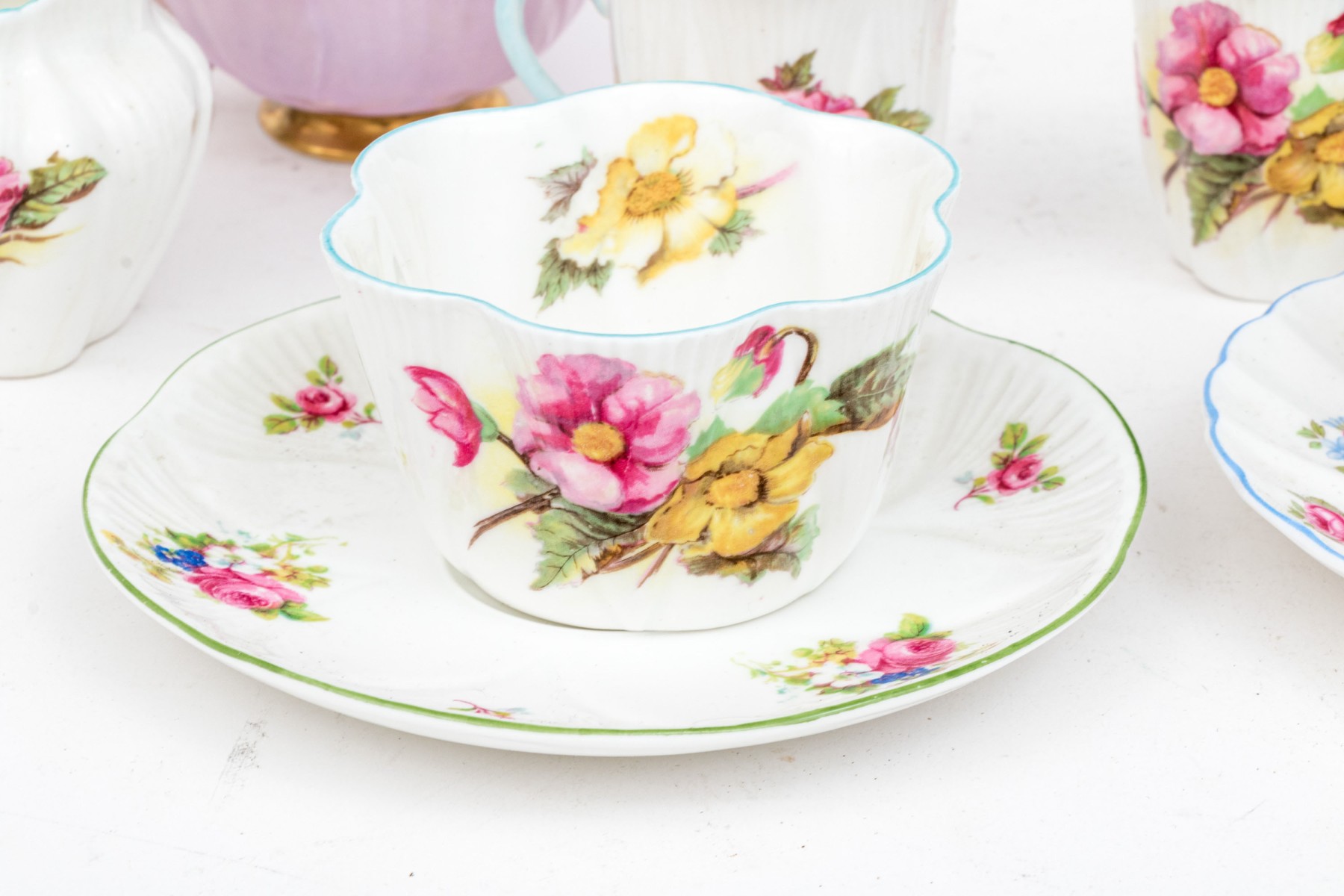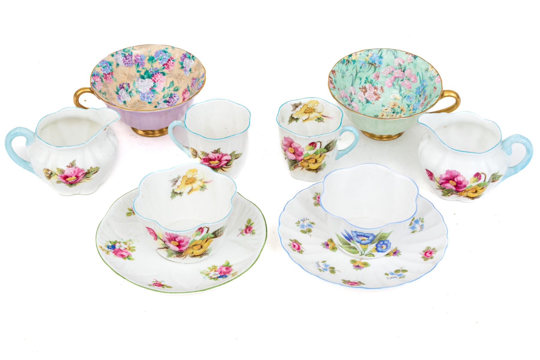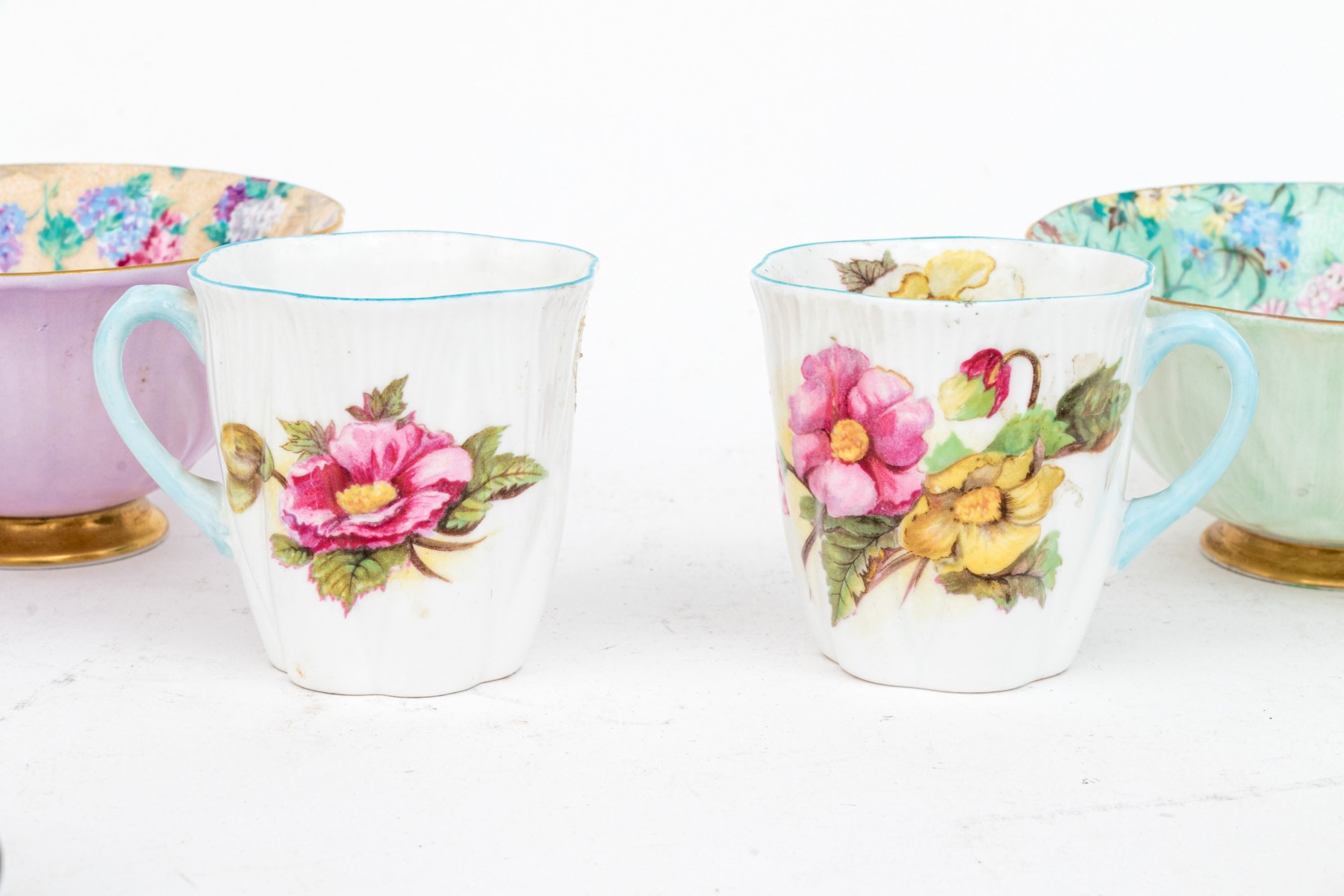 - Two scalloped teacups with saucers