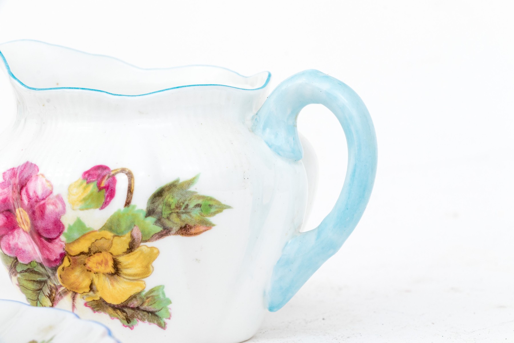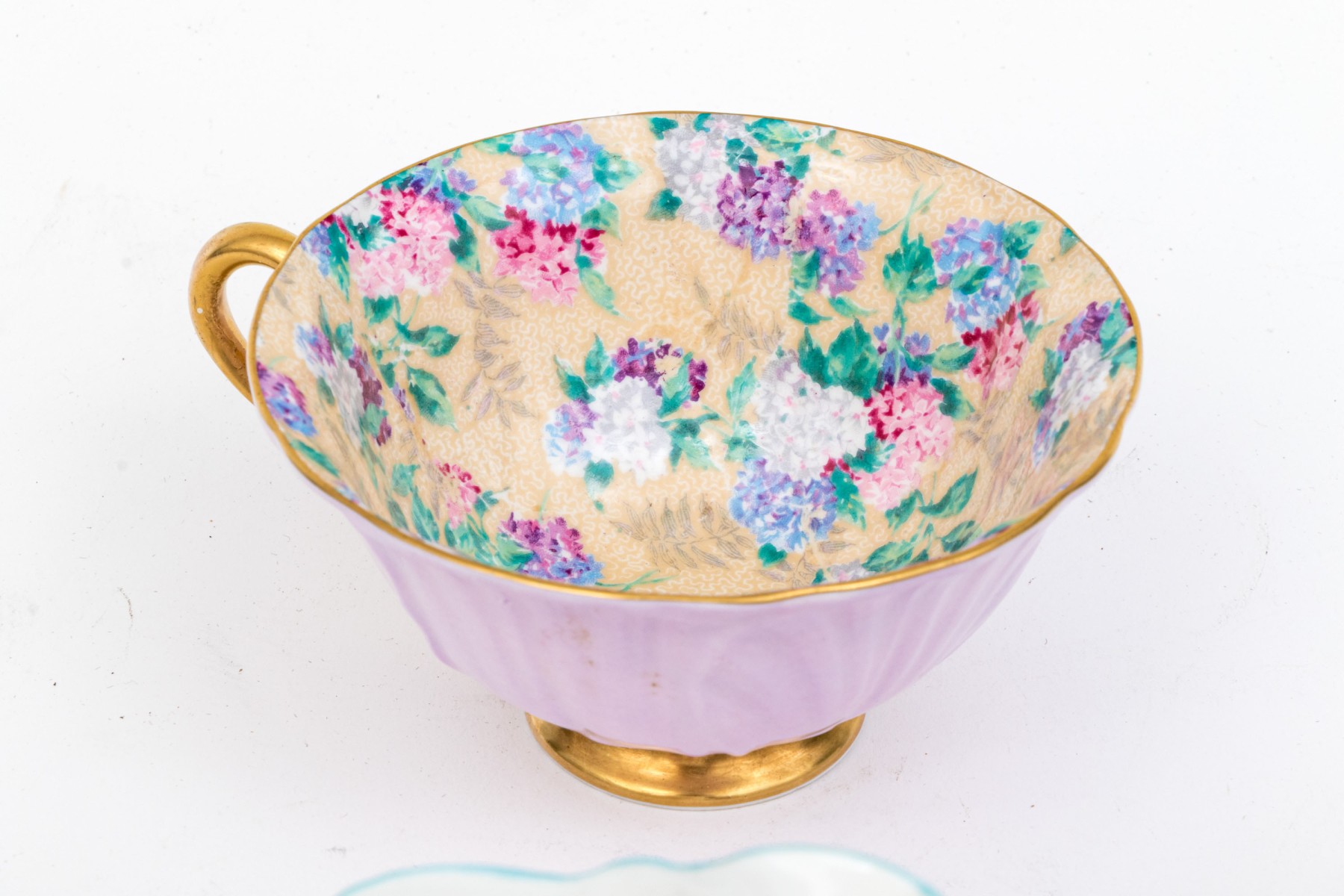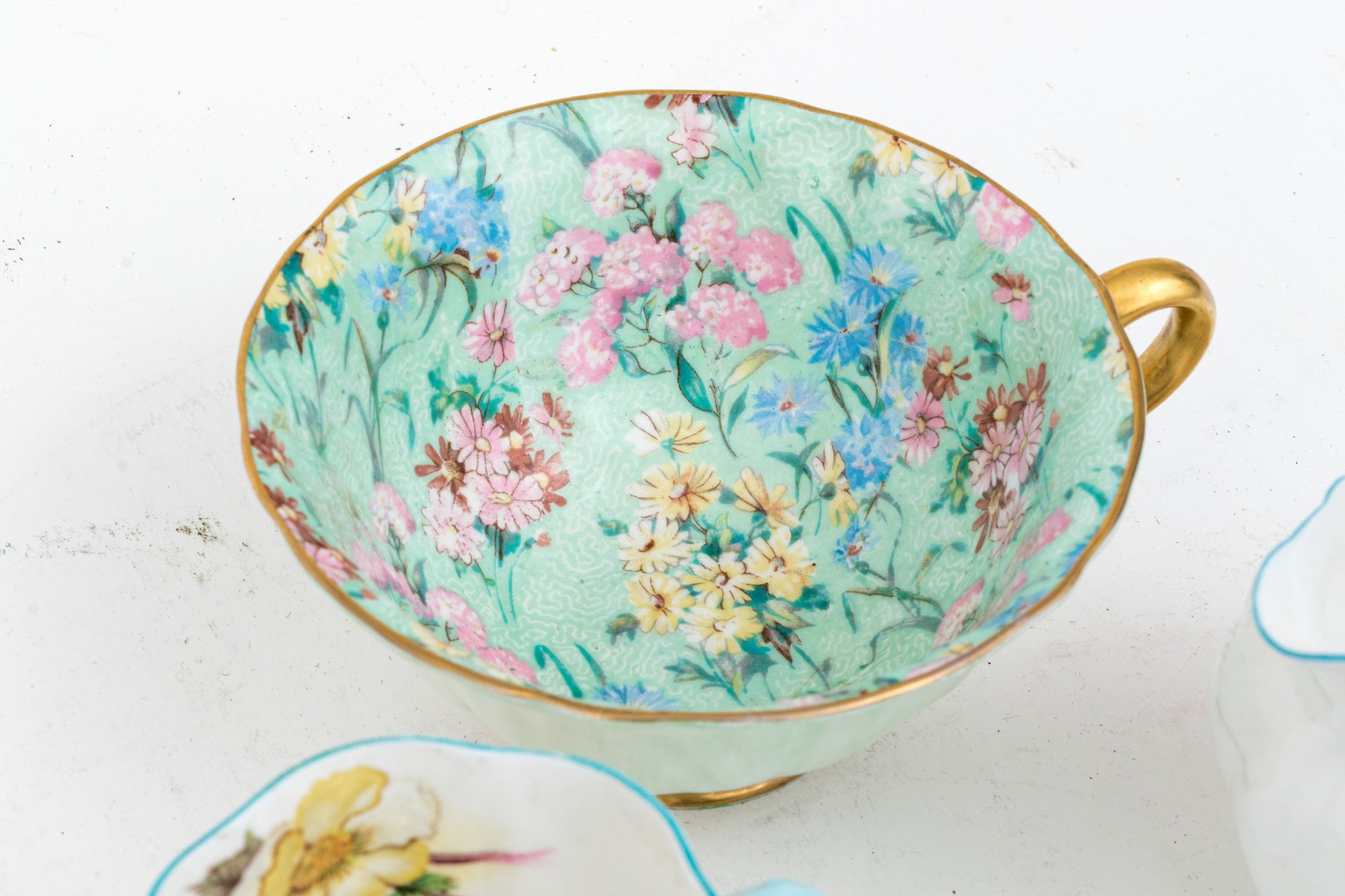 - Two scalloped teacups with saucers