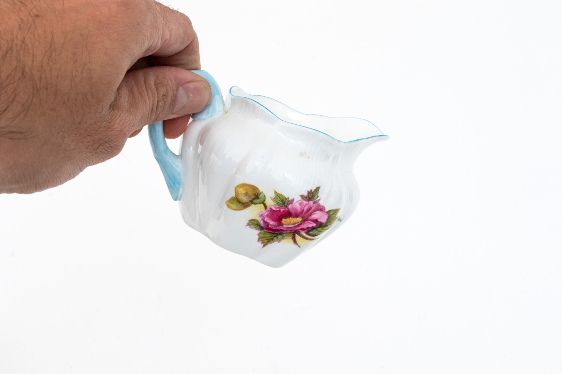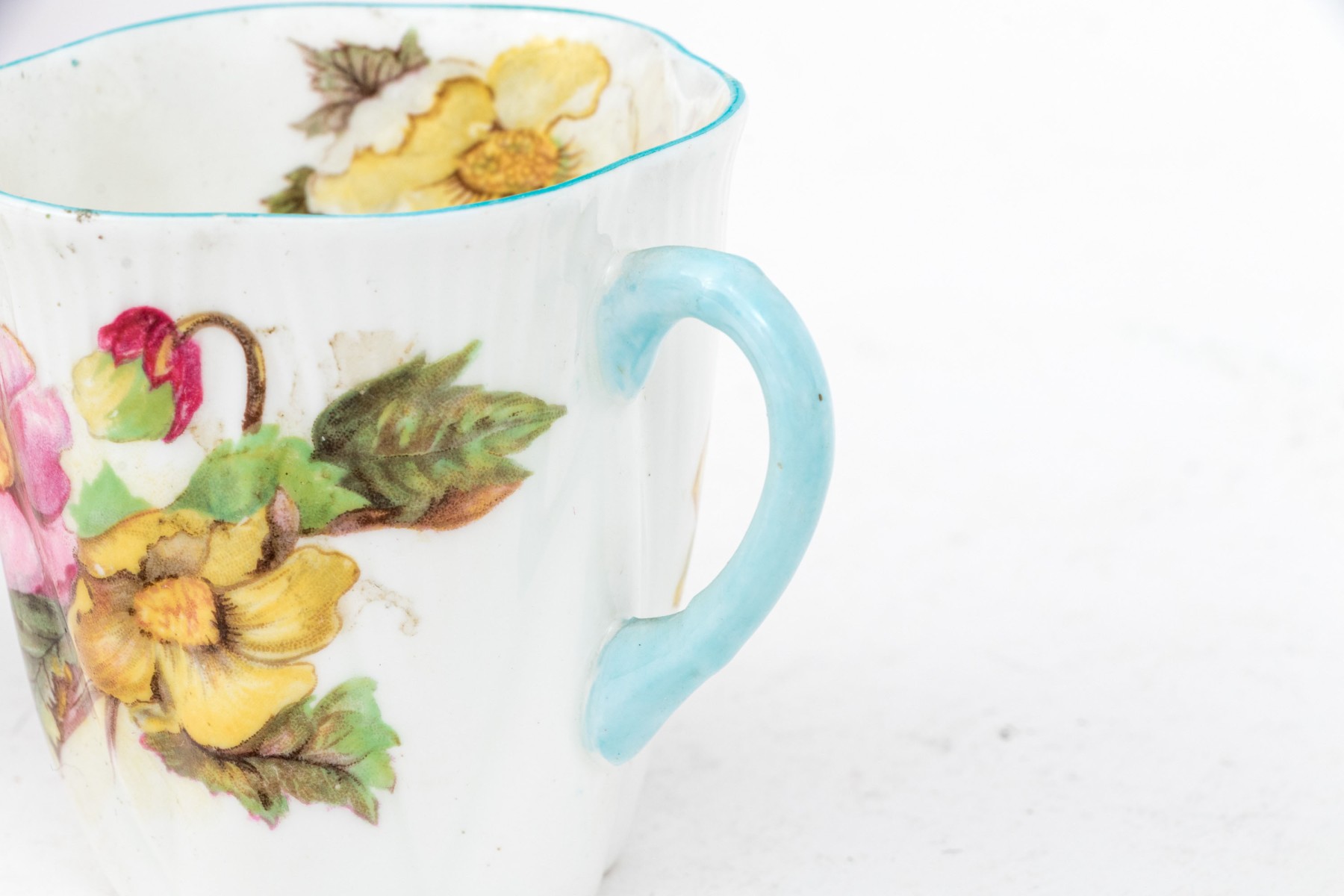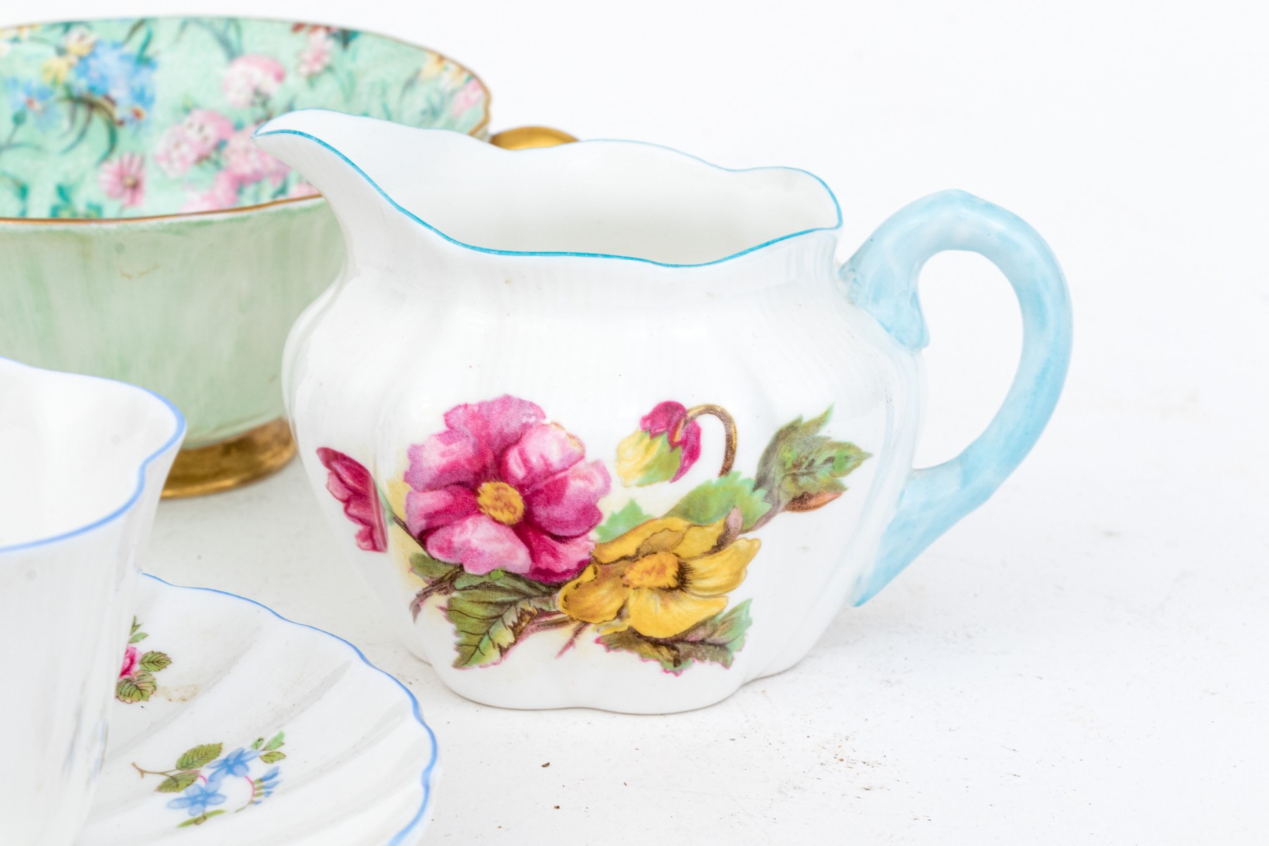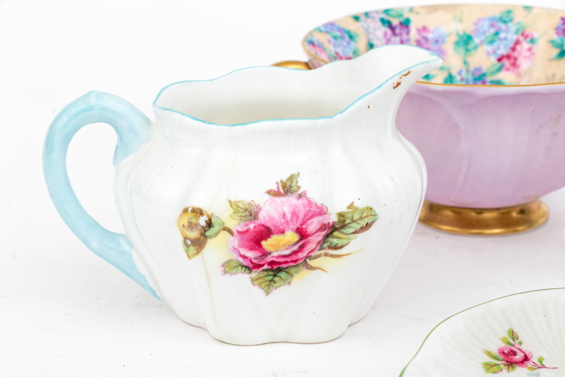 - Two scalloped teacups with saucers