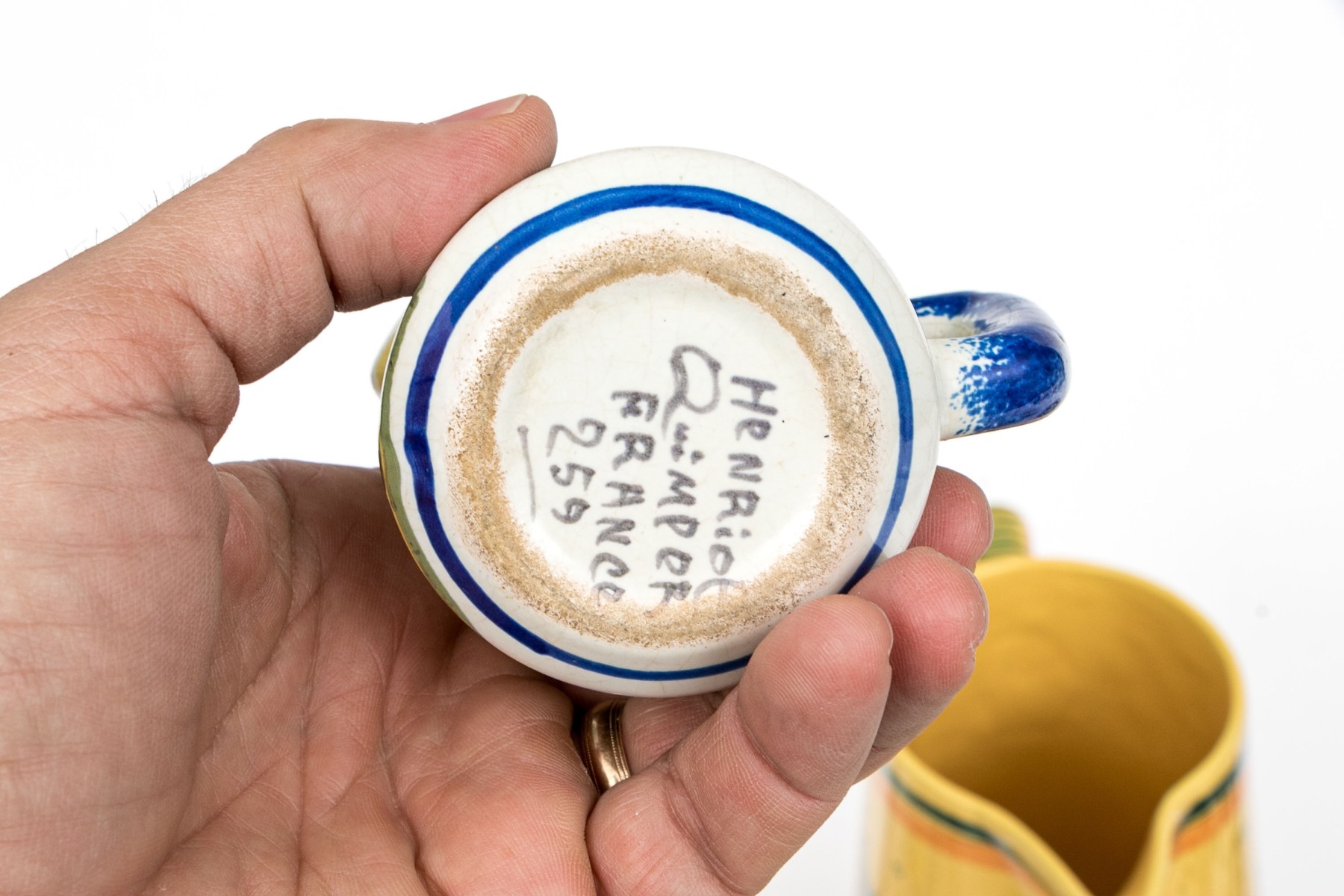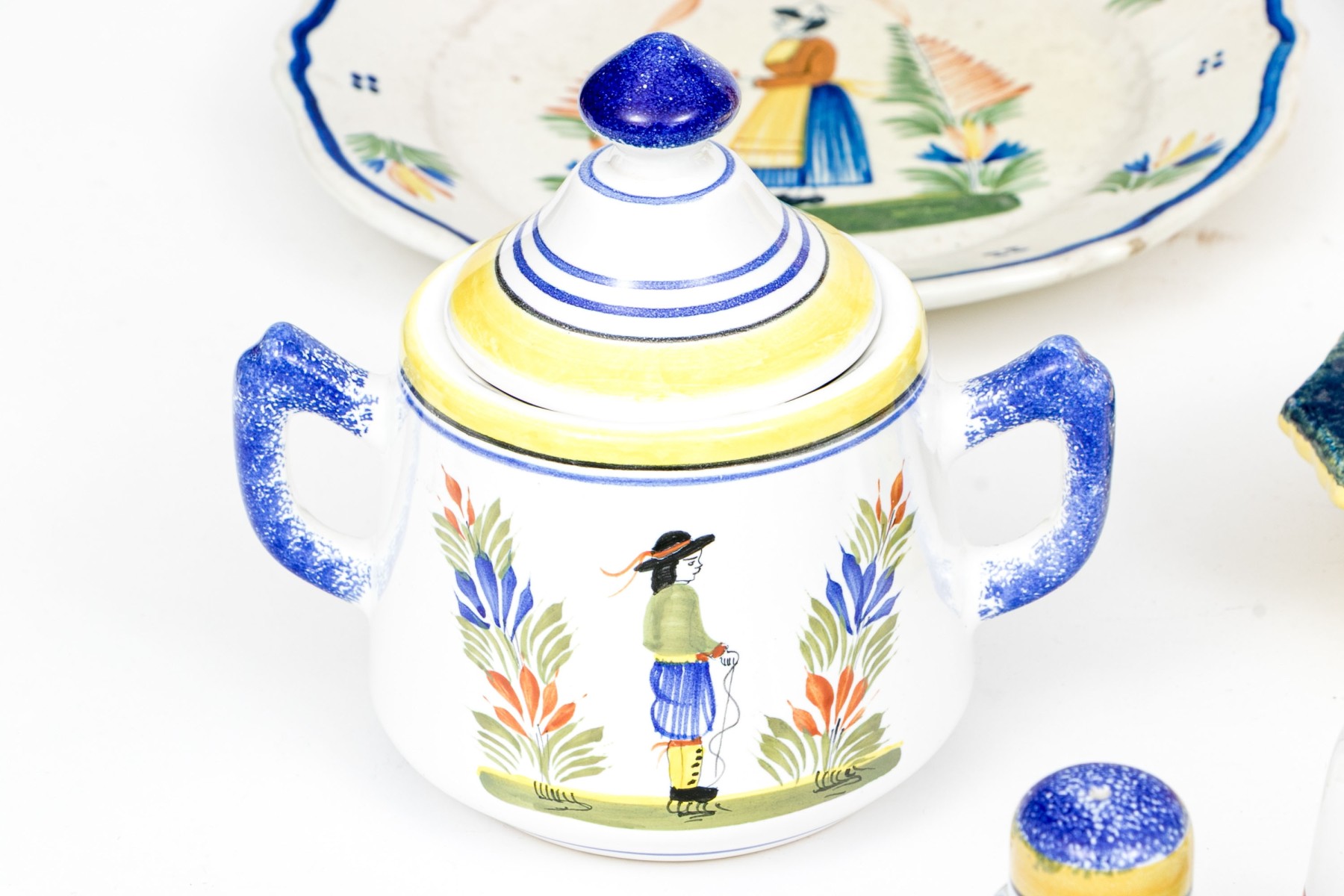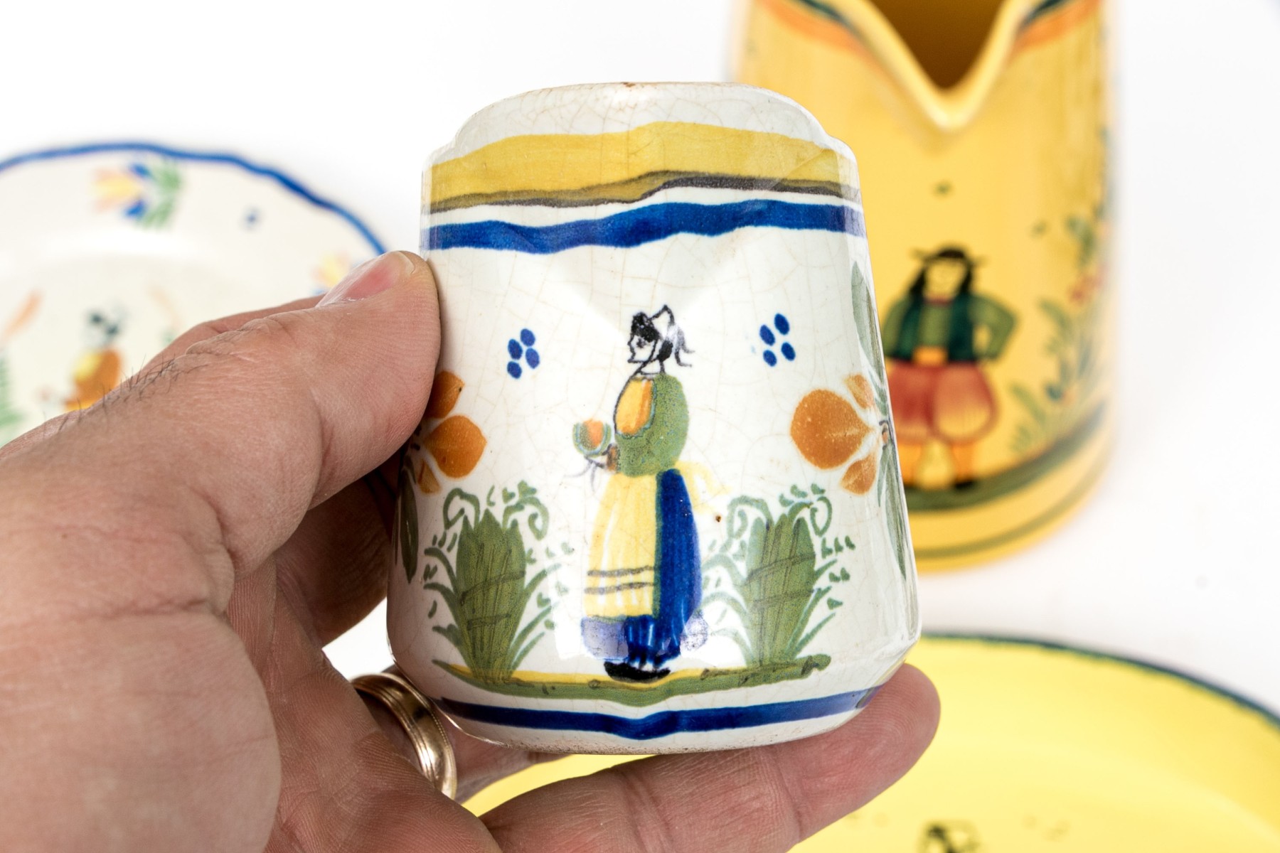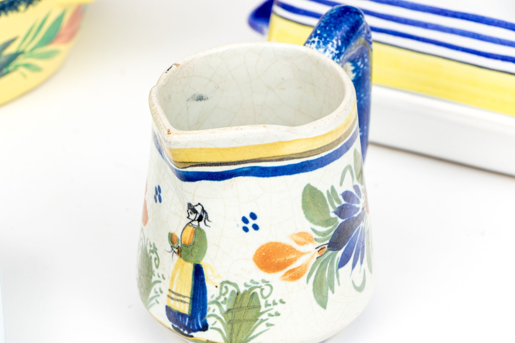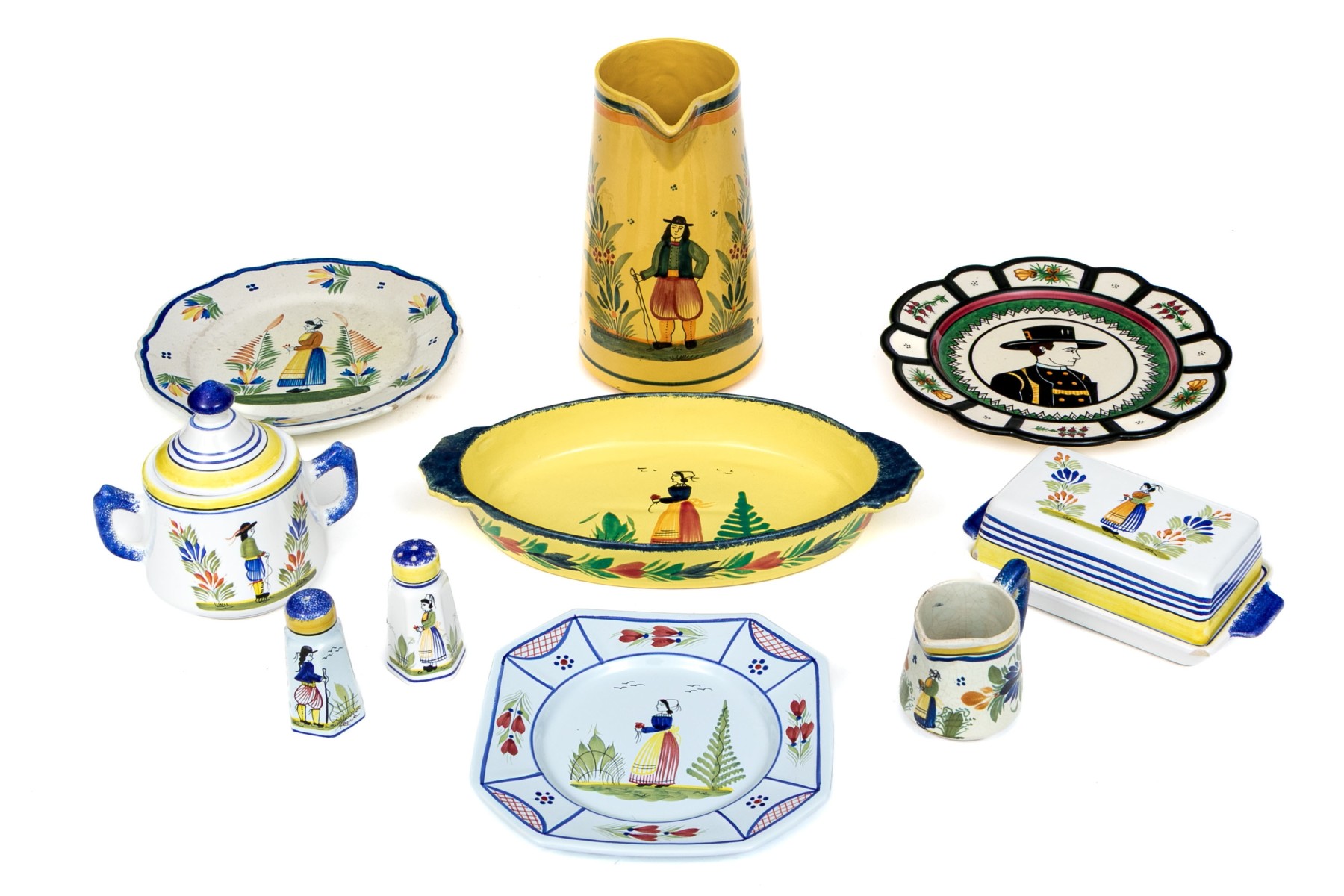 A fabulous ten piece collection of Quimper ceramics with yellow and white grounds including a pitcher, lidded twin handled sugar, three plates, pair of casters, creamers, lidded butterfish and oval twin handled serving dish.