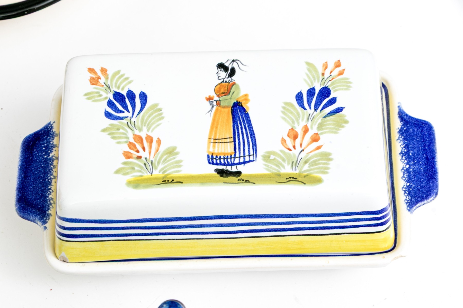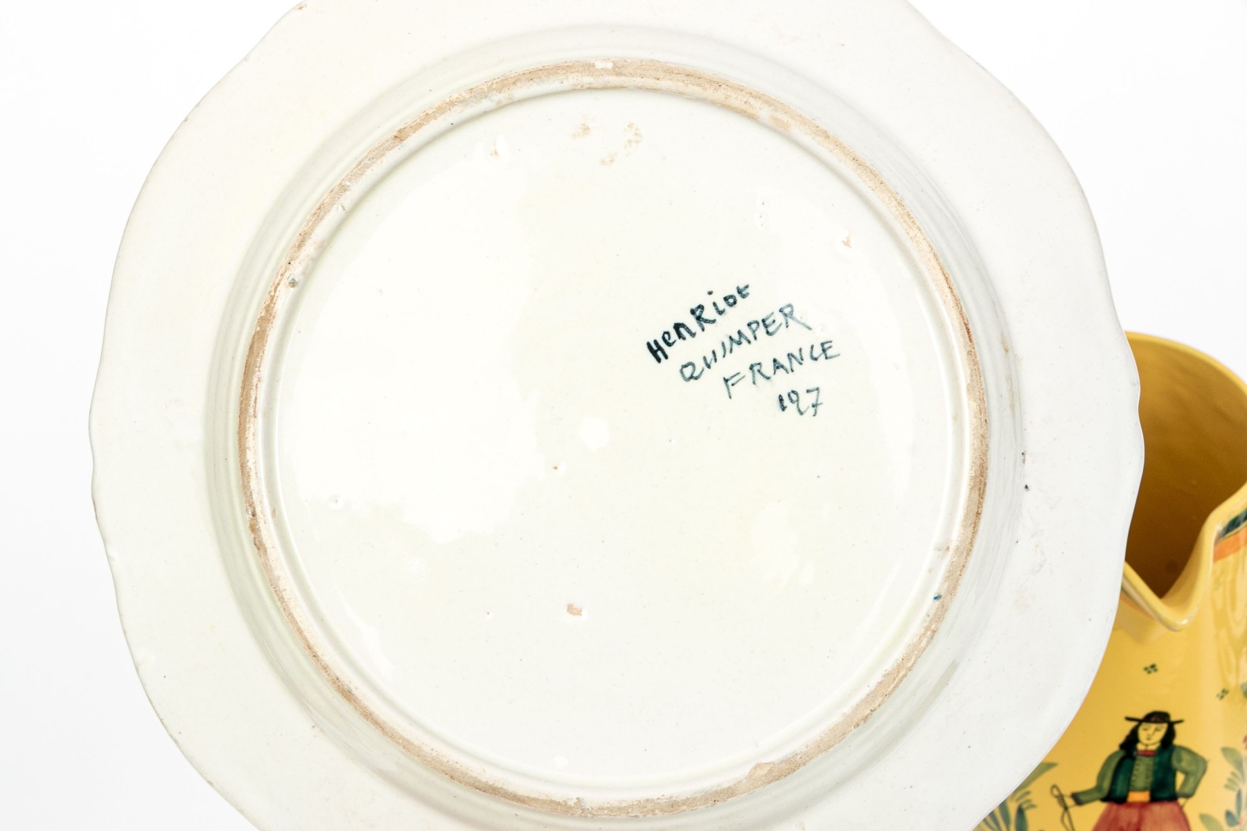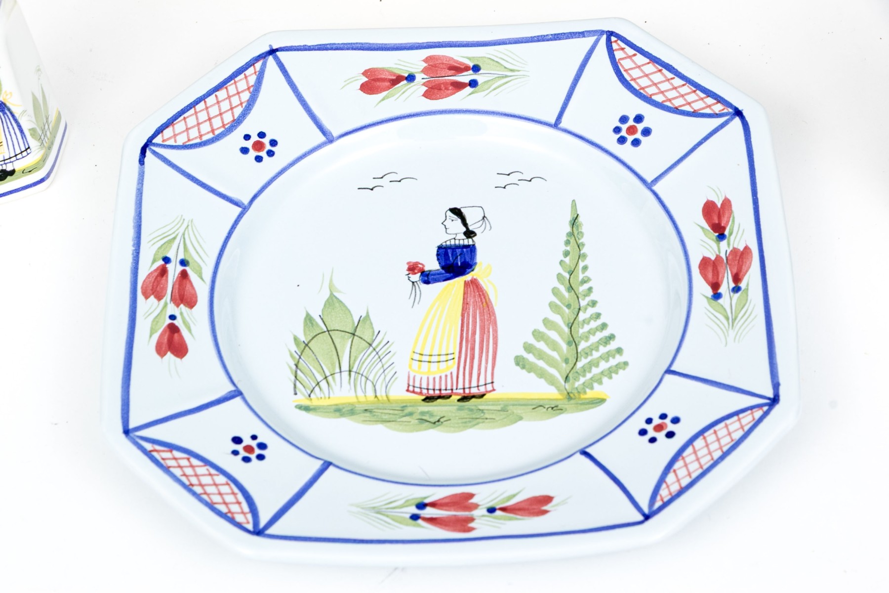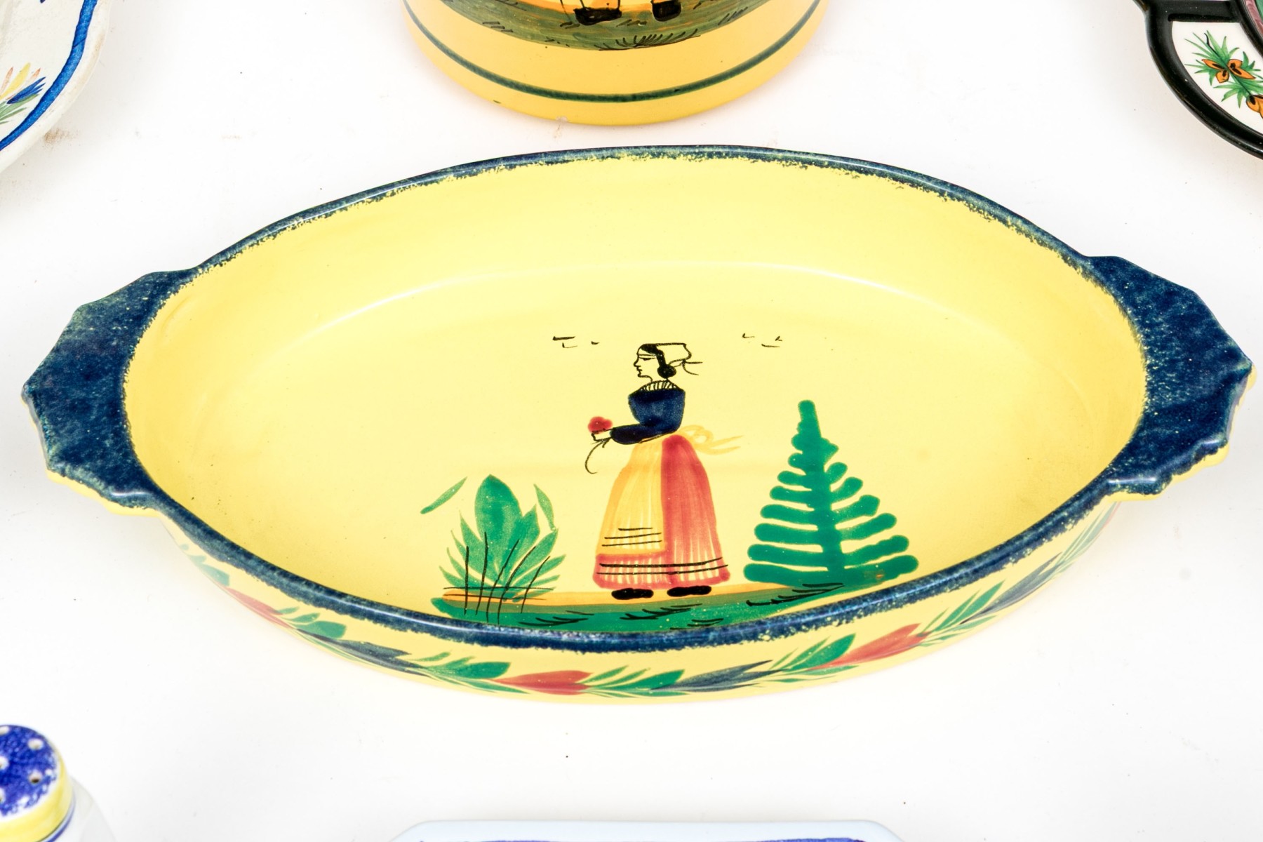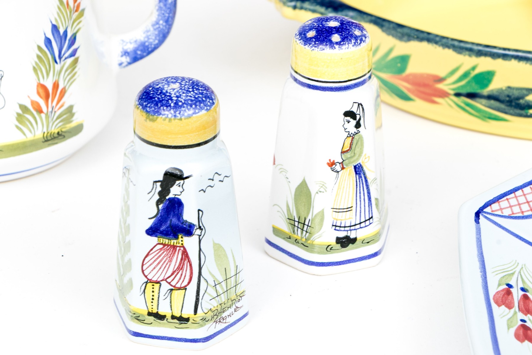 A fabulous ten piece collection of Quimper ceramics with yellow and white grounds including a pitcher, lidded twin handled sugar, three plates, pair of casters, creamers, lidded butterfish and oval twin handled serving dish.