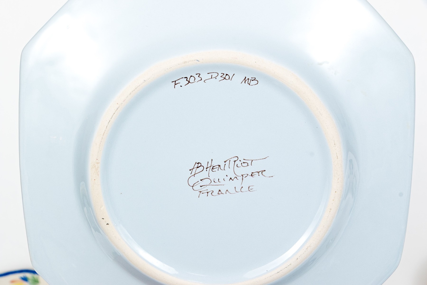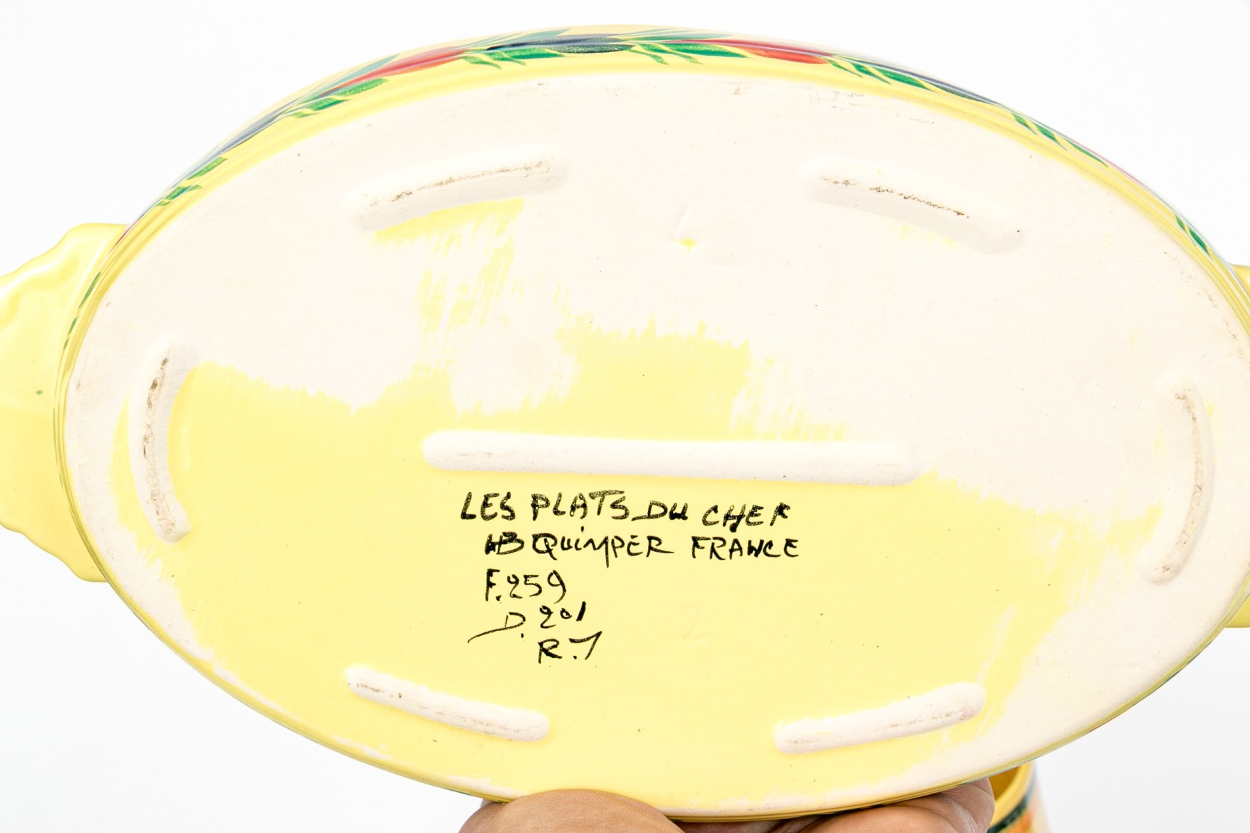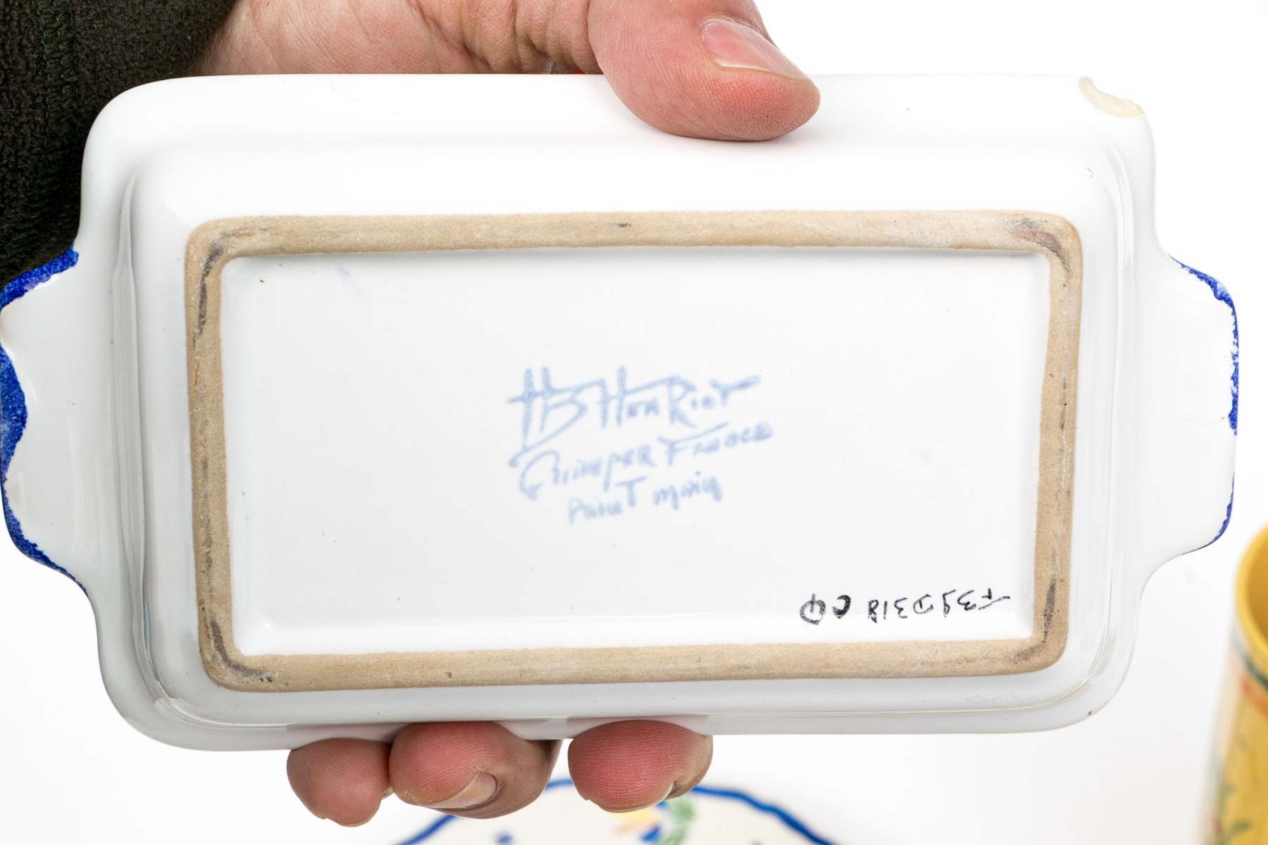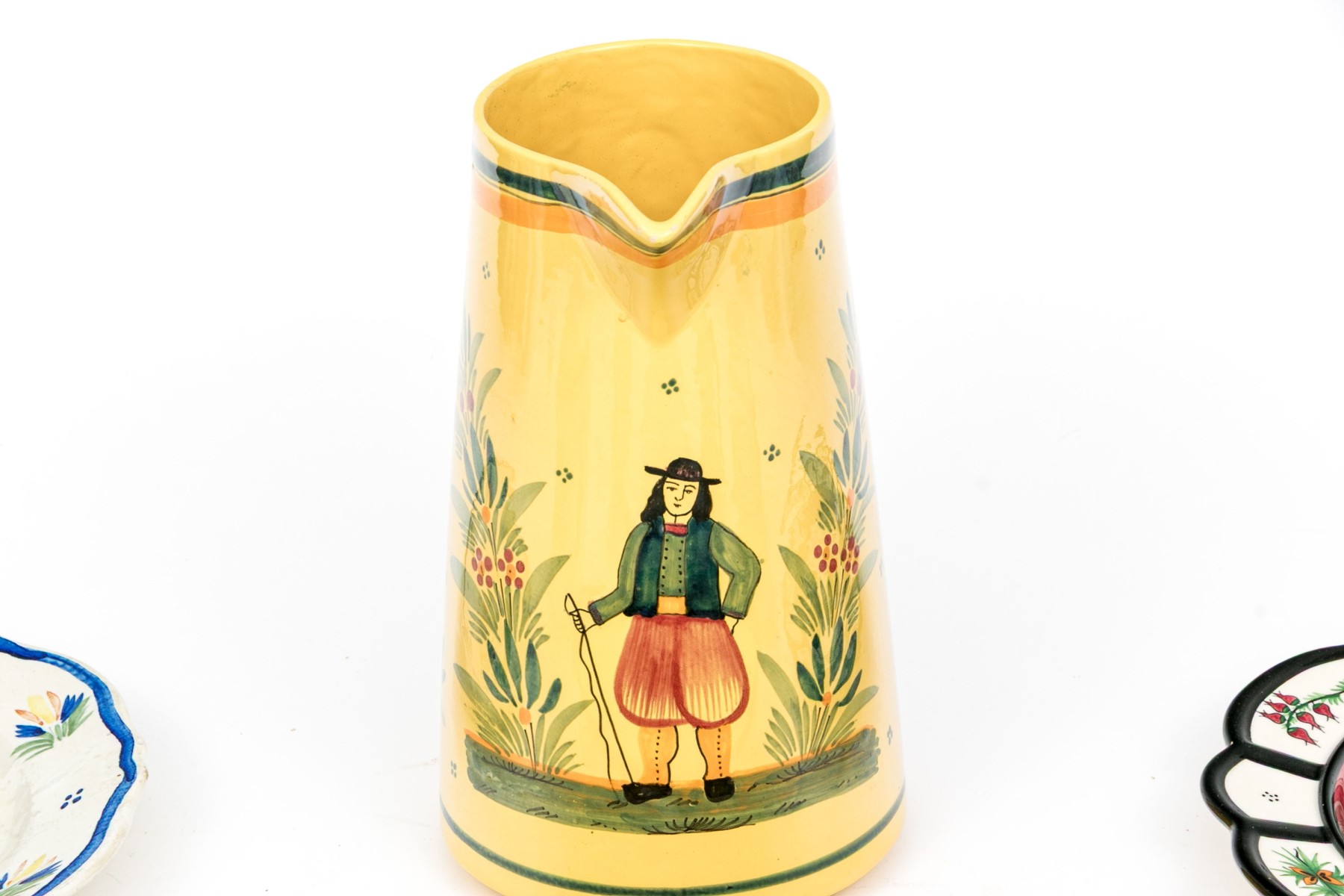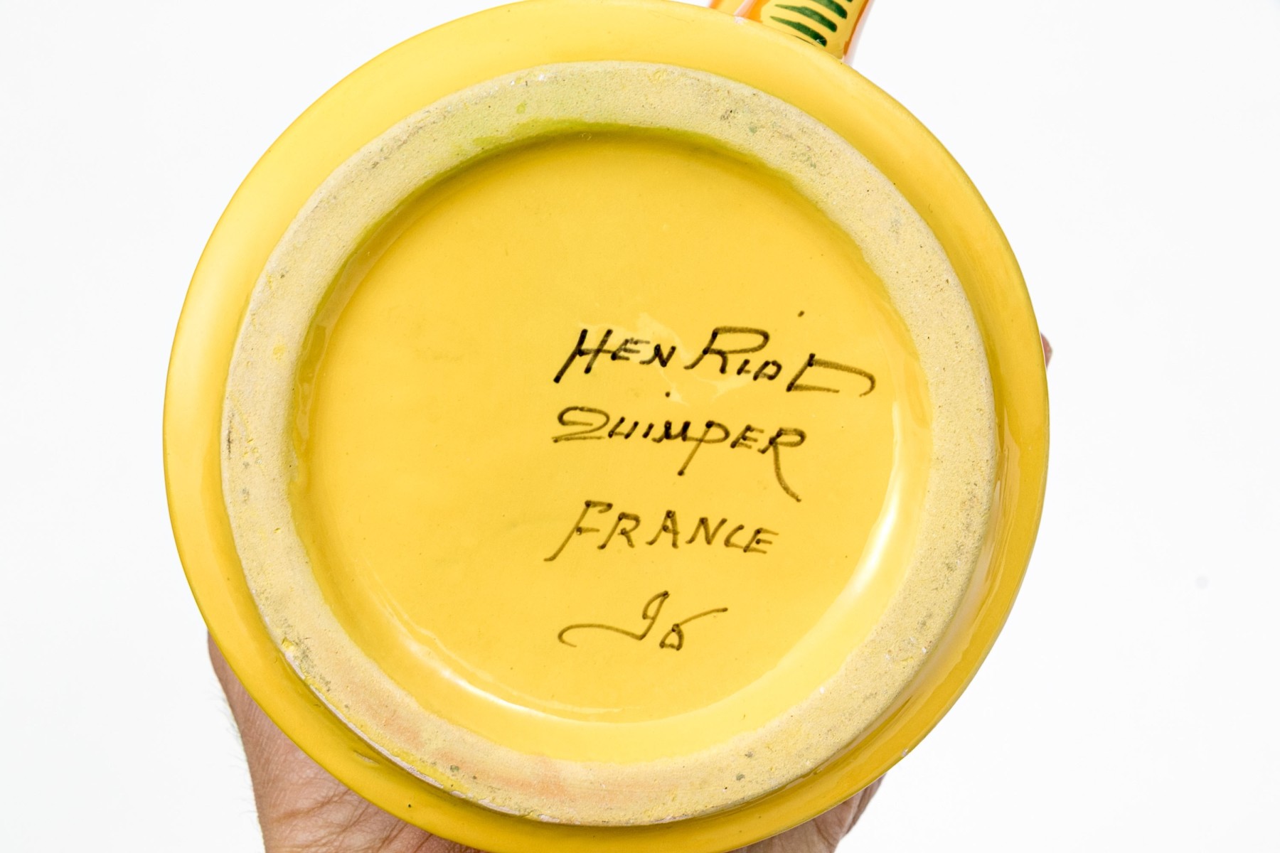 A fabulous ten piece collection of Quimper ceramics with yellow and white grounds including a pitcher, lidded twin handled sugar, three plates, pair of casters, creamers, lidded butterfish and oval twin handled serving dish.