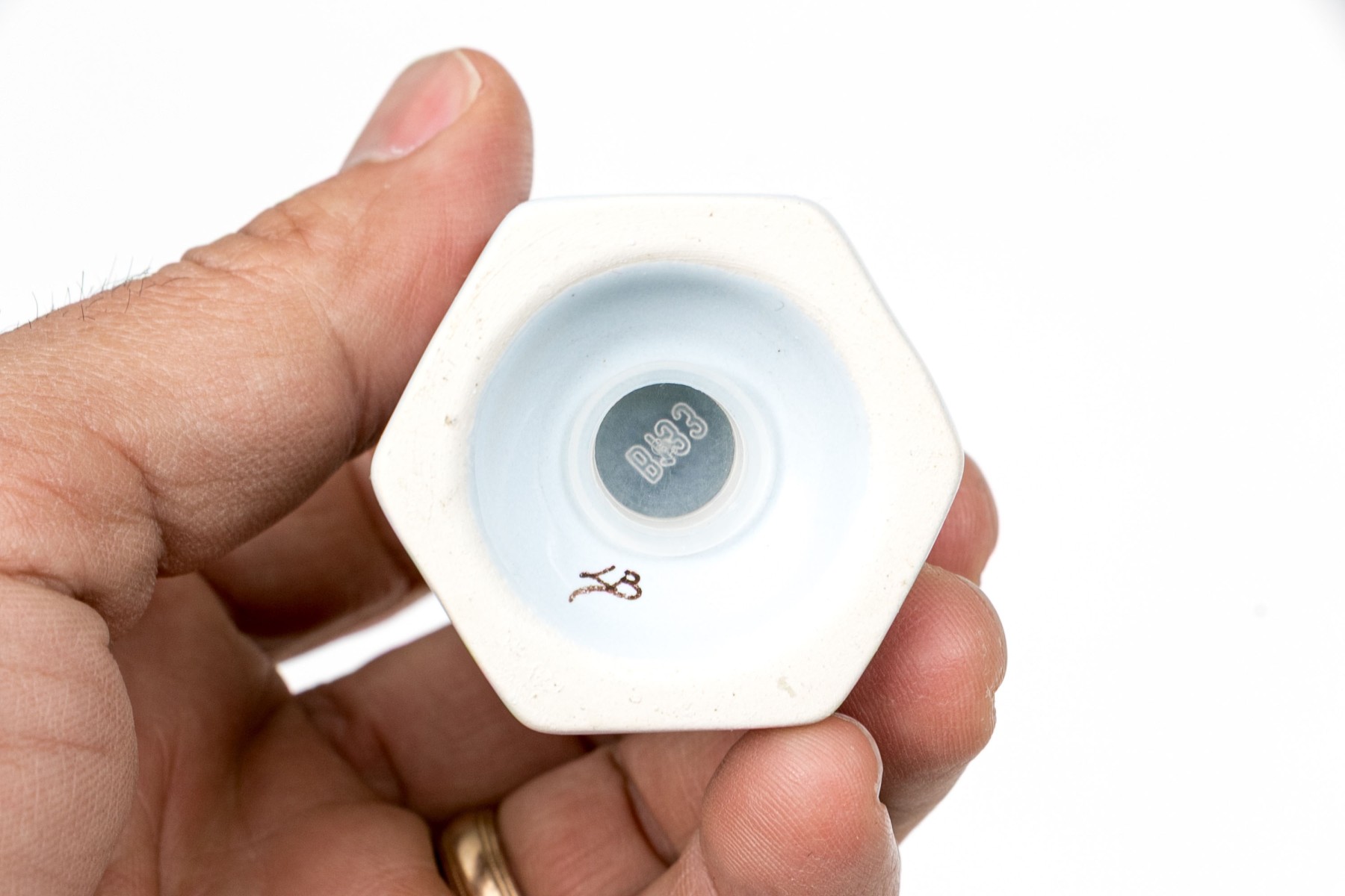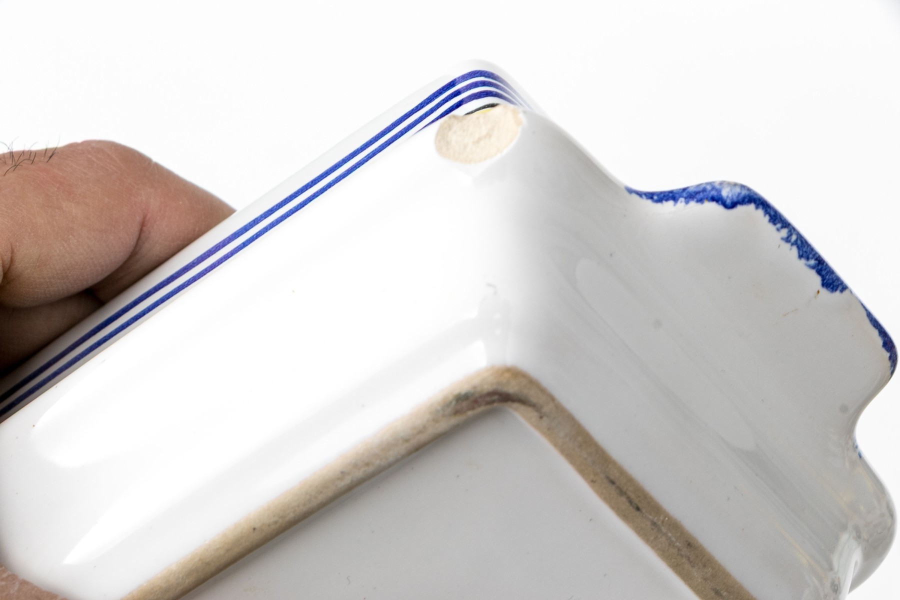 The butter dish plate has a chip to one corner, wear to the finish and crazing to the glaze. Despite wear still a wonderful collection.