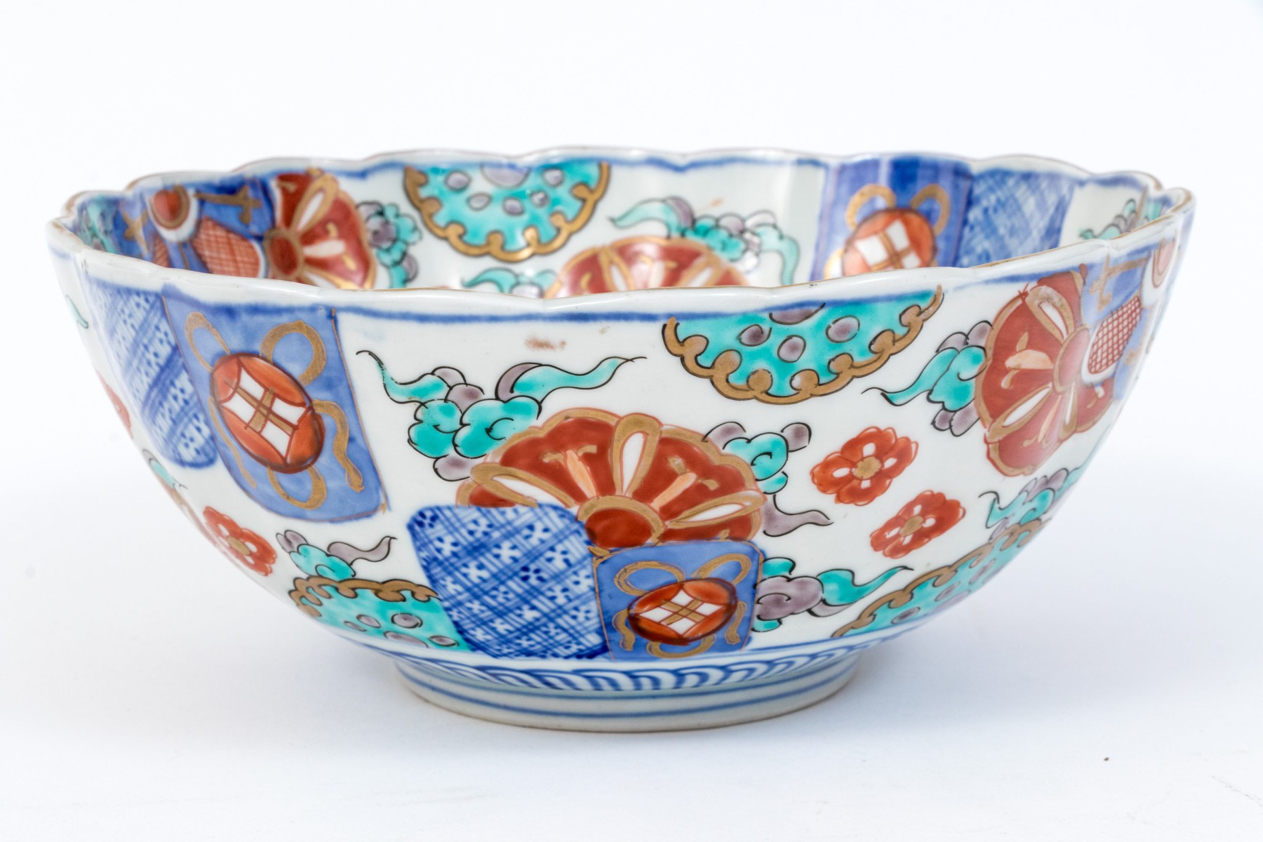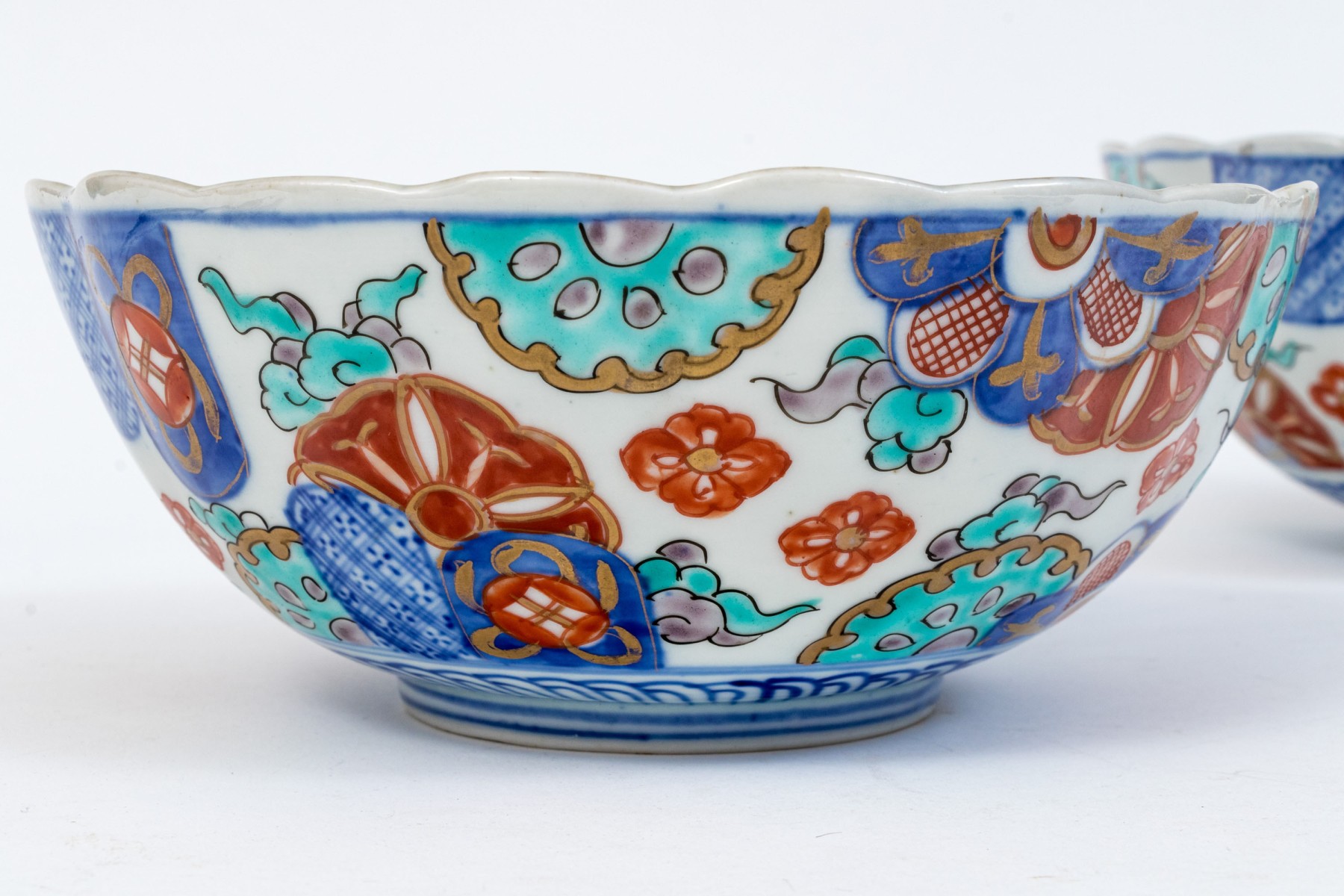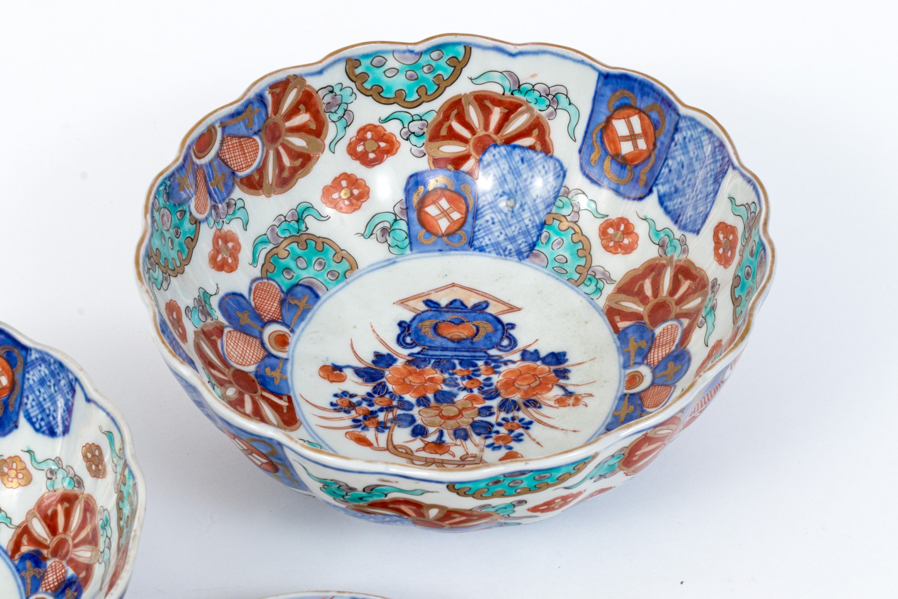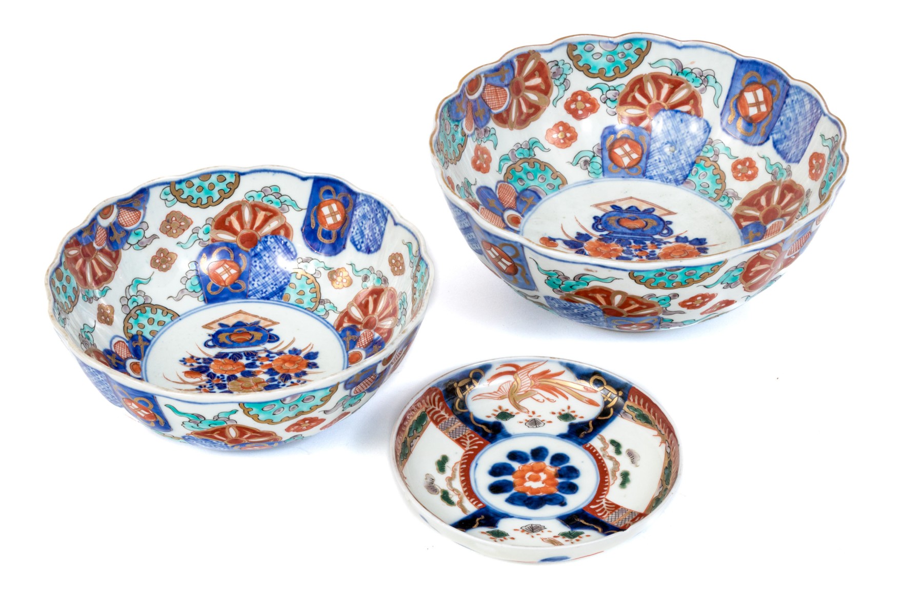 Comprised of two larger Japanese Imari porcelain serving bowls with scalloped mouth trims, together with a Chinese Imari porcelain low bowl.
