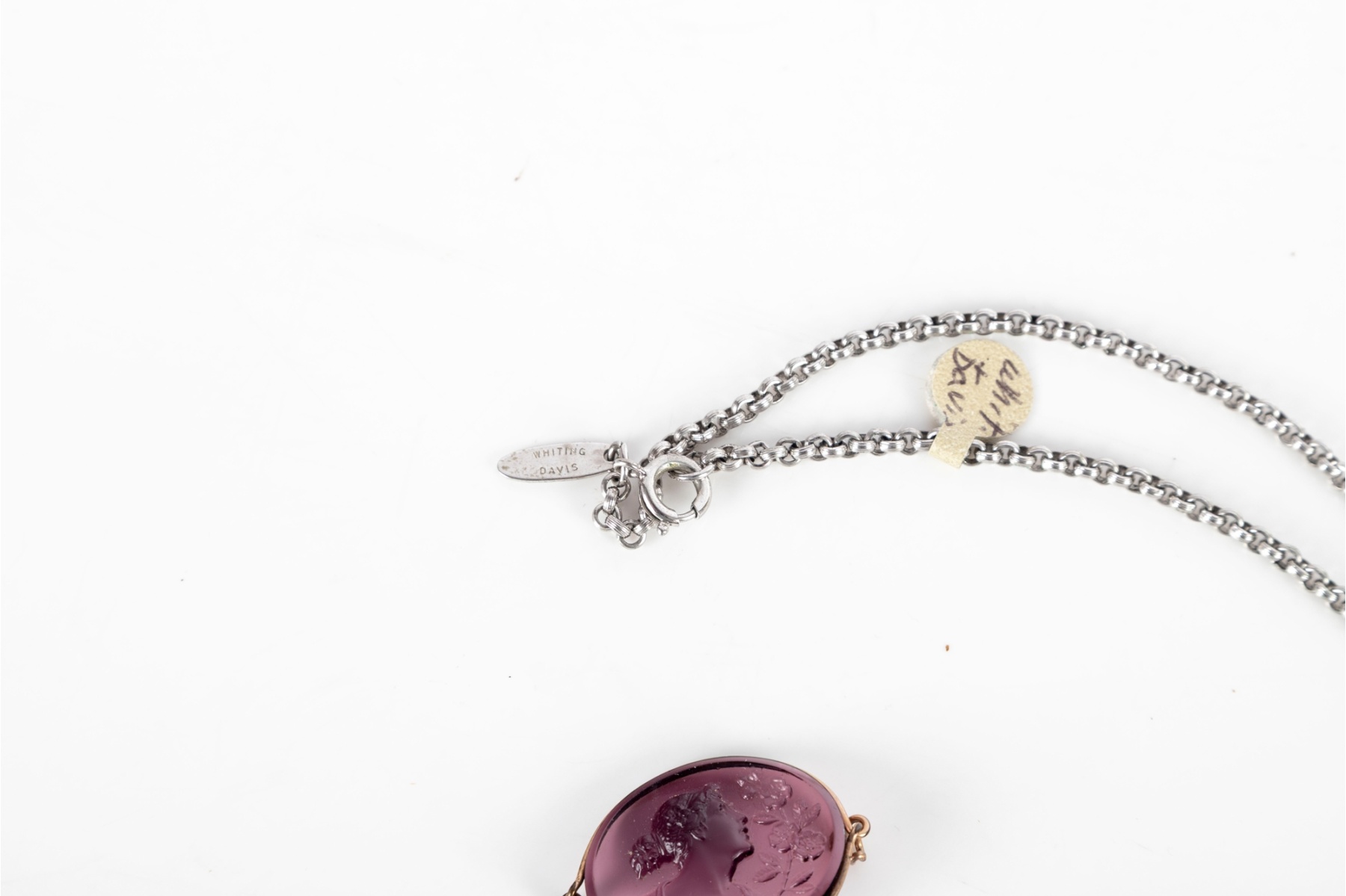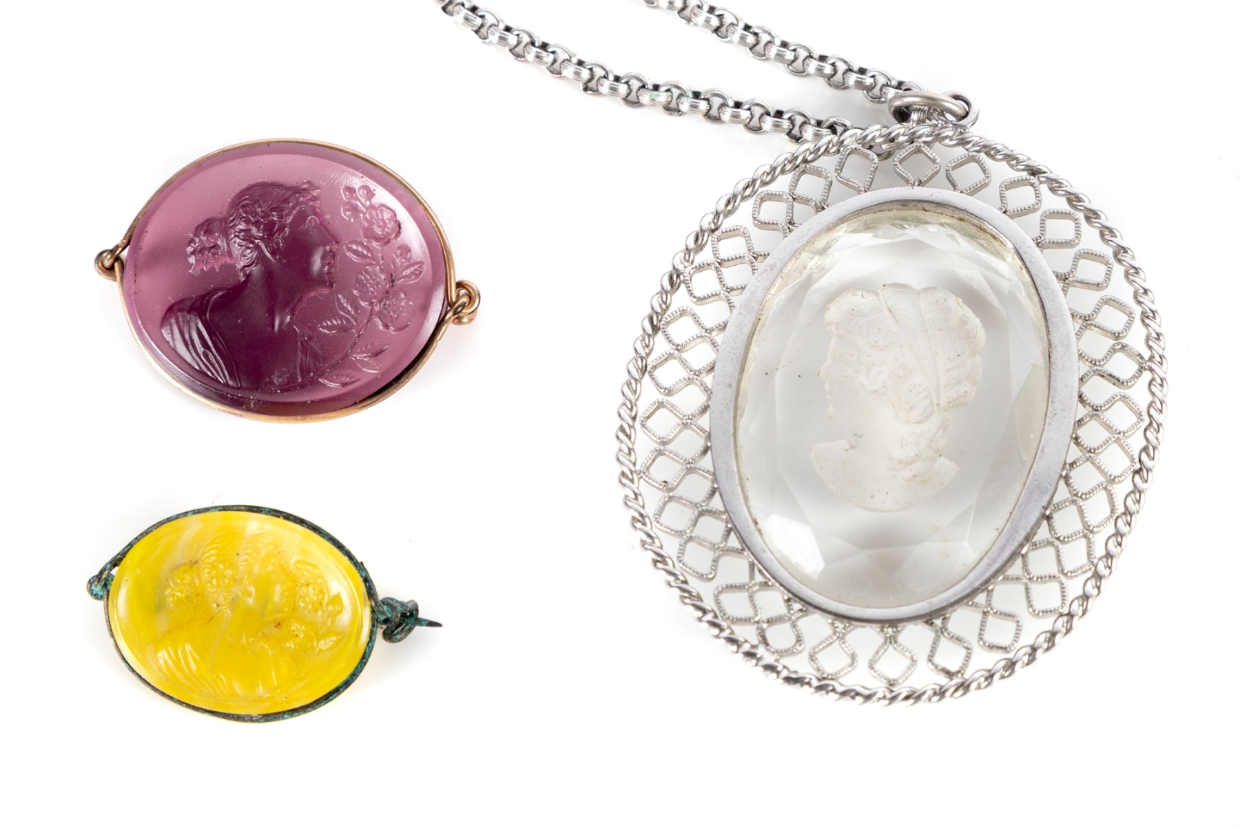 Group includes three vintage cameo-style pieces featuring molded or intaglio glass portraits. The lot consists of a large clear glass cameo pendant set in an openwork silver-tone frame on chain, along with two smaller oval glass cameos—one in deep amethyst-purple and one in yellow.