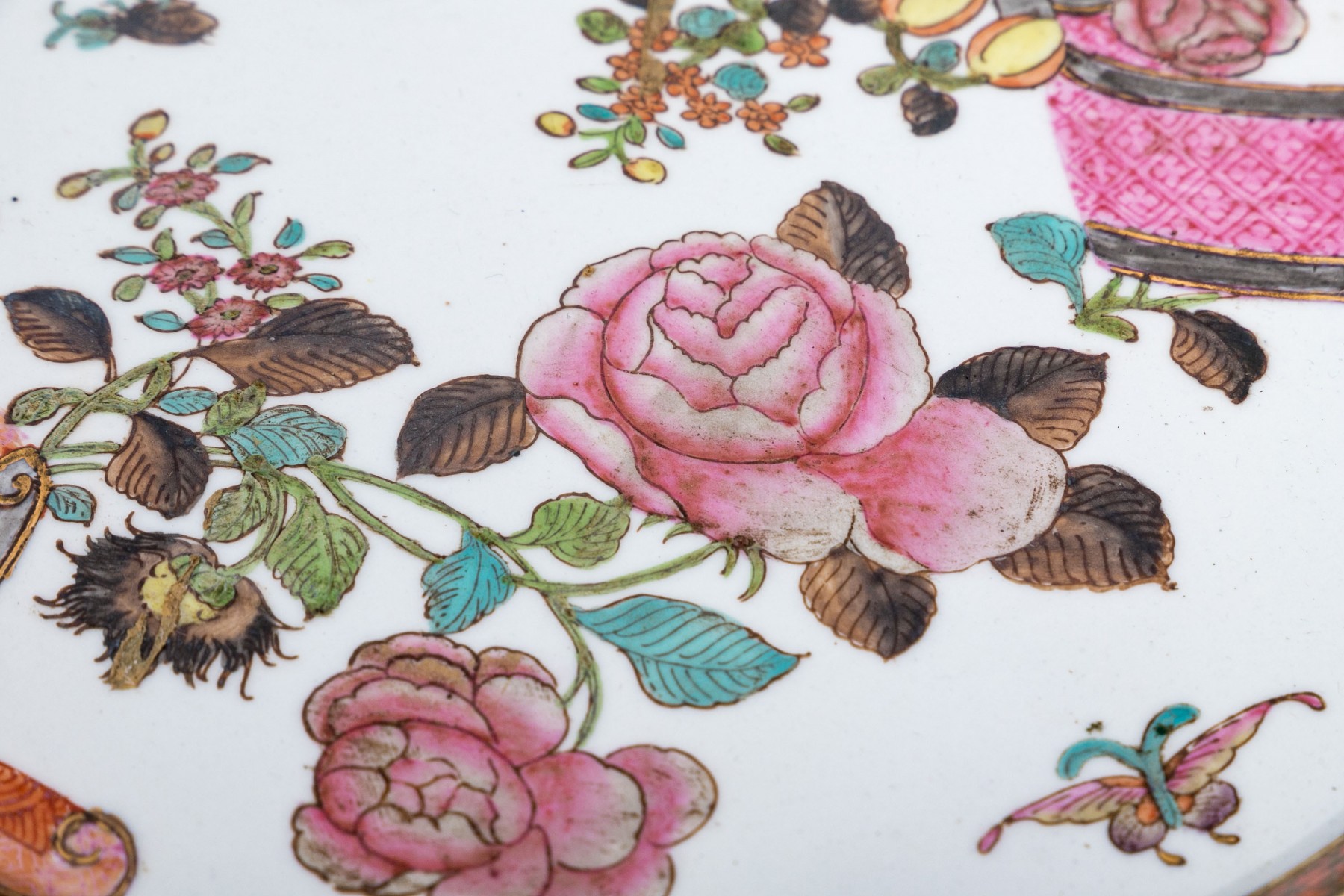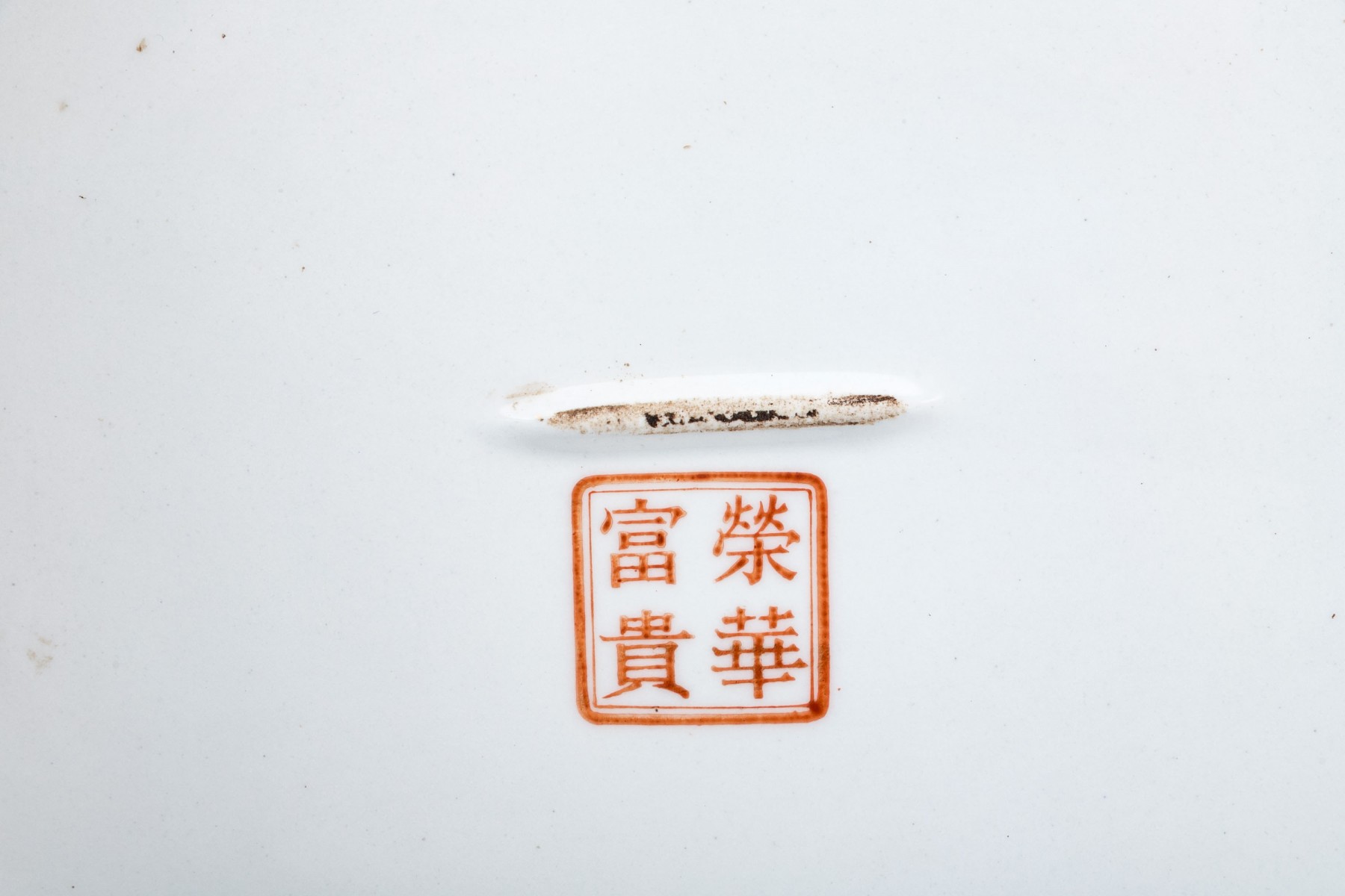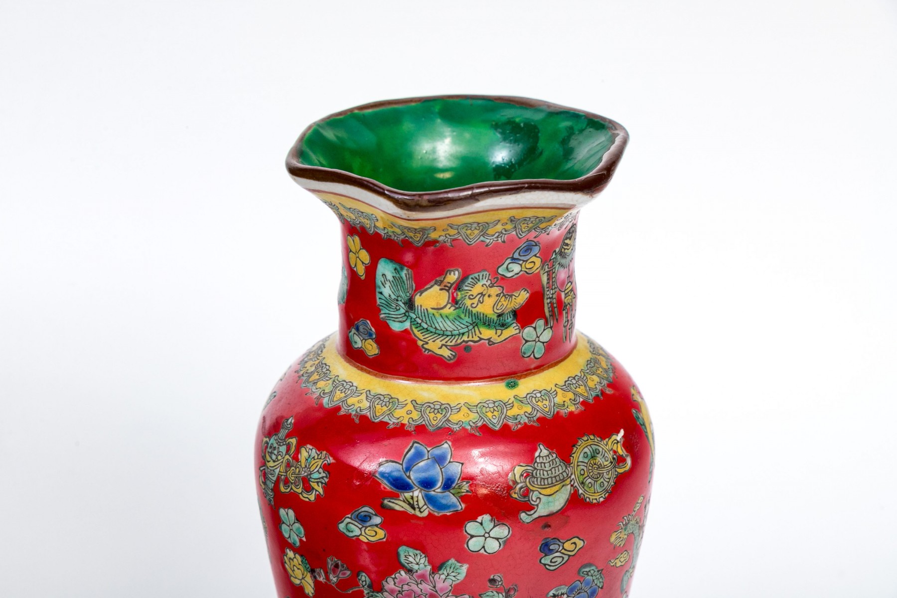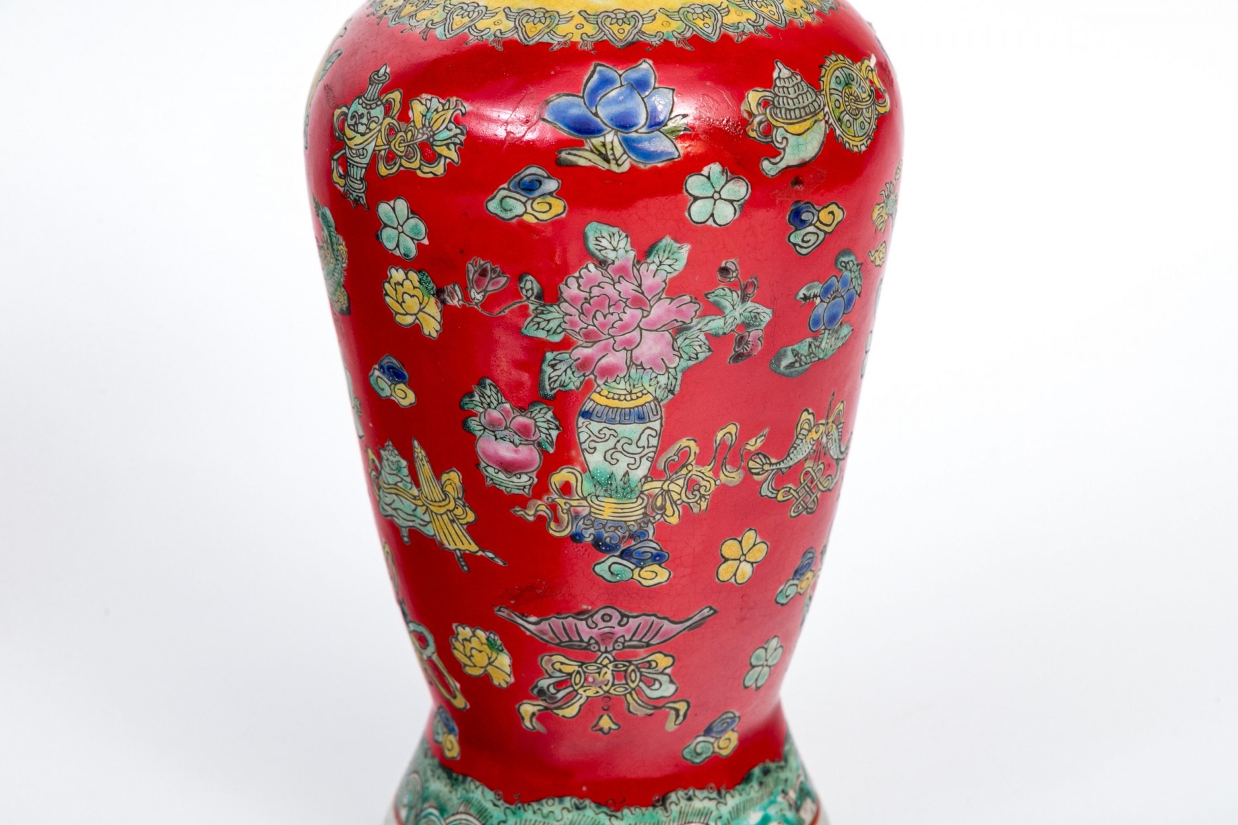 And a glazed porcelain jar in red with vases, flowers and symbols and a scalloped rim.