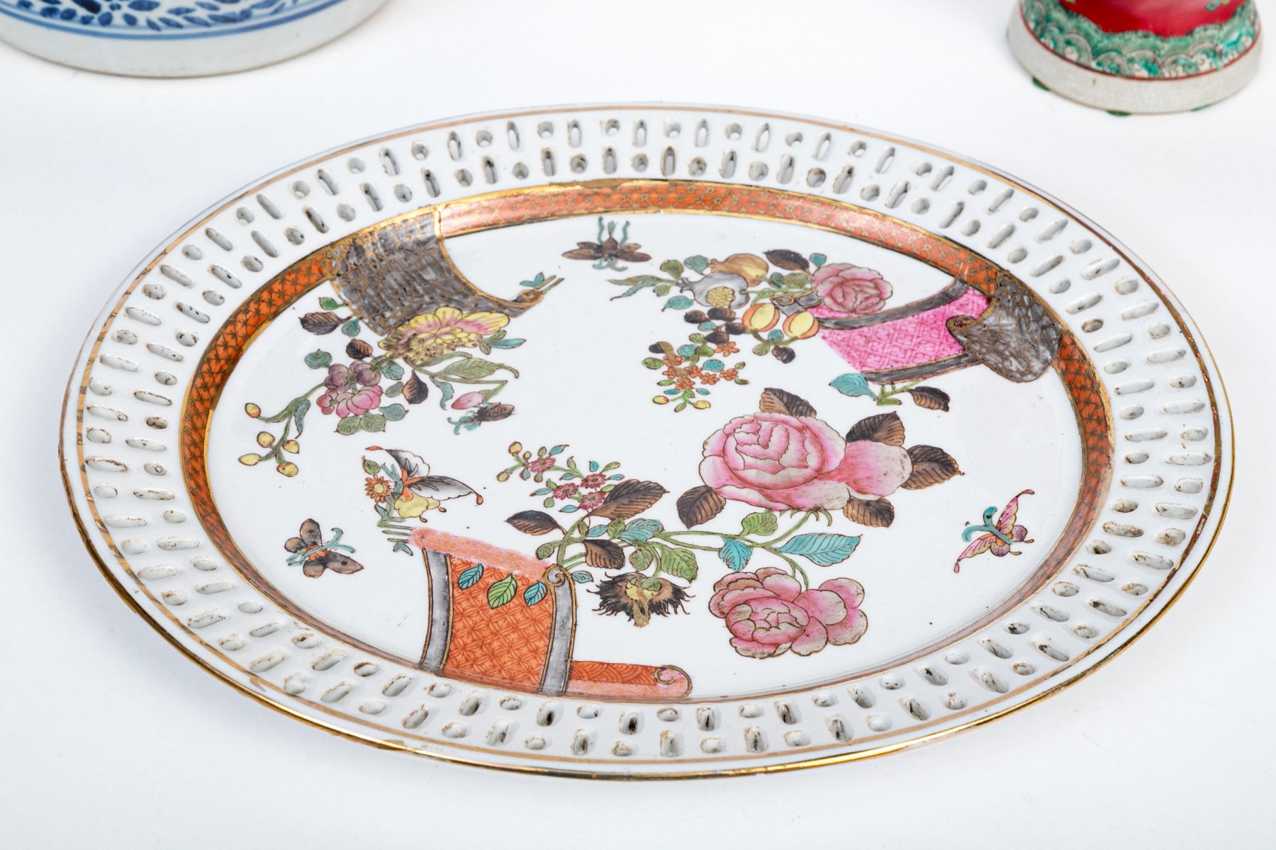 Including; an oval white porcelian plate with colorful floral and gilt decoration and a pierced rim band.
