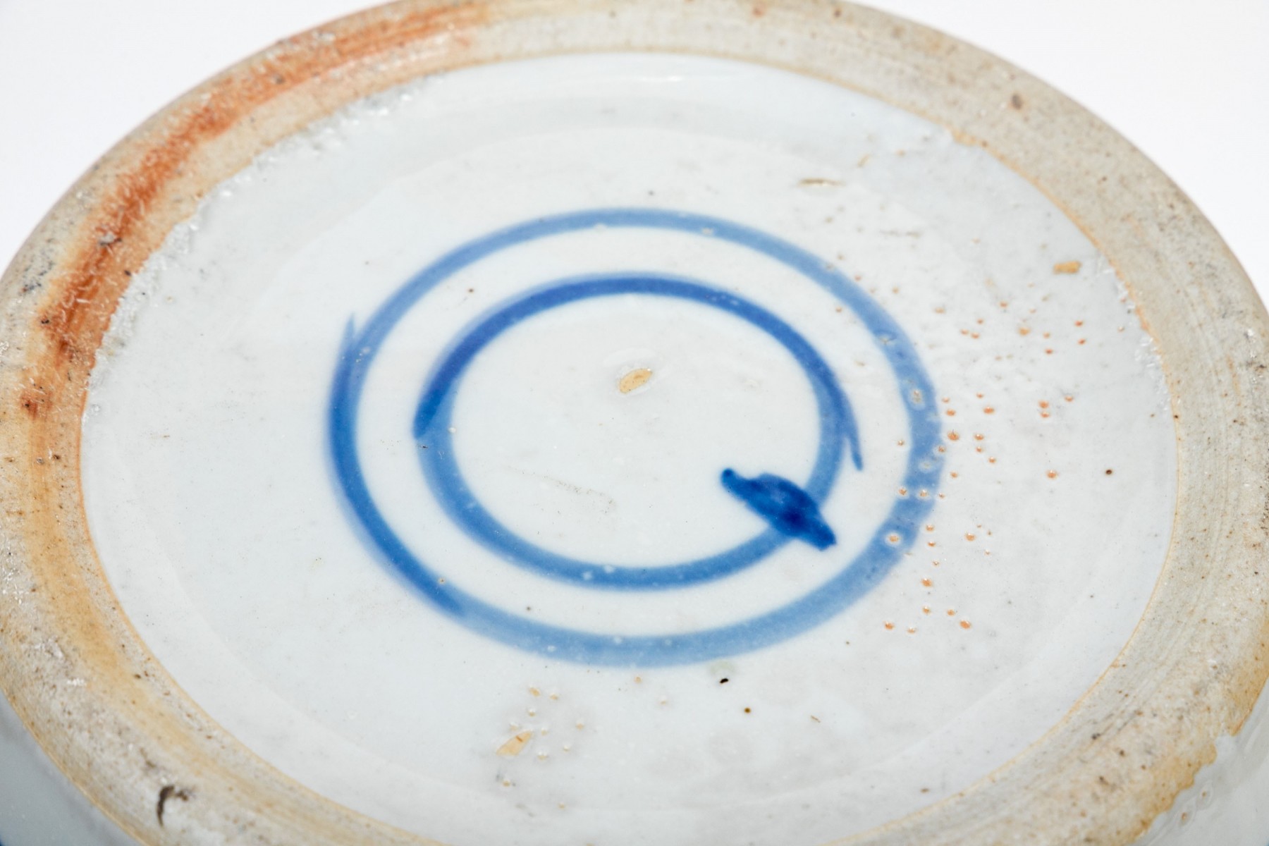 A blue and white jar with floral and symbol decoration. Lacking a lid.