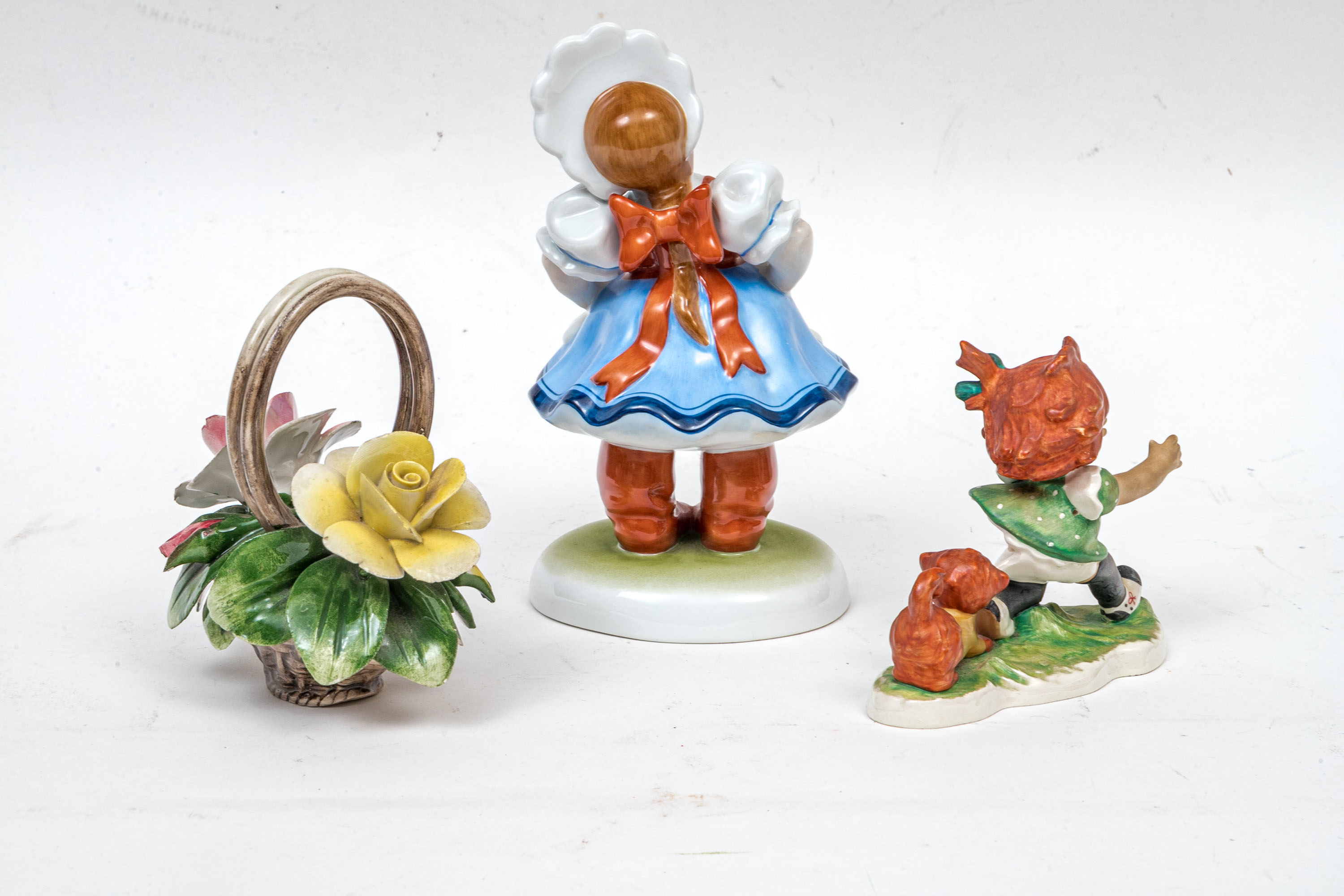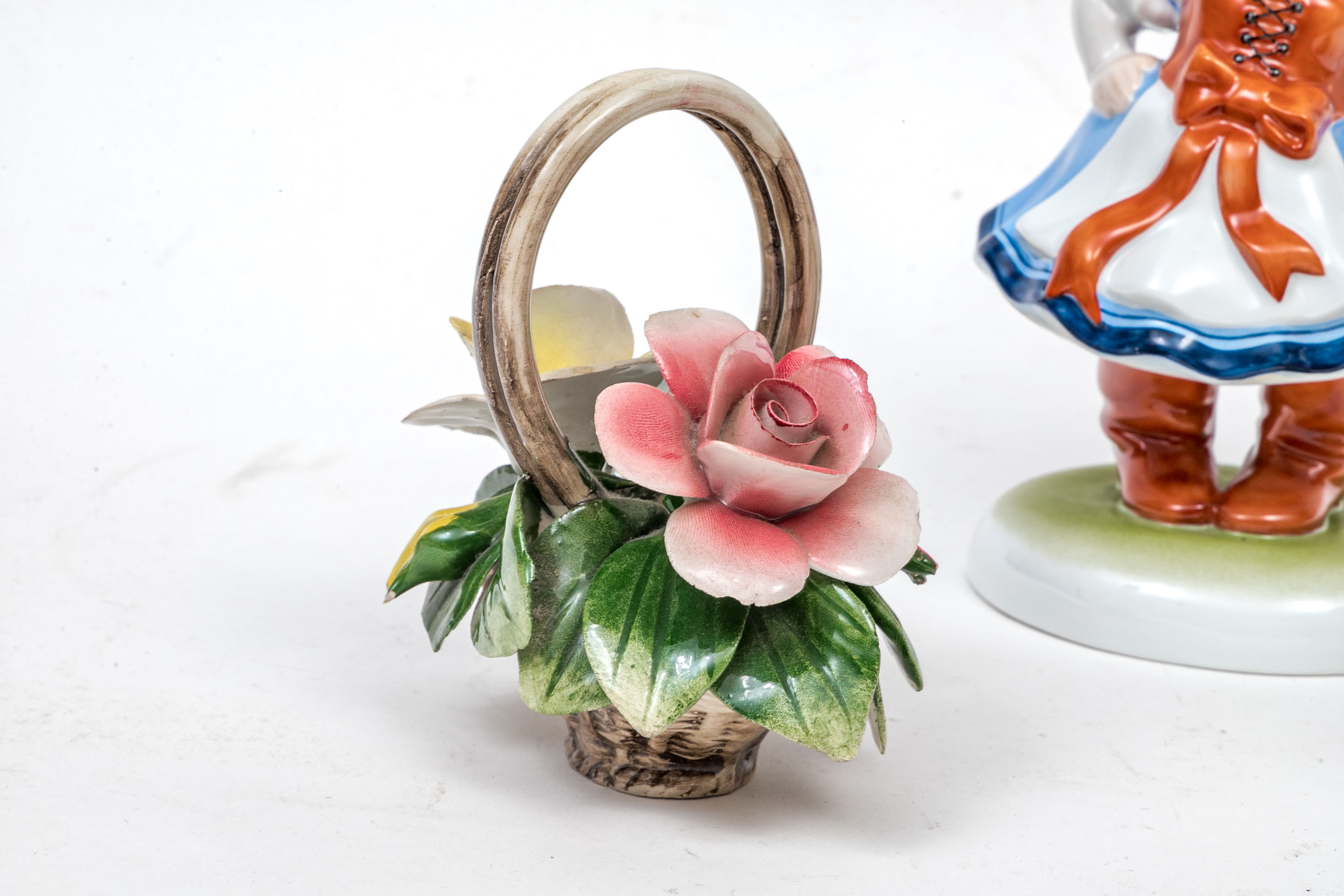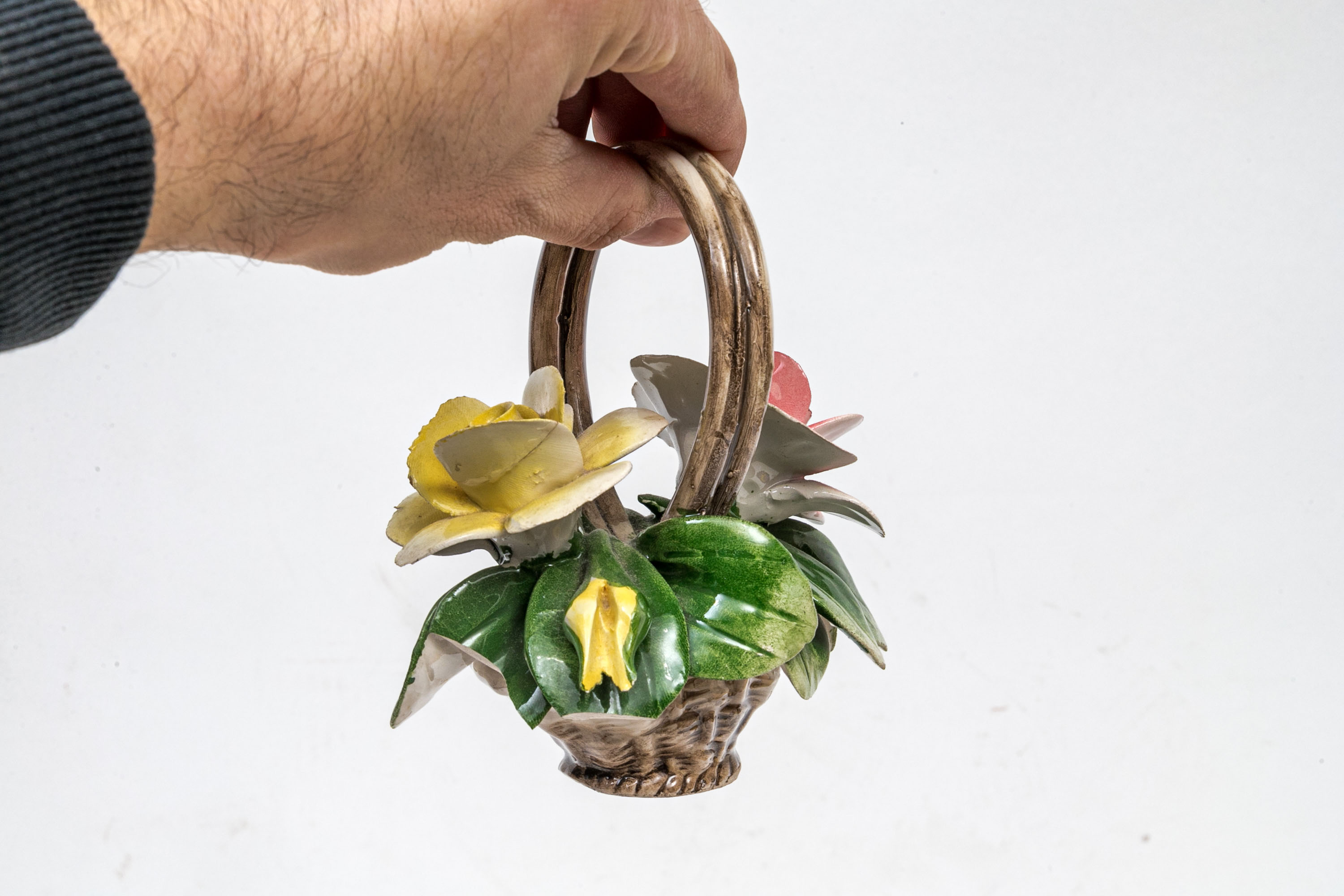 and a Capodimonte basket of pink and yellow roses, 5 3/4" H, chipped losses to two green leaves, tiny chips to rose petals and one leaf