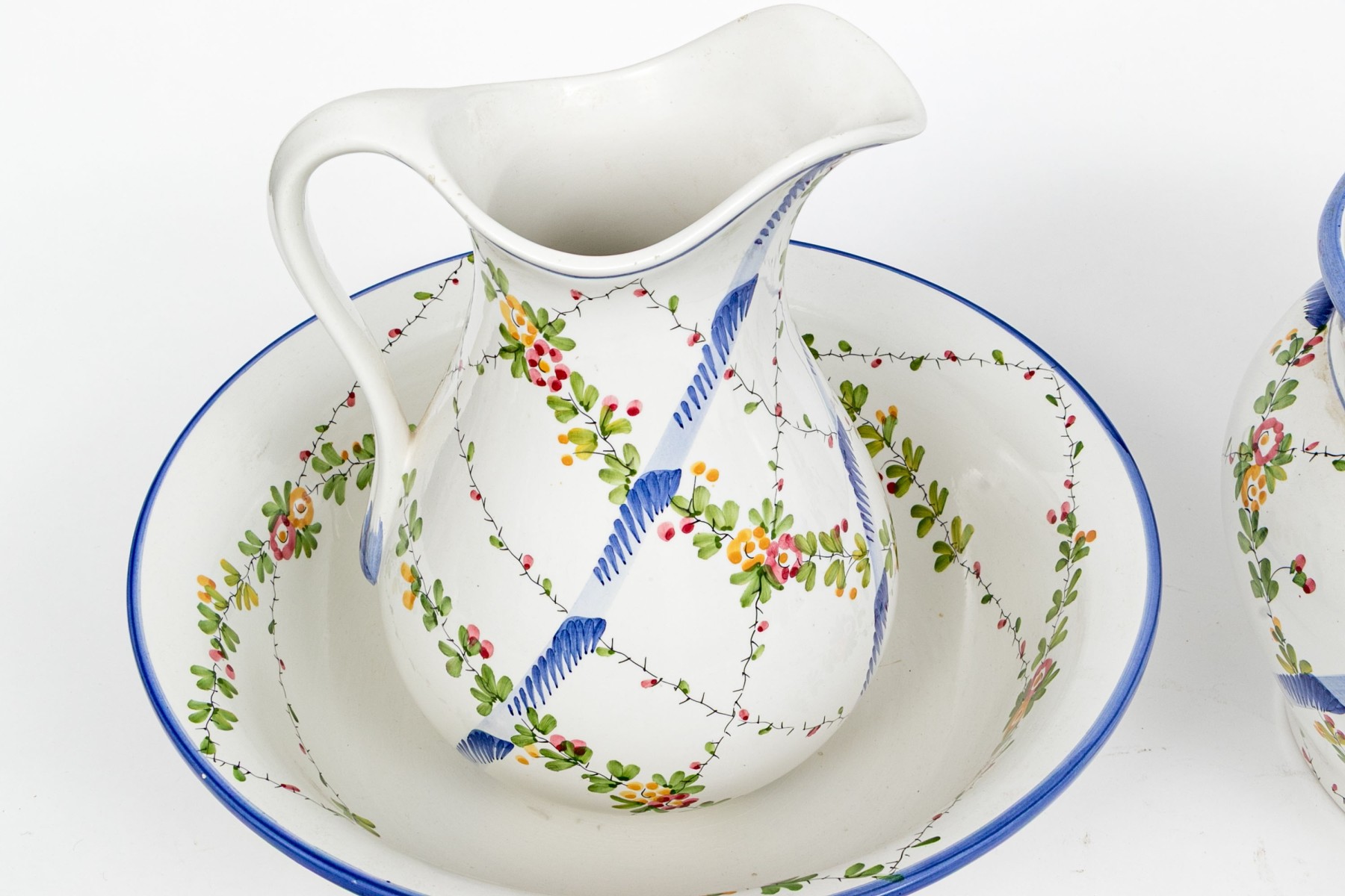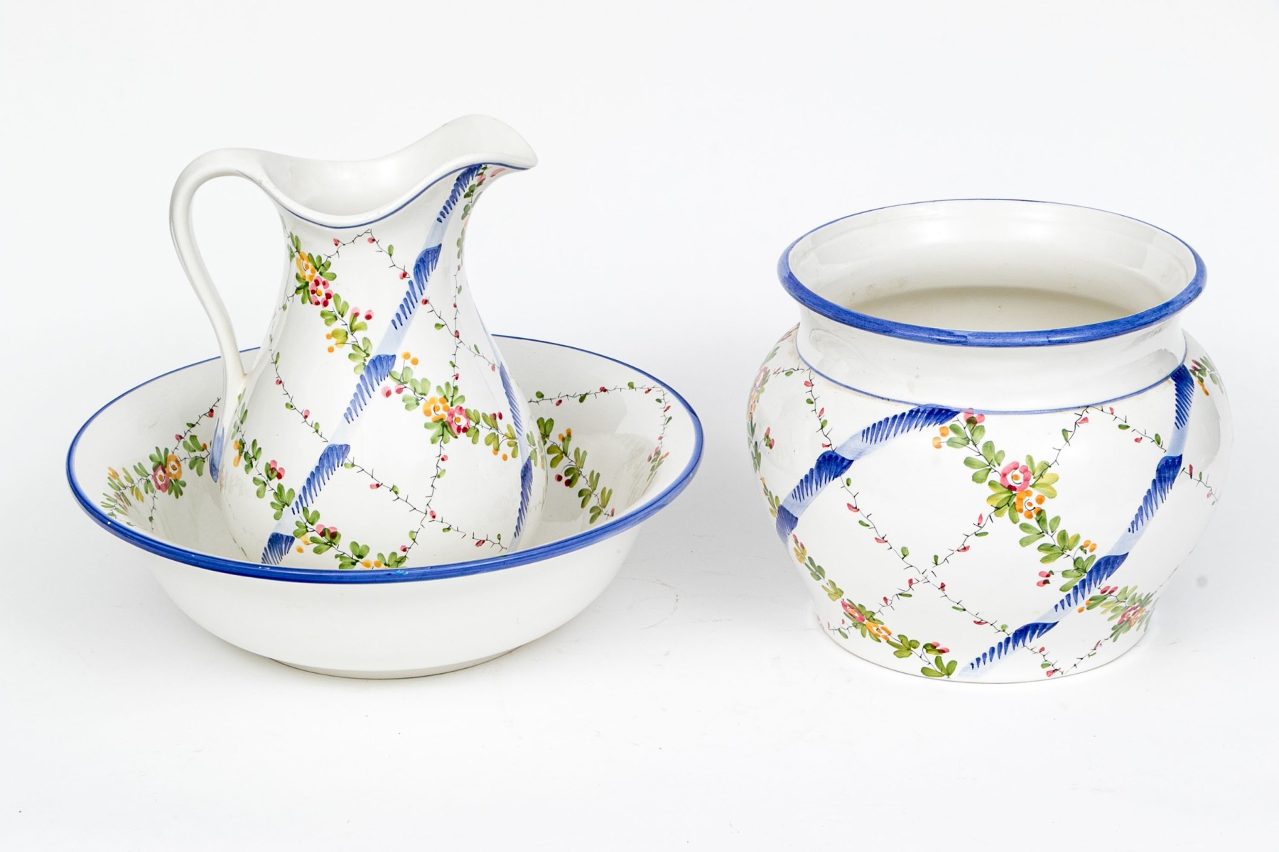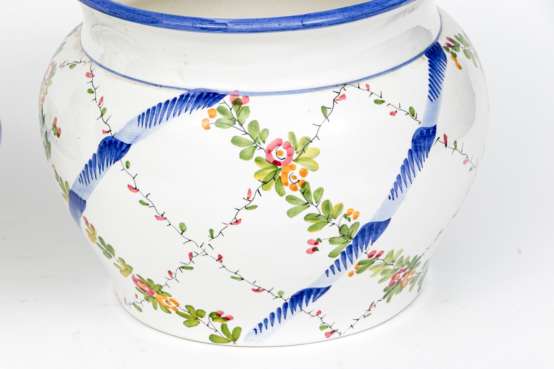 A delightful trio of Italian ceramics in matching design. Includes a water pitcher and basin, and a jardiniere or cache pot. All glazed bright white with pretty hand-detailed lattices of flowering vines and blue bands.