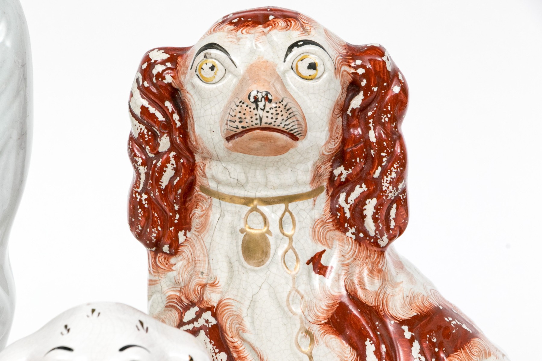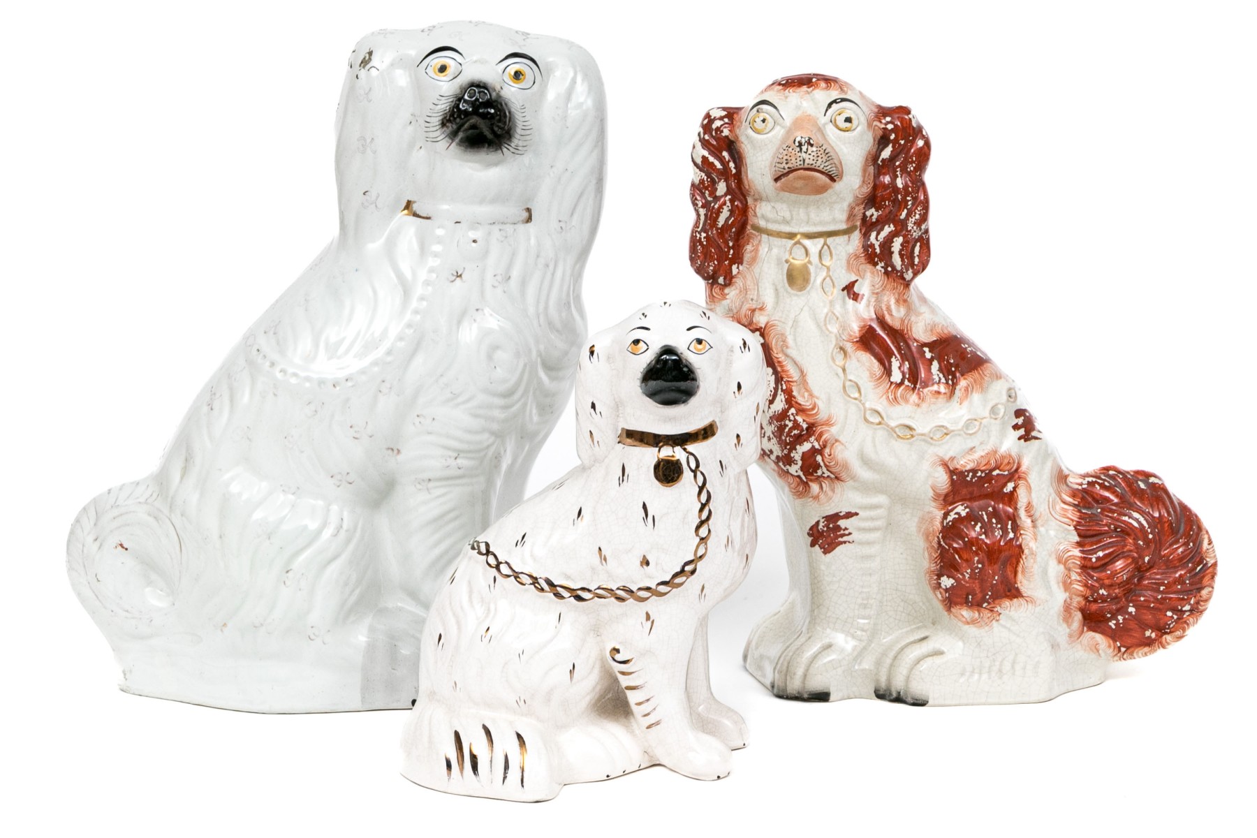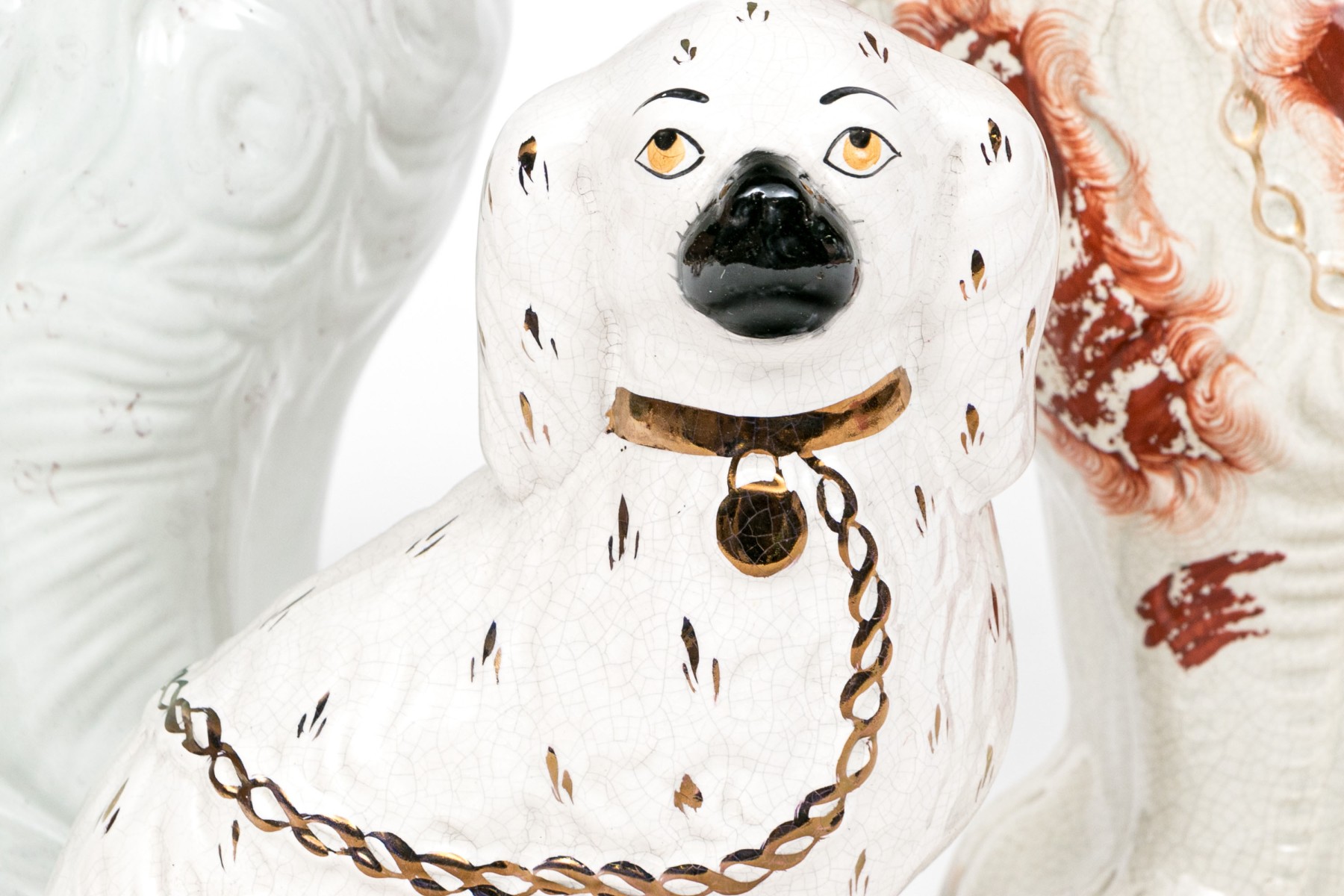Along with a large white and red painted dog with gilt and black details, crackle glaze overall