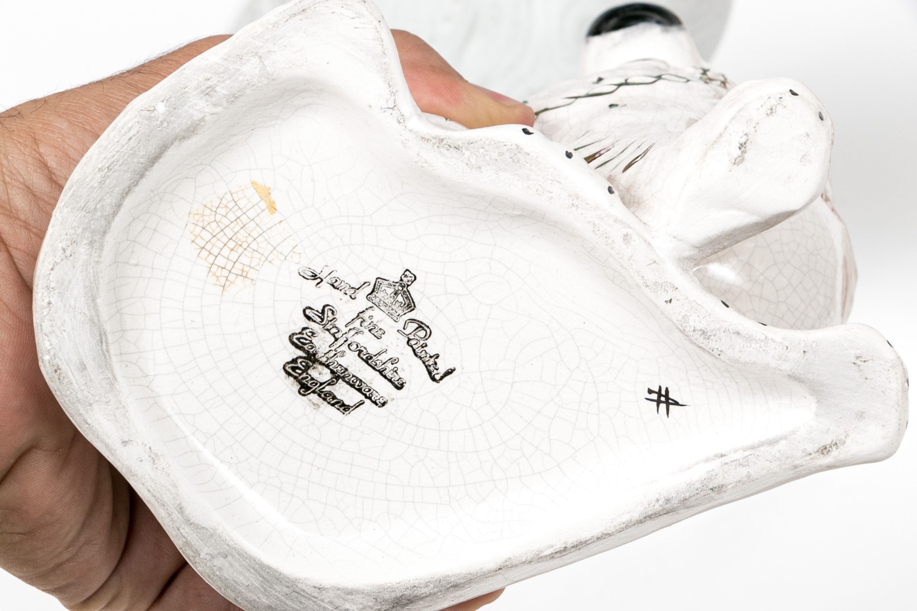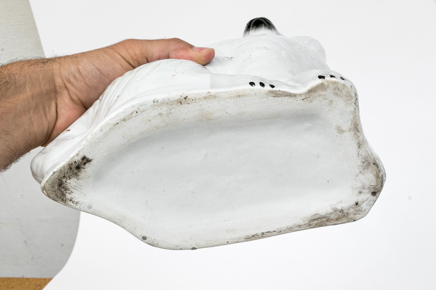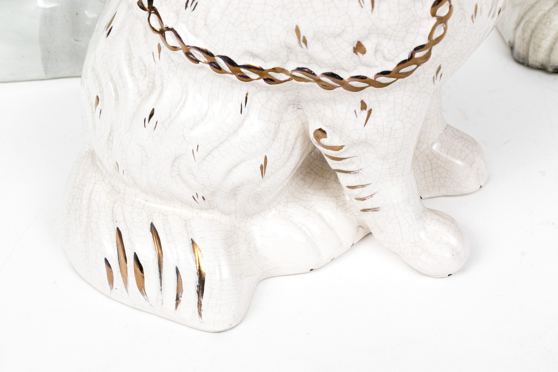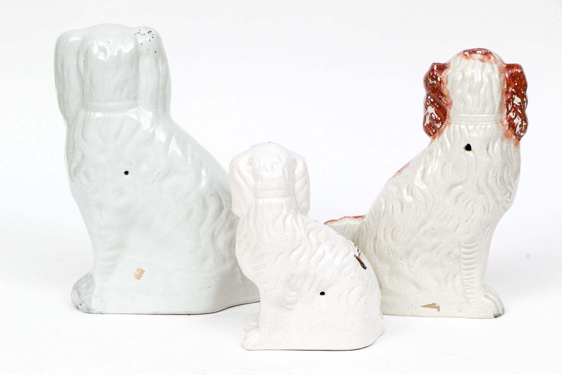 Along with a large white and red painted dog with gilt and black details, crackle glaze overall
