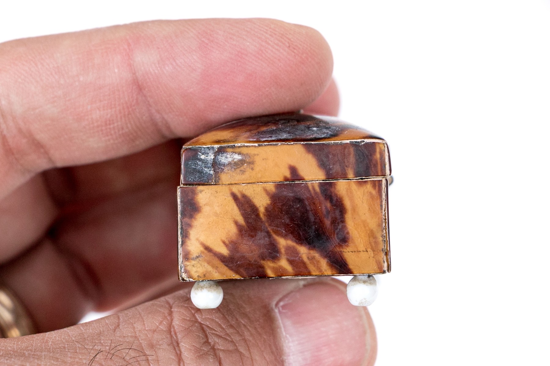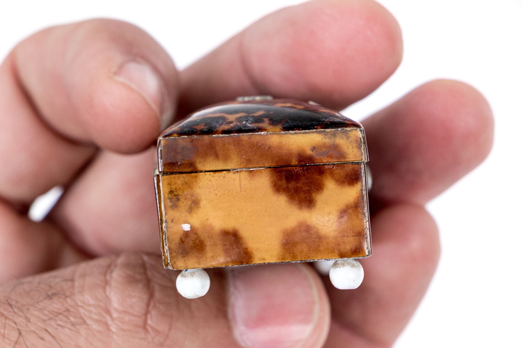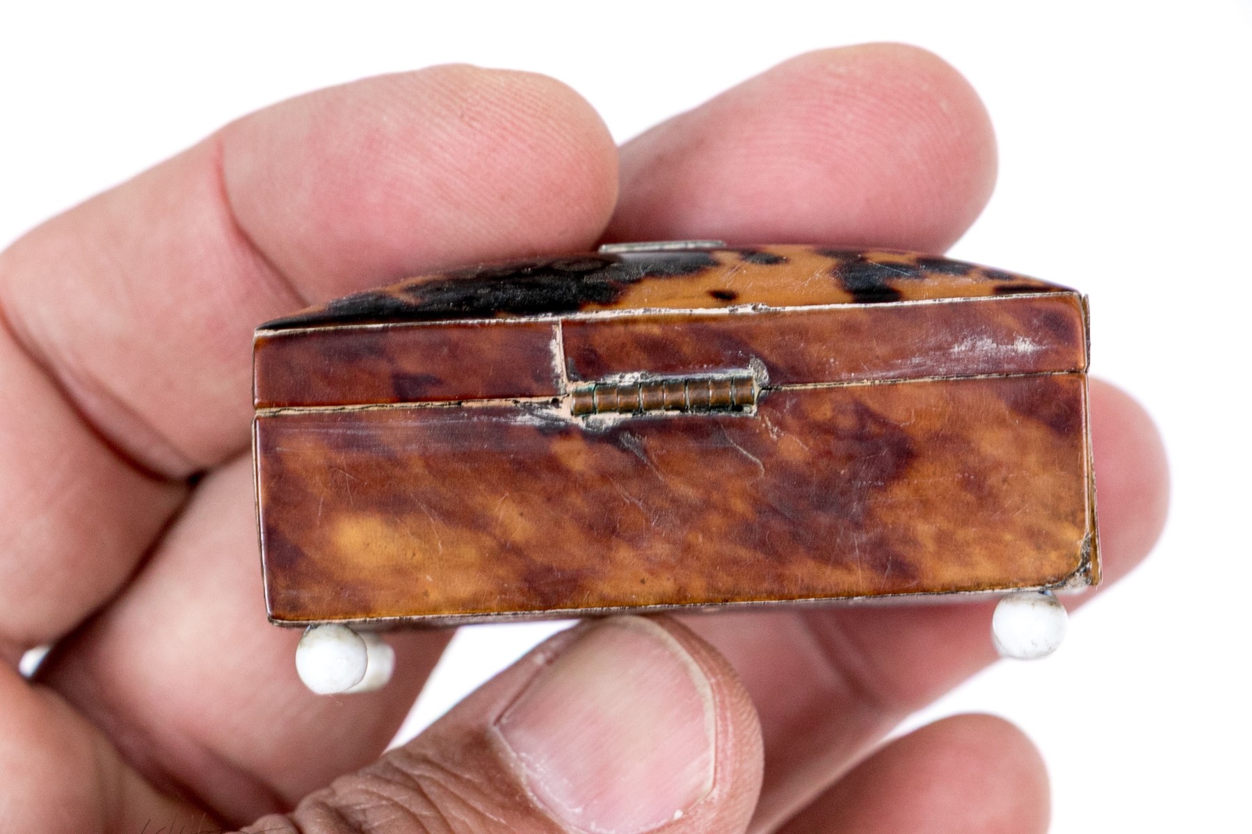 Along with a rectangular box with a hinged lid, silverplate details and raised on white ball feet.