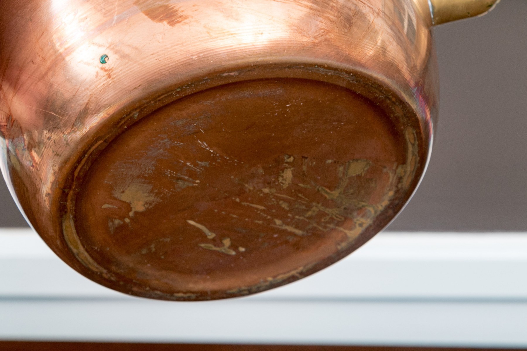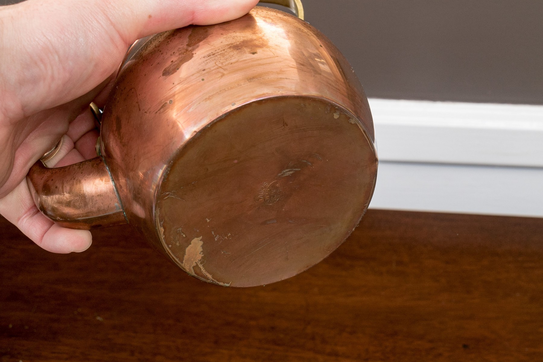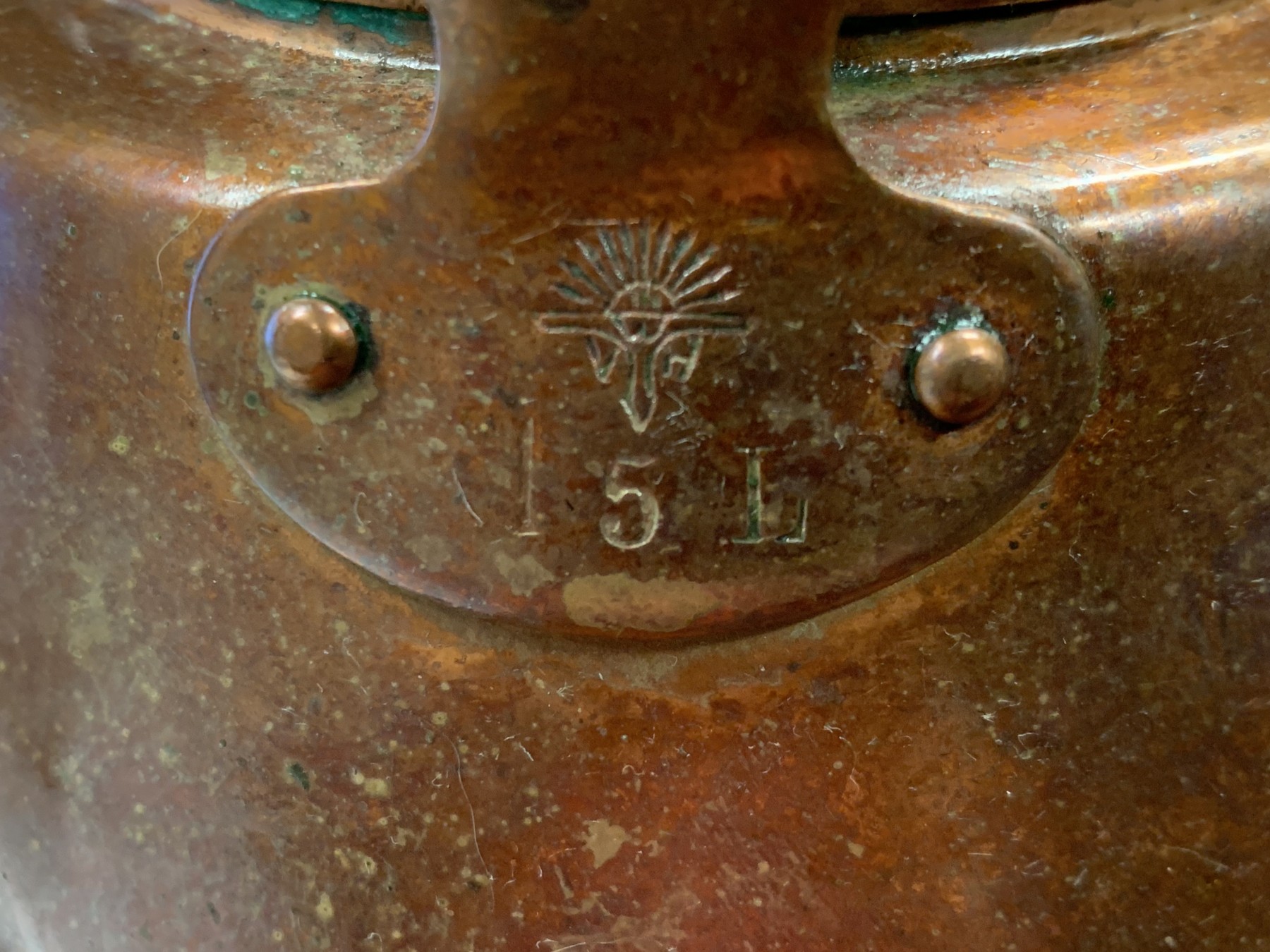 Medium, all copper with copper retracting handle, hallmarked on handle as shown.