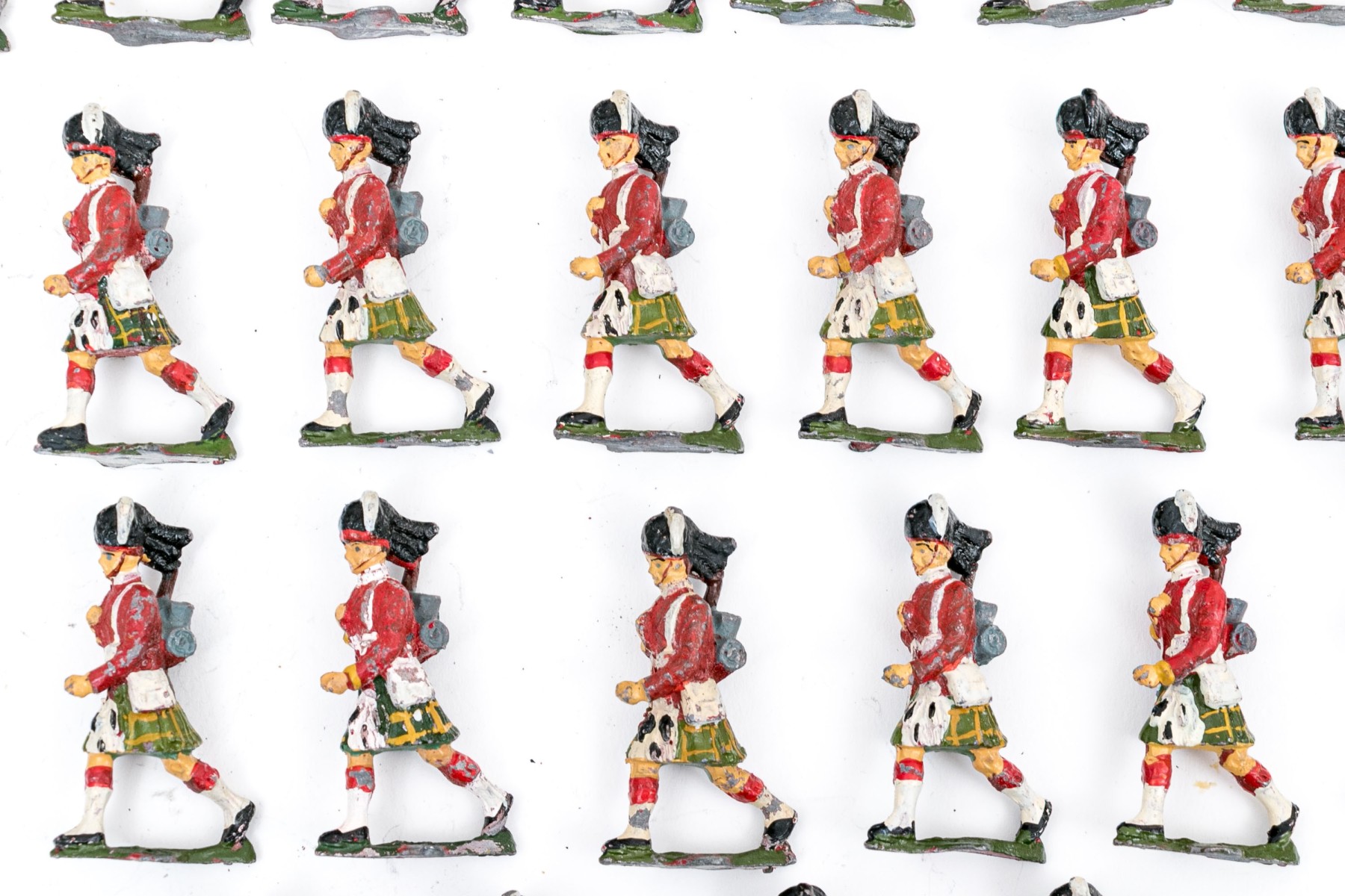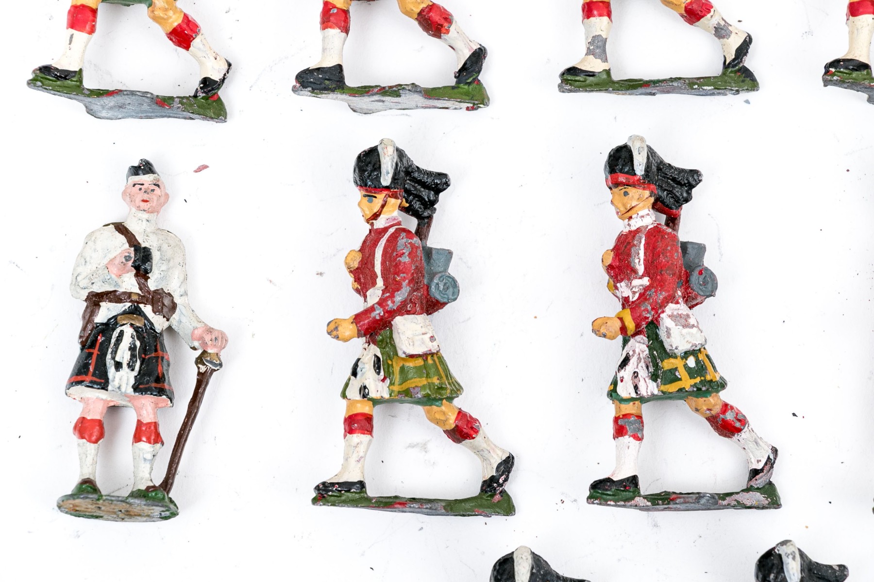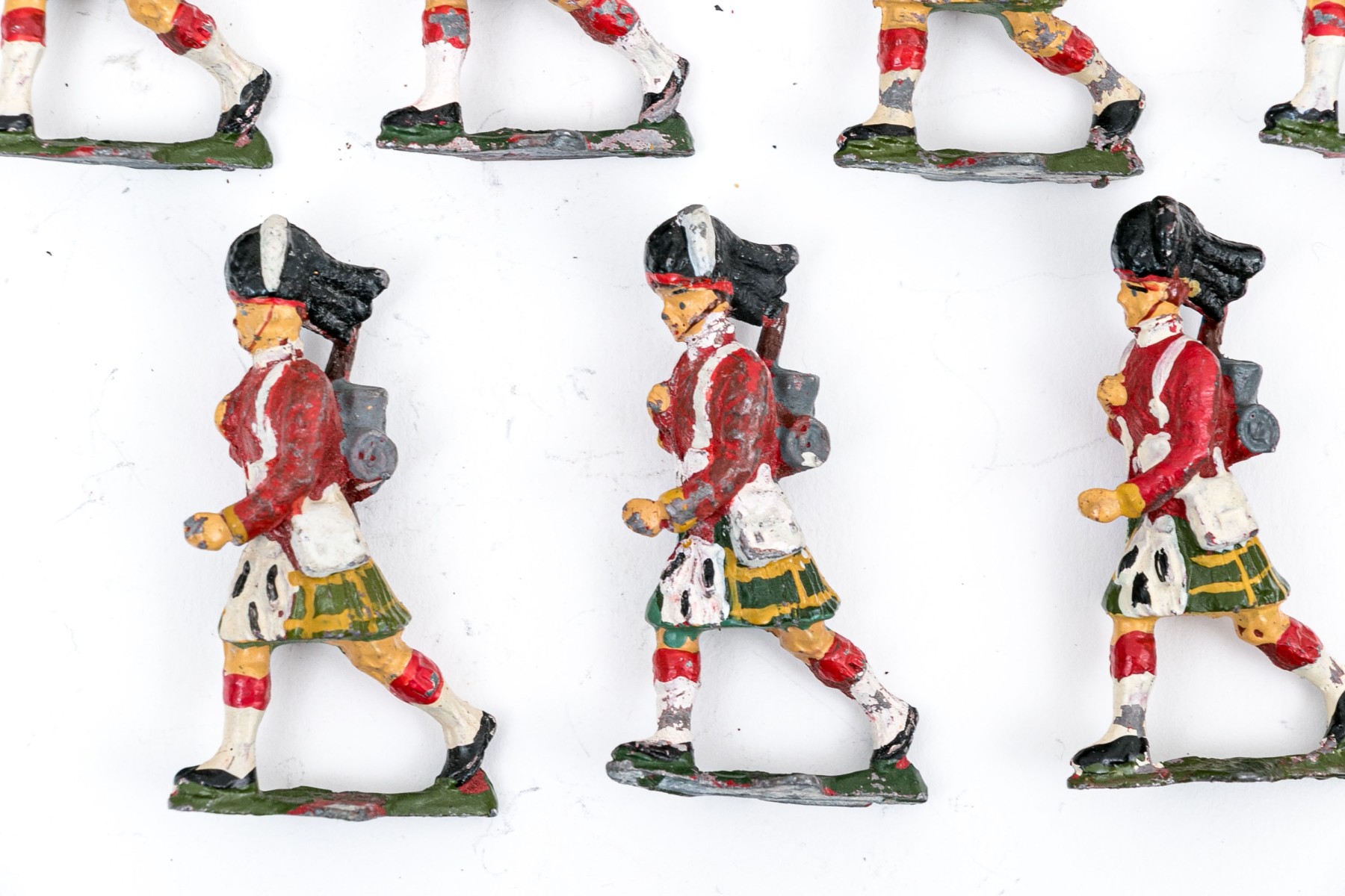 The British soldiers each have elaborate headdresses upon their helmets and red coats with green and yellow kilts. One figure with white coat and blue and red kilt.