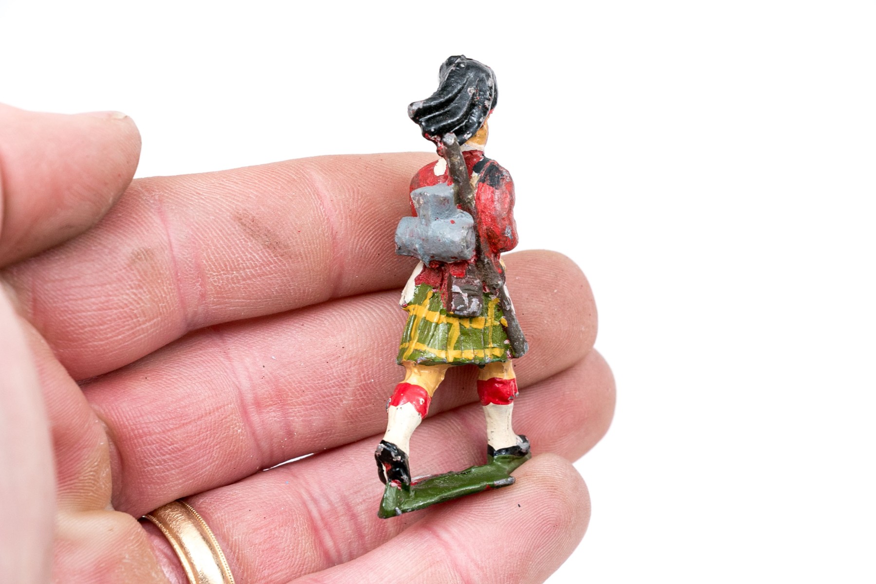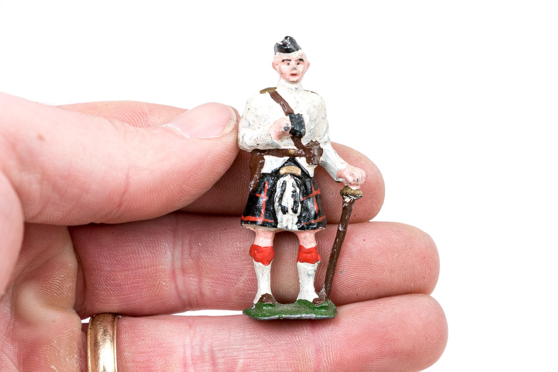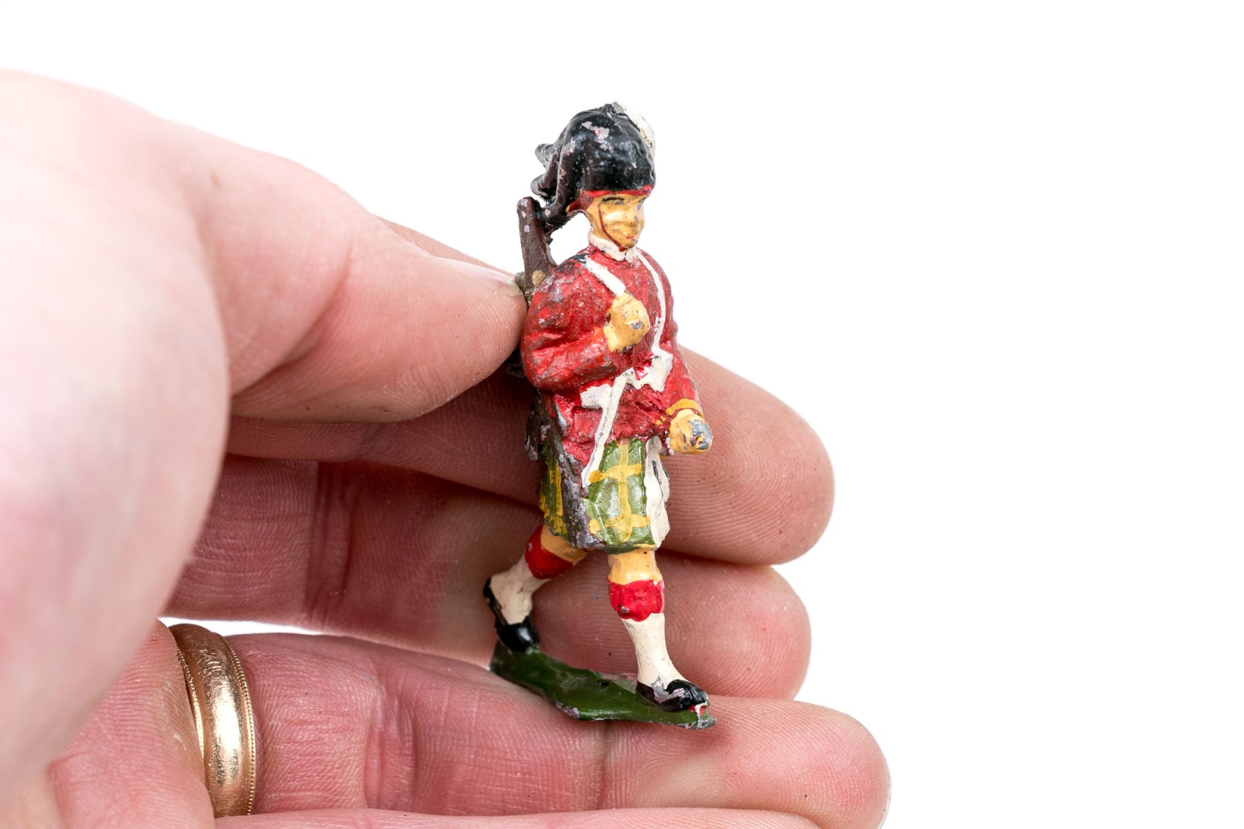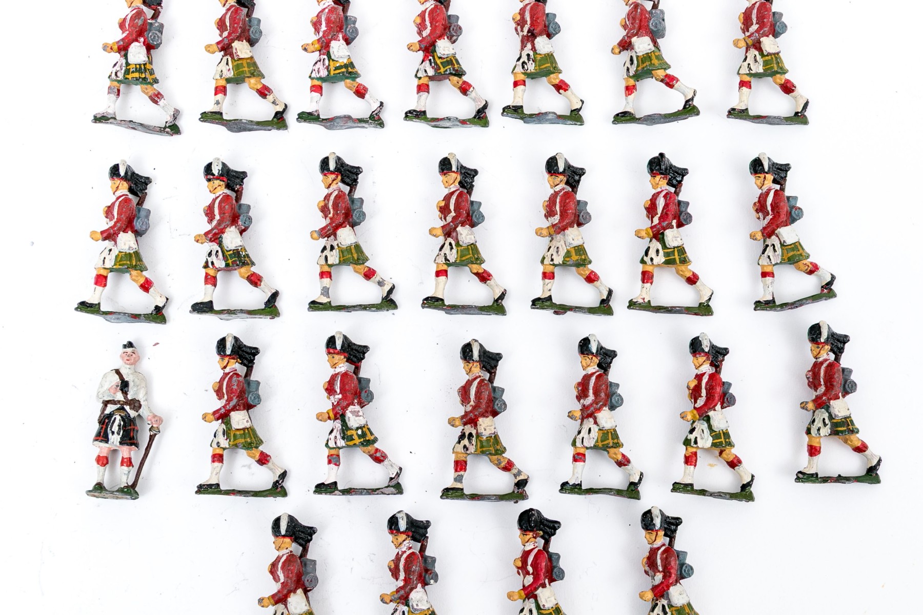 The British soldiers each have elaborate headdresses upon their helmets and red coats with green and yellow kilts. One figure with white coat and blue and red kilt.
