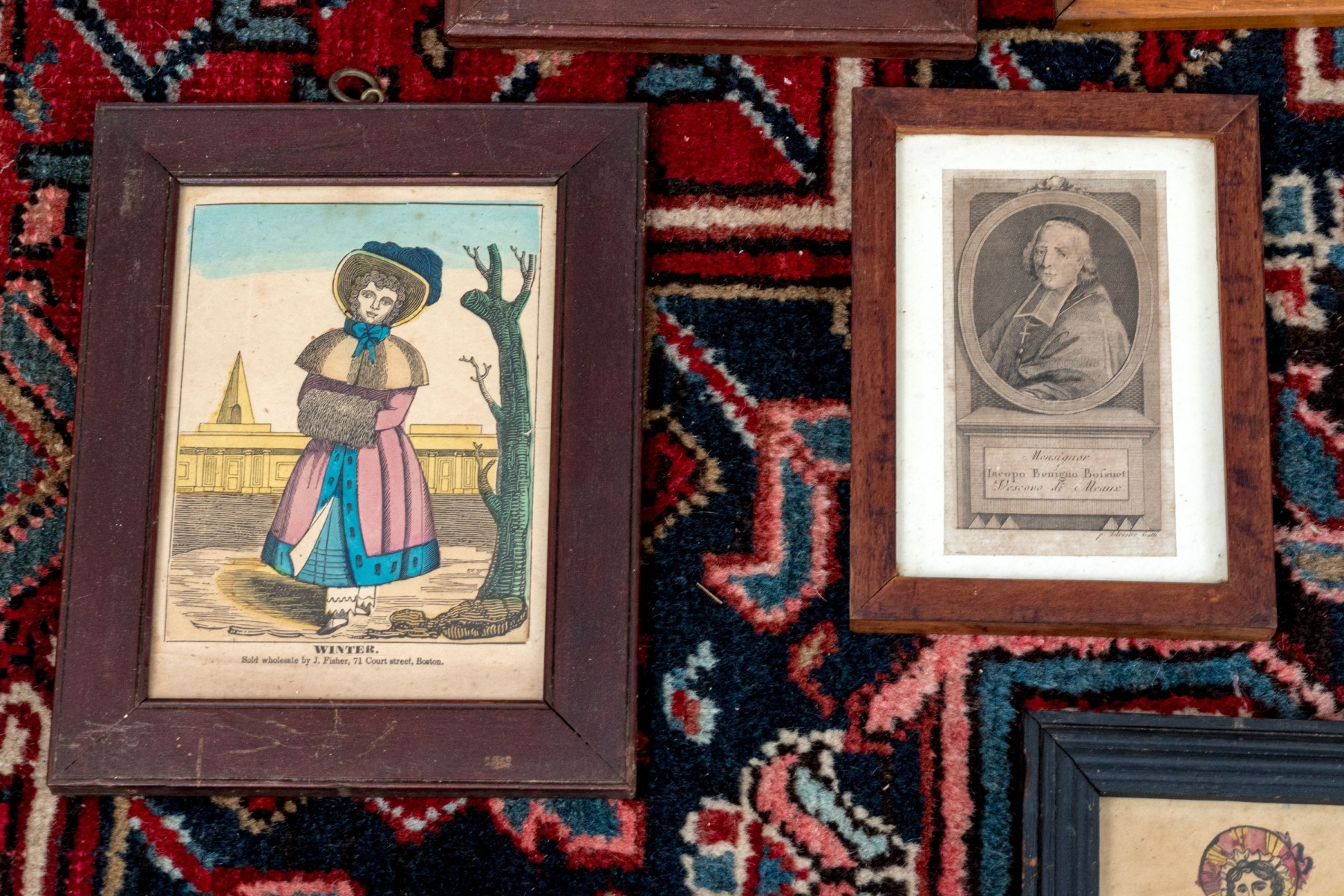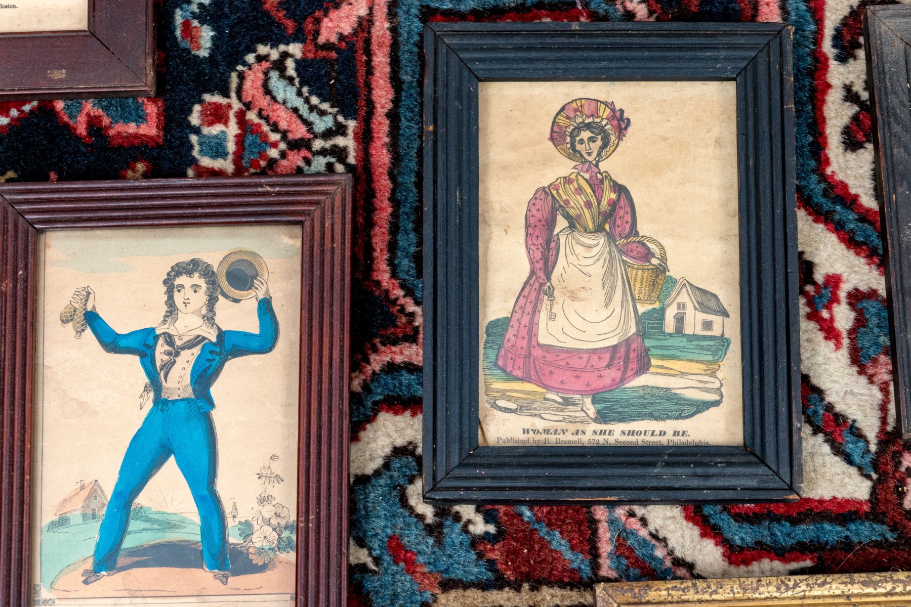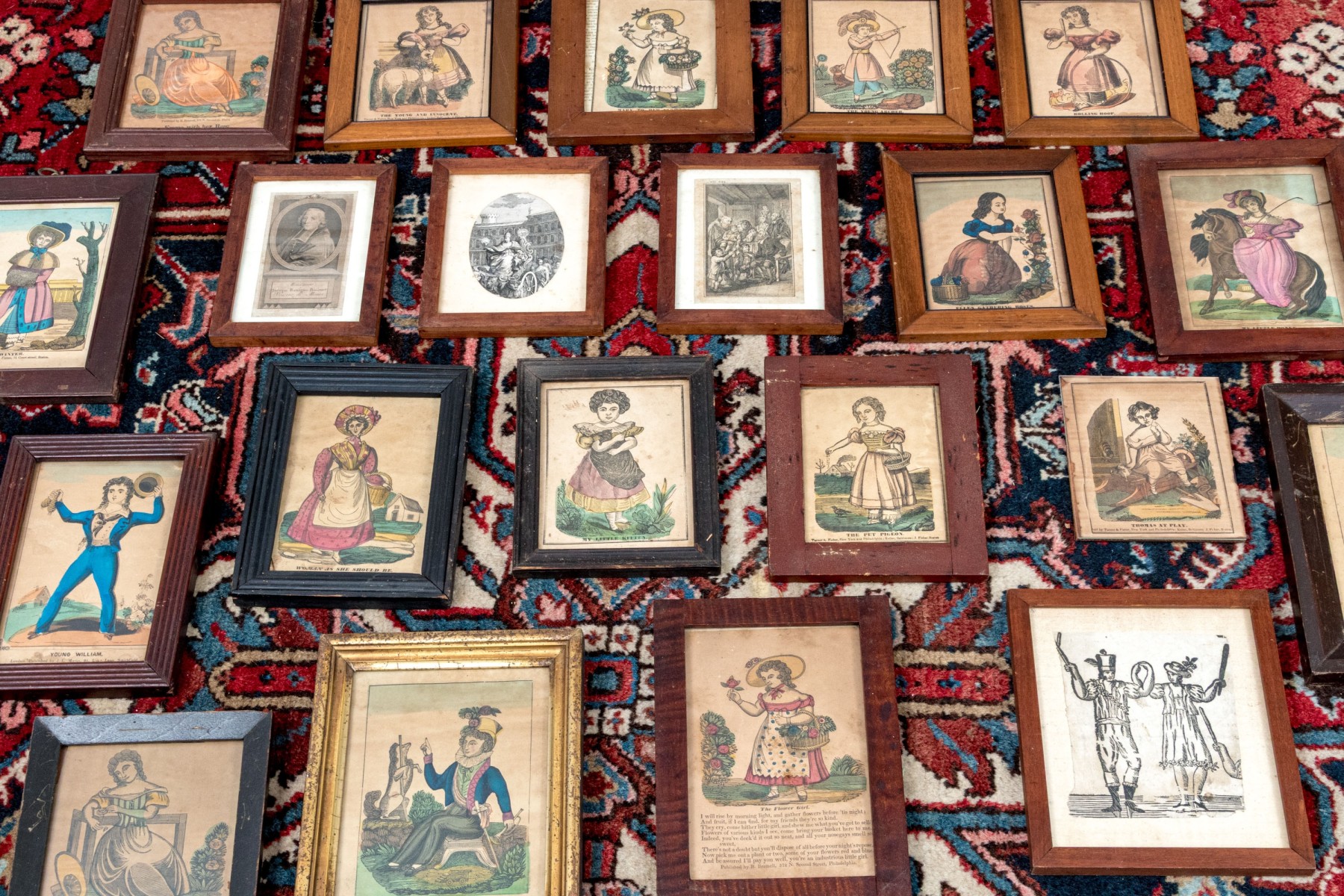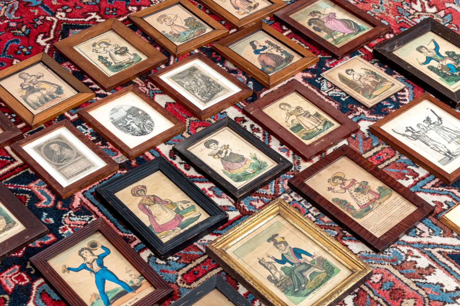 An excellent assortment of twenty-four antique hand-colored prints depicting various figures in fashionable attire, all framed. most all are hand colored.