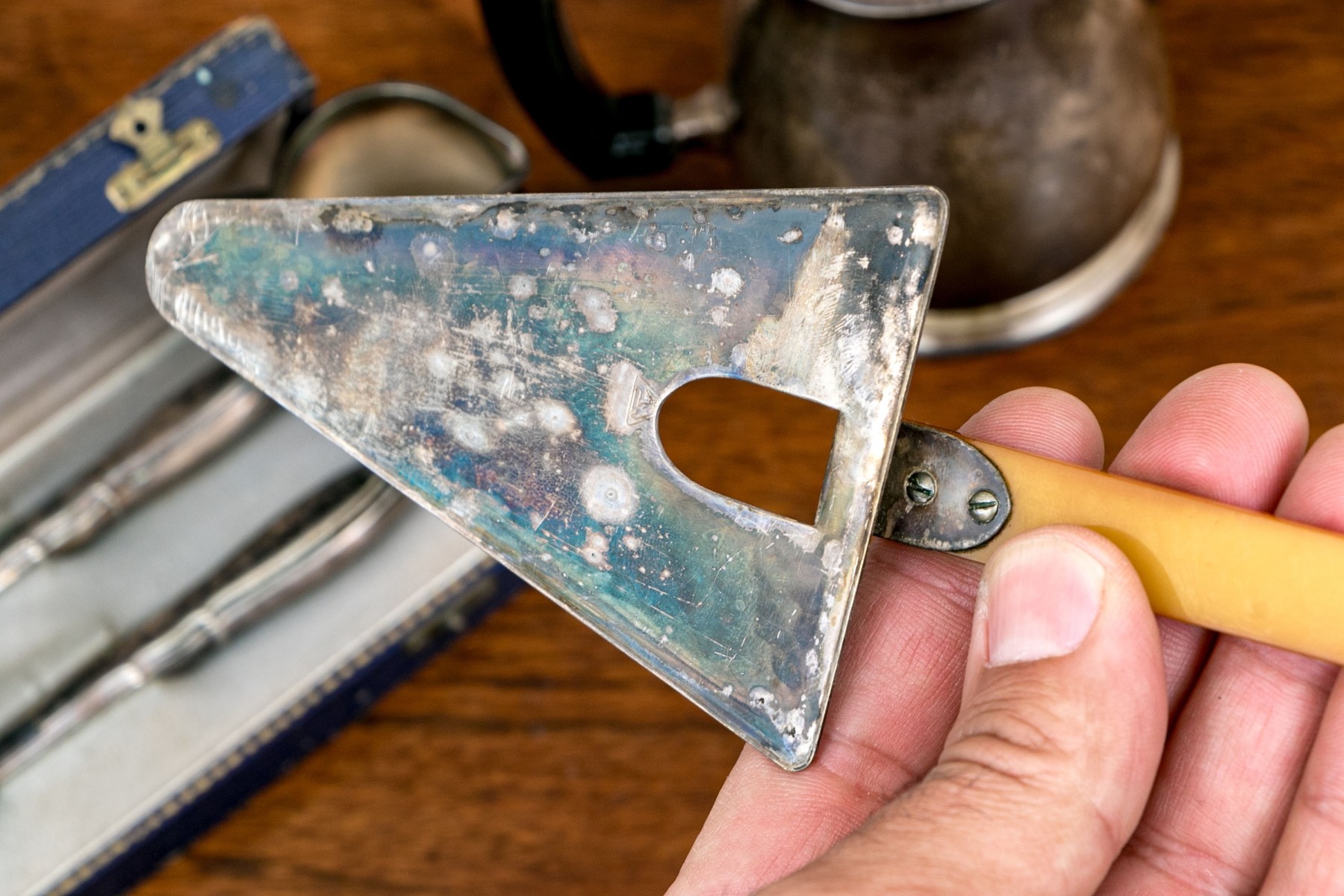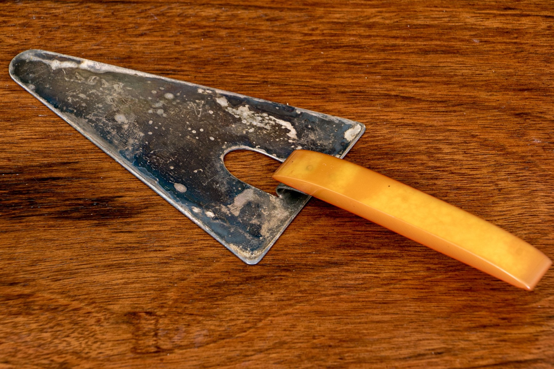 - A faux amber, resin handled triangular cheese slice