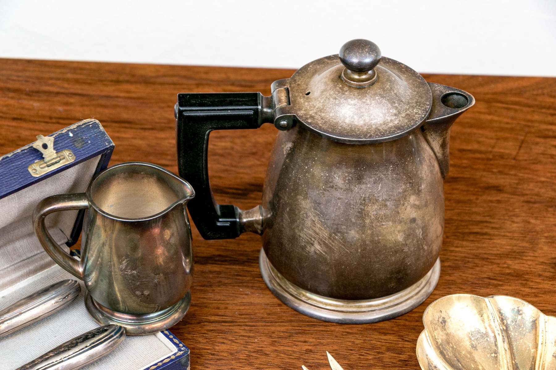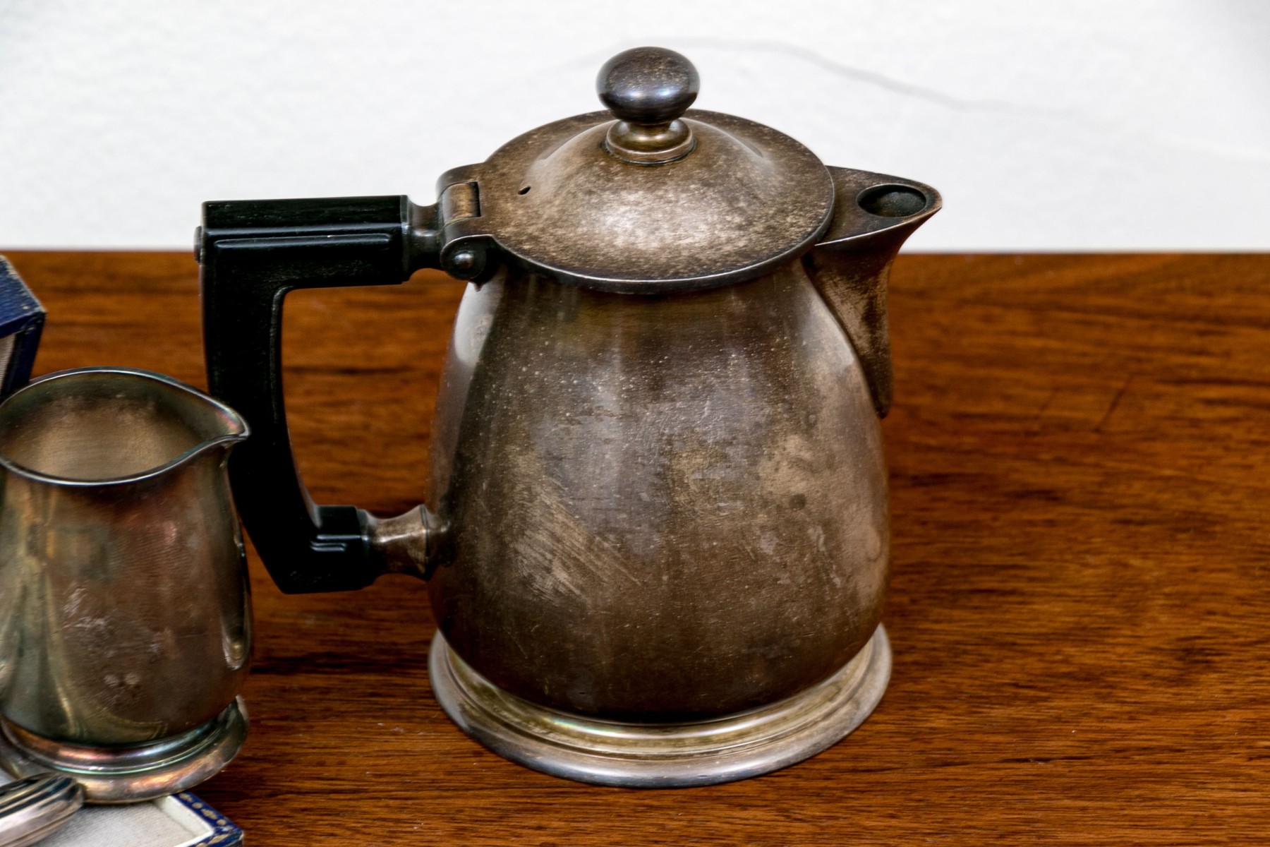 - A creamer with hinged lid and black handle and finial.