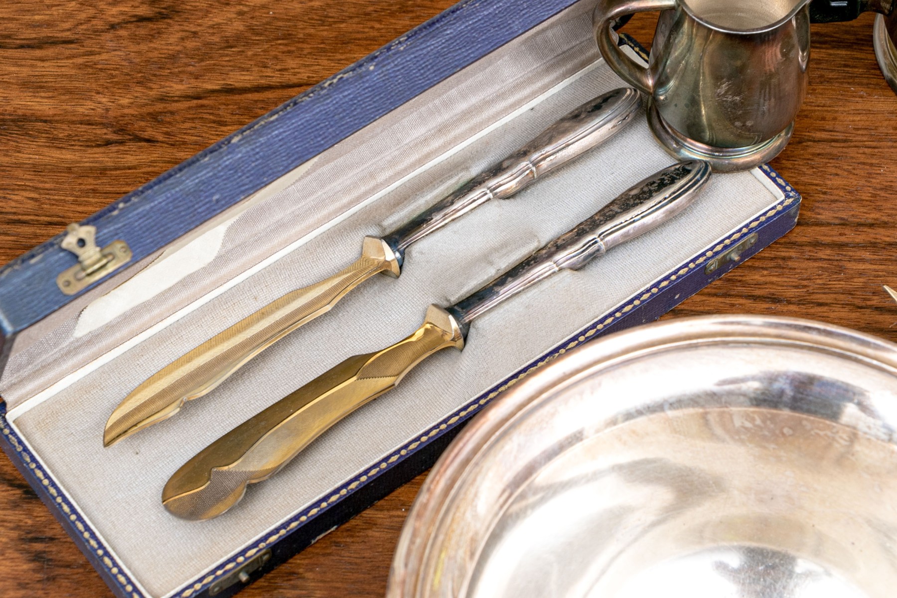 - Two gilt bladed serving knives in a leather case, marked "Moritz, Stumpf & John / Hofiuweliere / Dunzig / Langgasse 29/30."