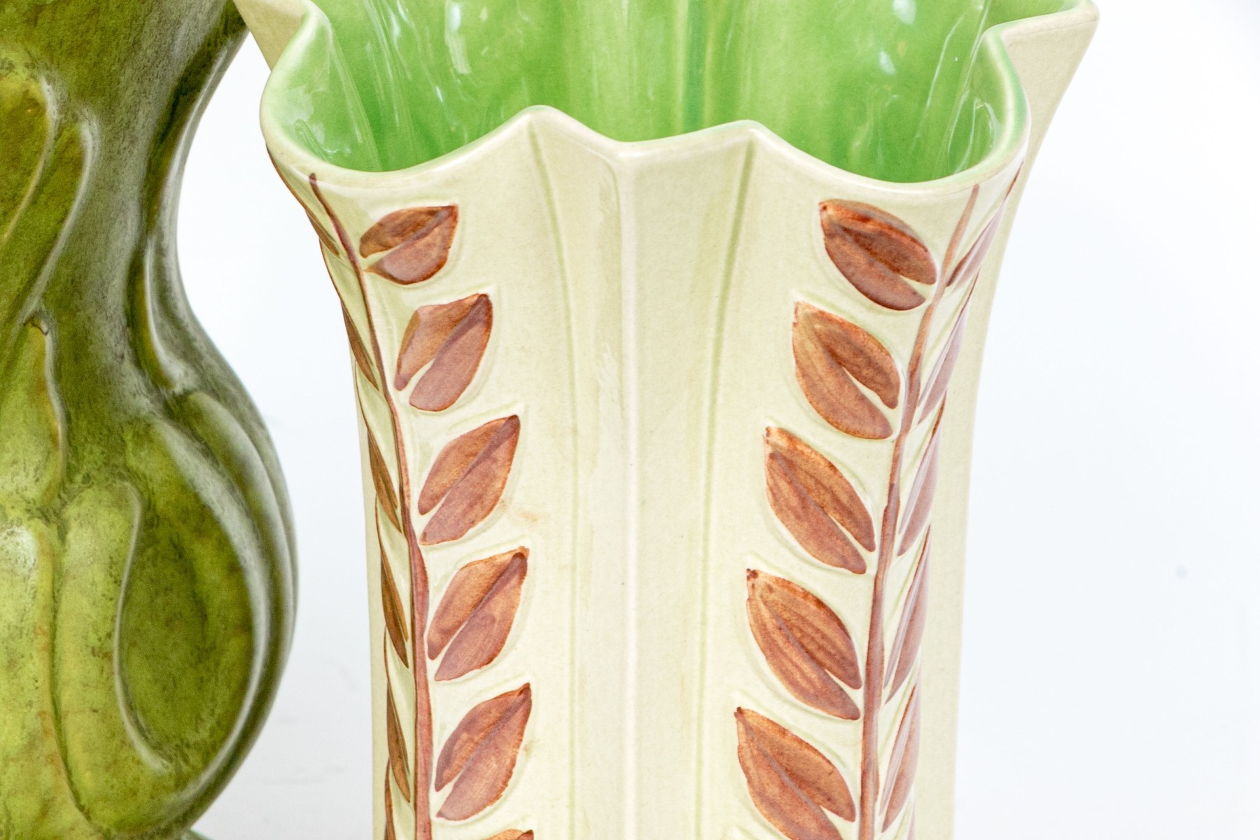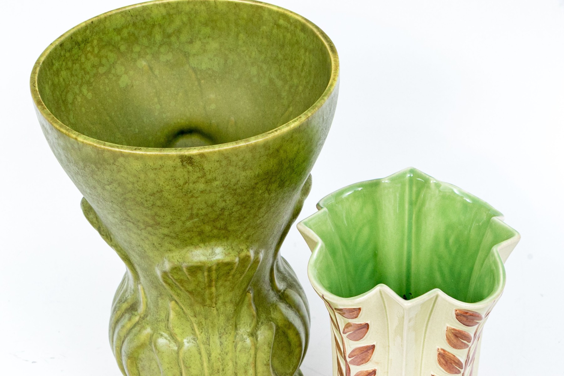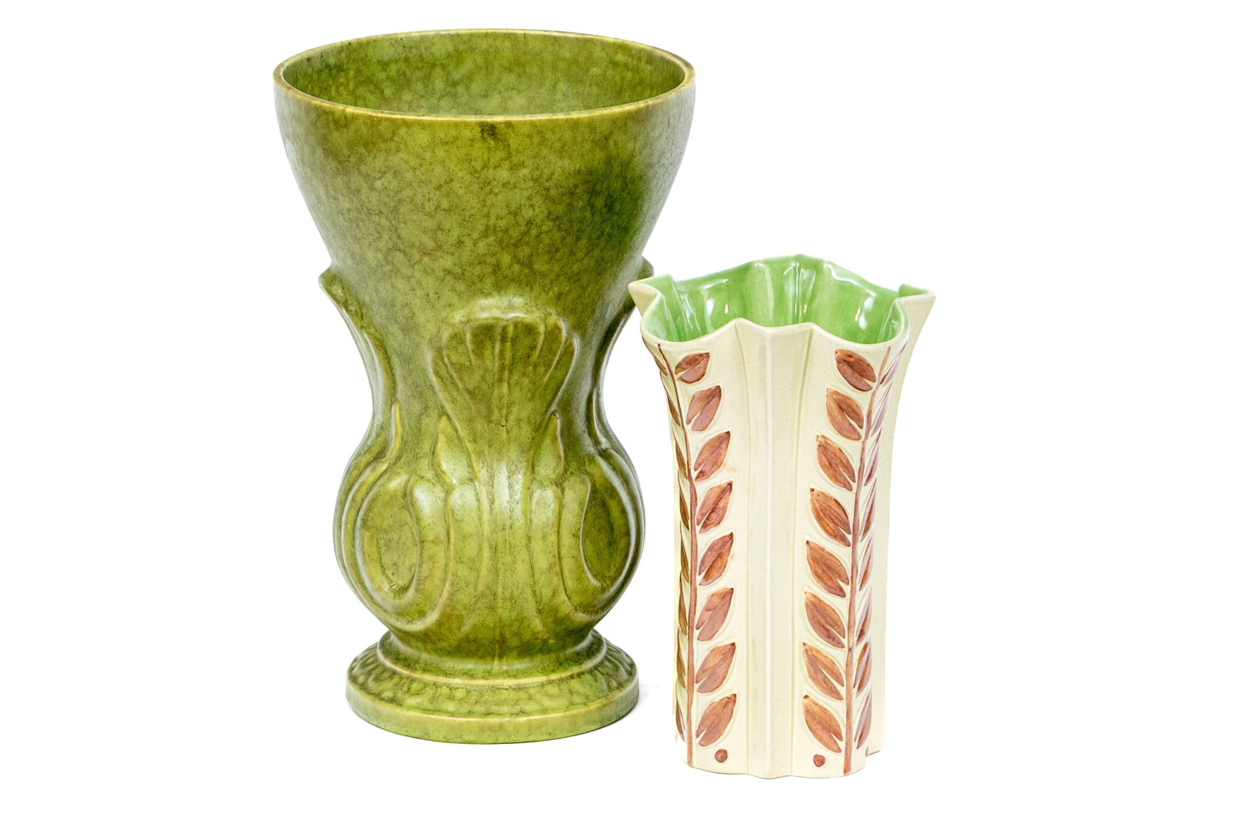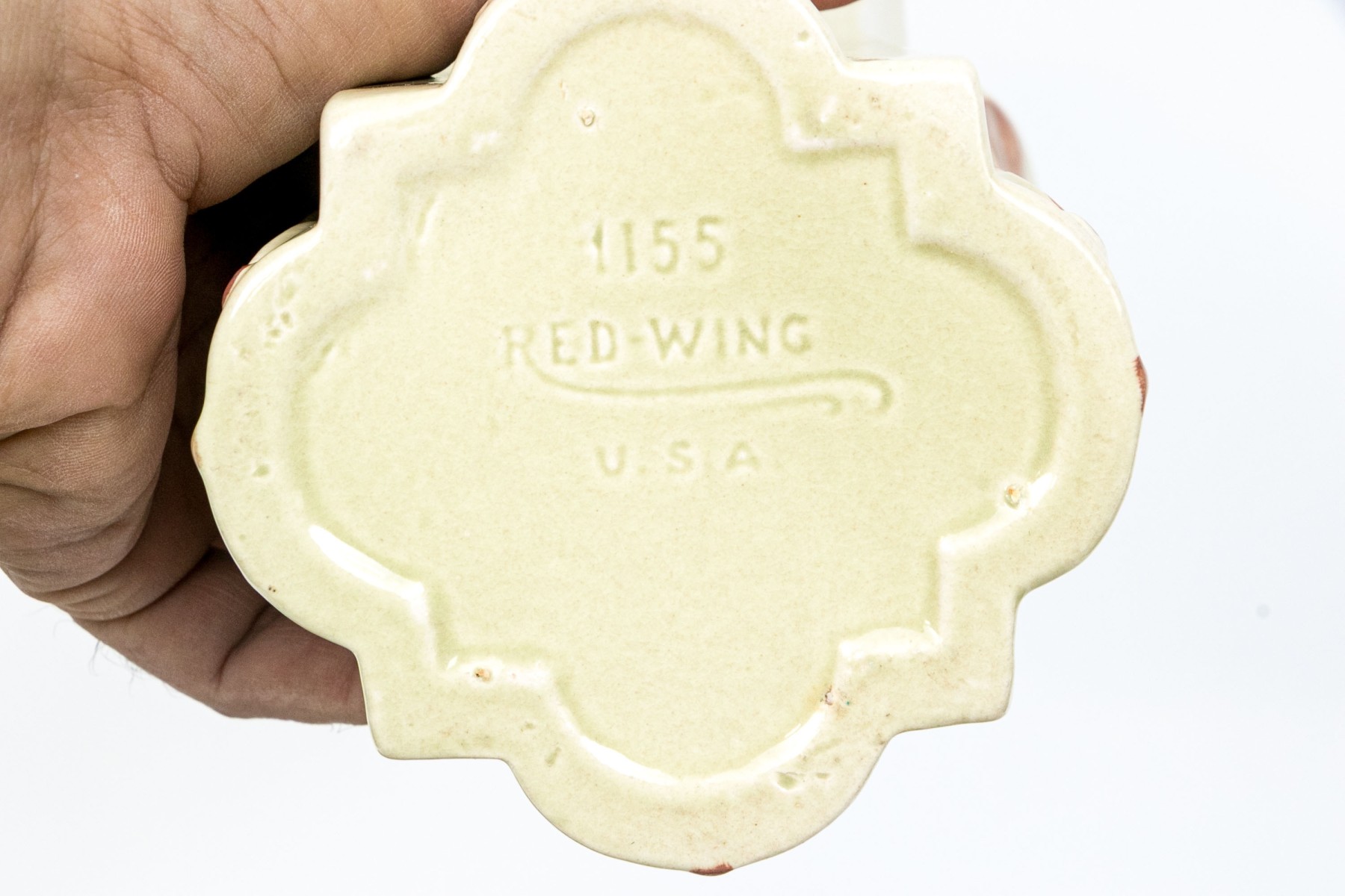 - Trumpet vase with barbed and scalloped mouth with foliate motifs, marked Red-Wing underfoot.