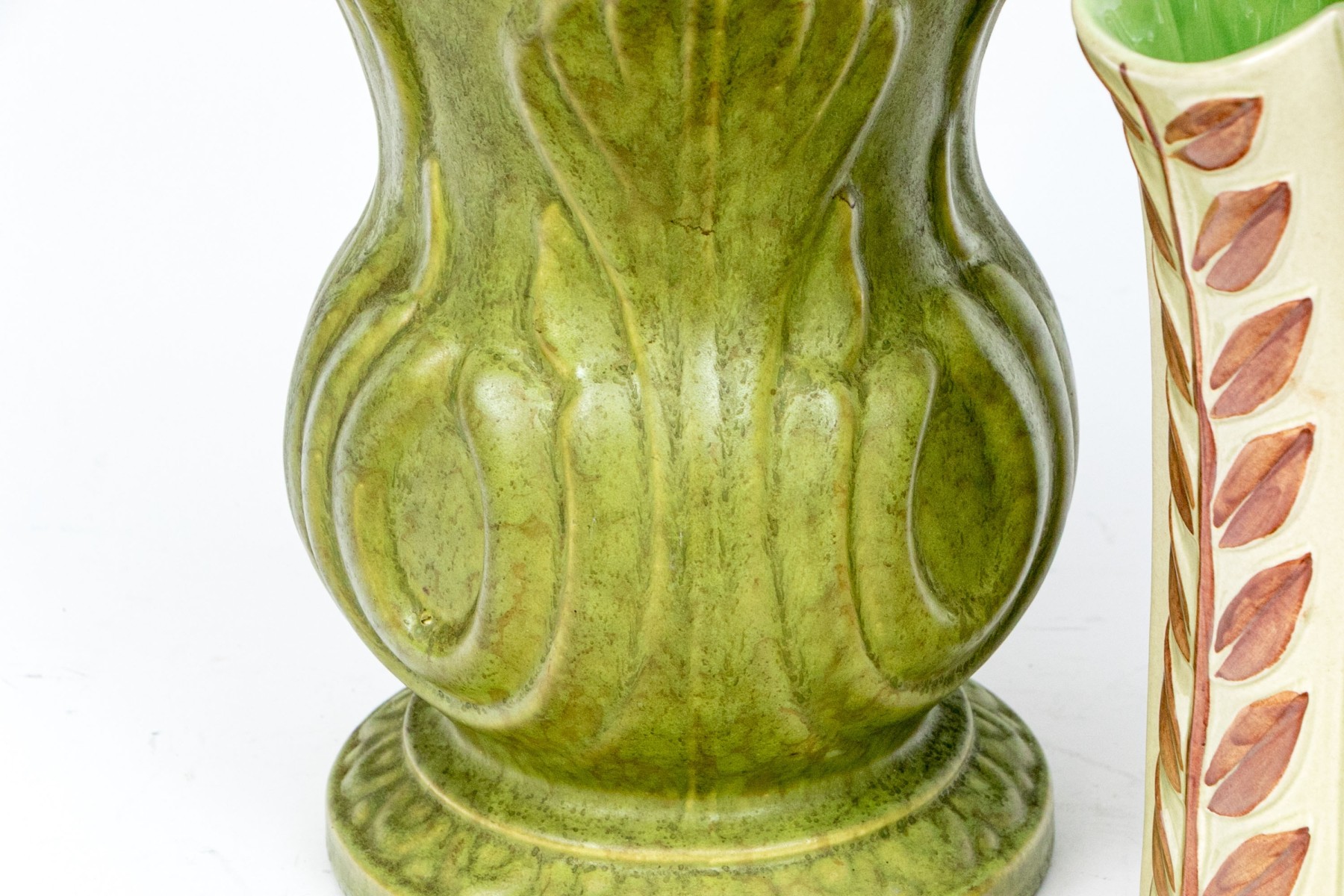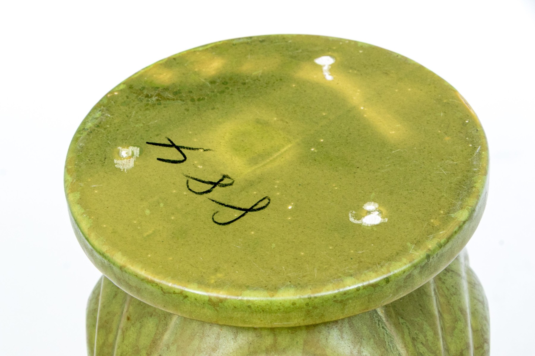 - Green finished ceramic vase, with moulded decoration on a circular foot.