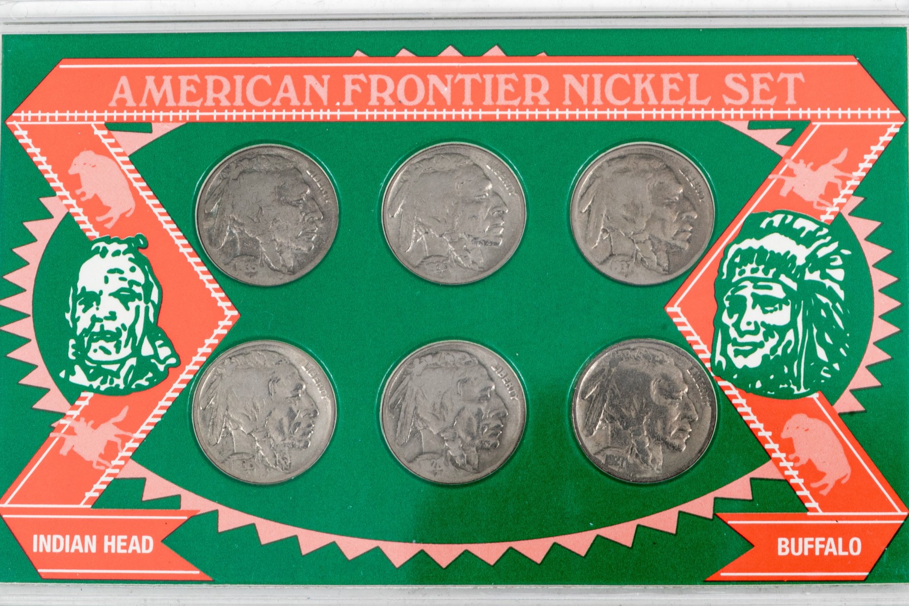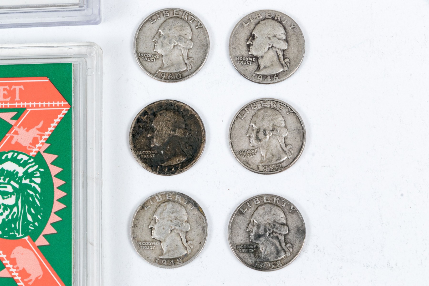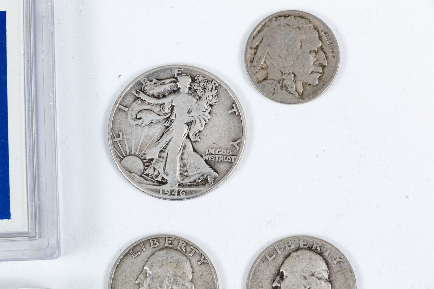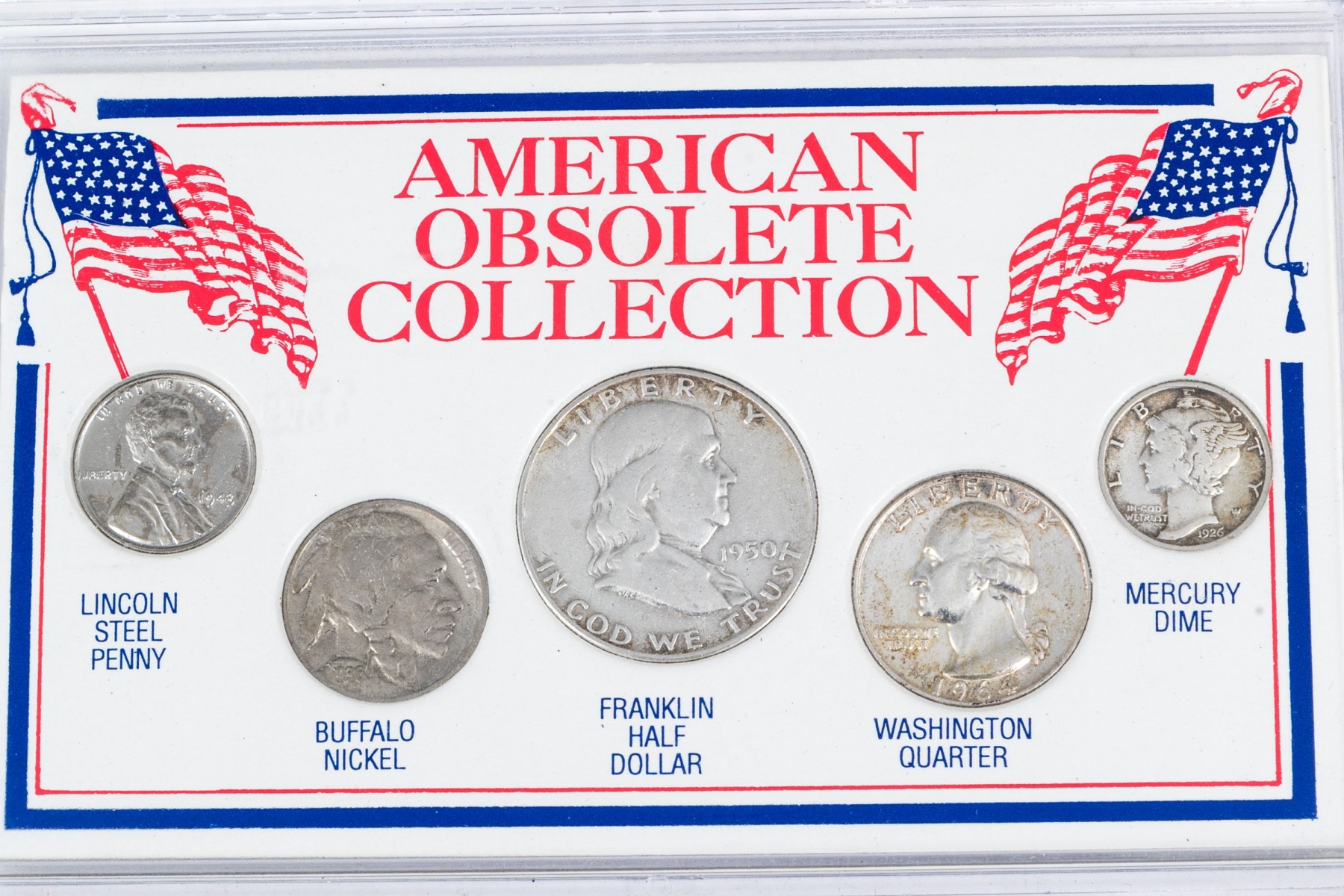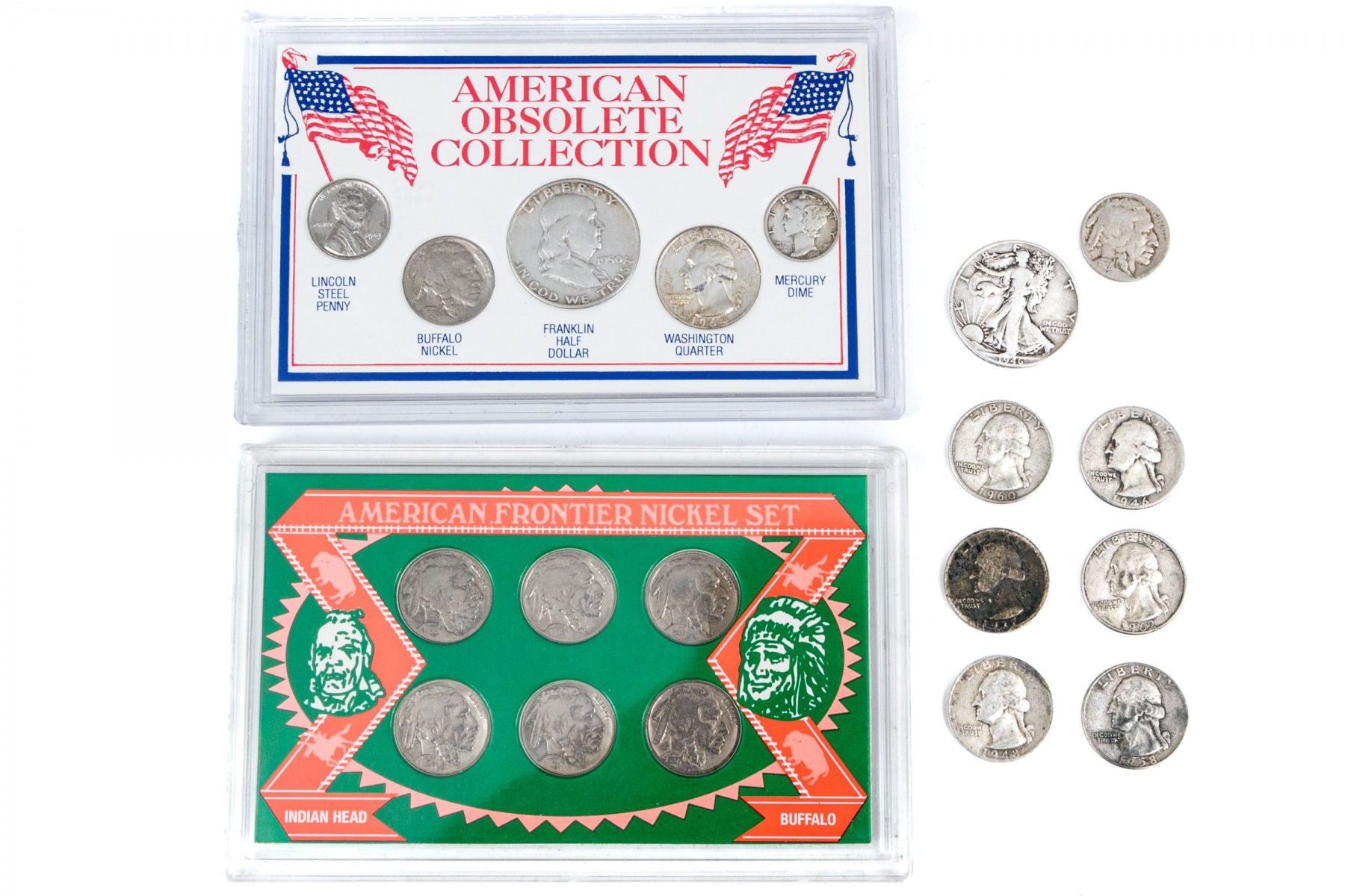 Seven Buffalo Nickels, various years. American Obsolete collections (1943 Lincoln Steel Penny, 1936 Buffalo Nickel, 1950 Franklyn Half Dollar, 1964 Washington Quarter, 1926 Mercury Dime). 1946 Walking Liberty Half Dollar. Six Washington Quarters.