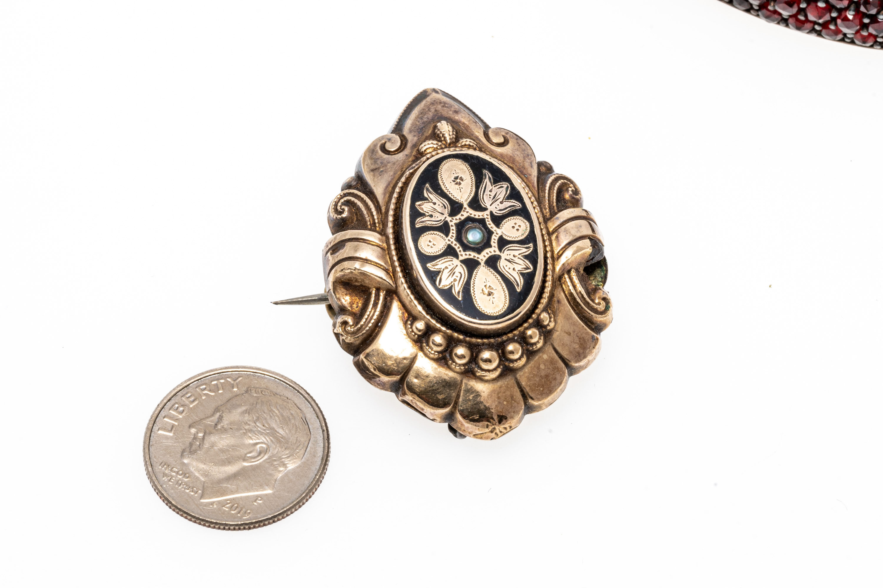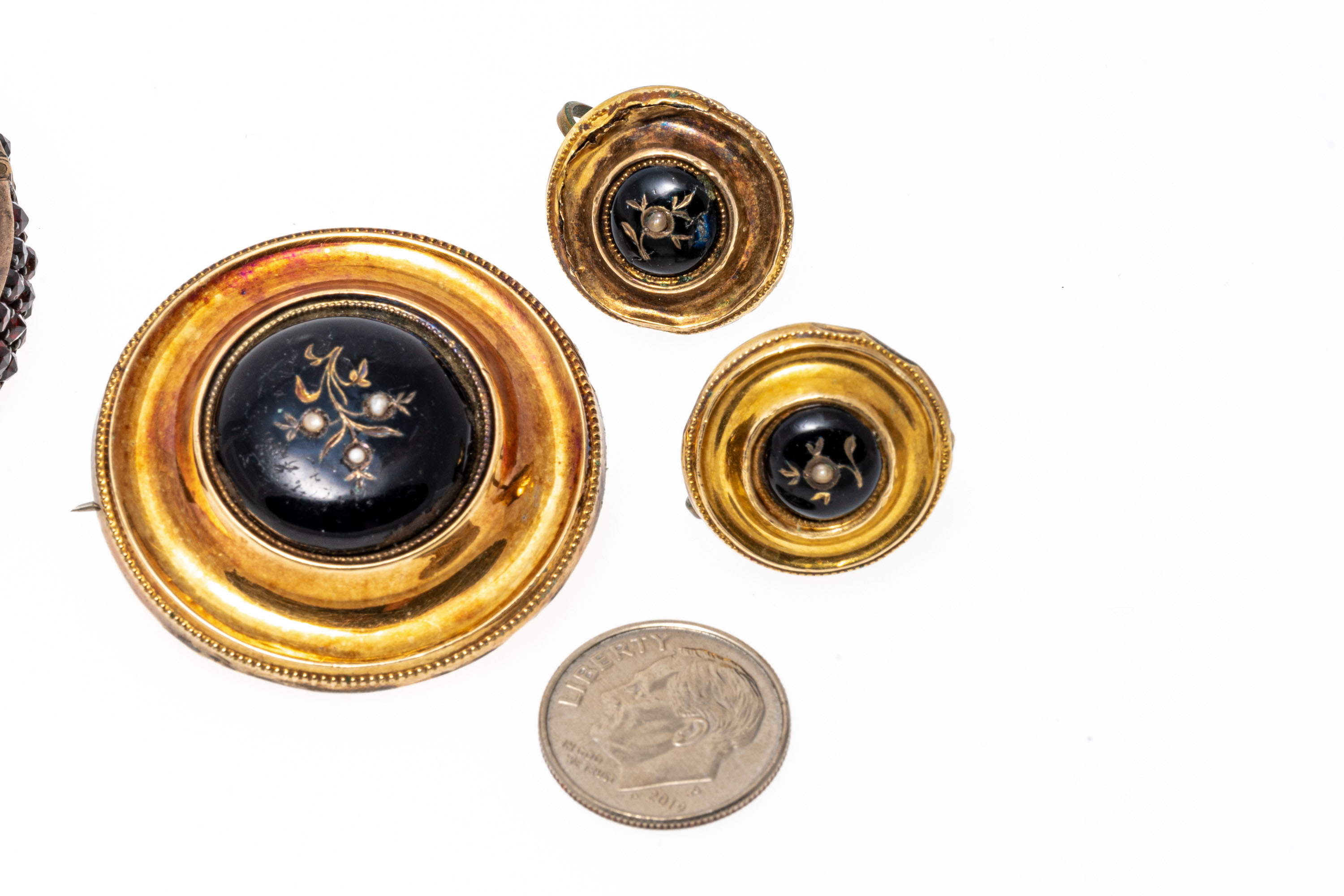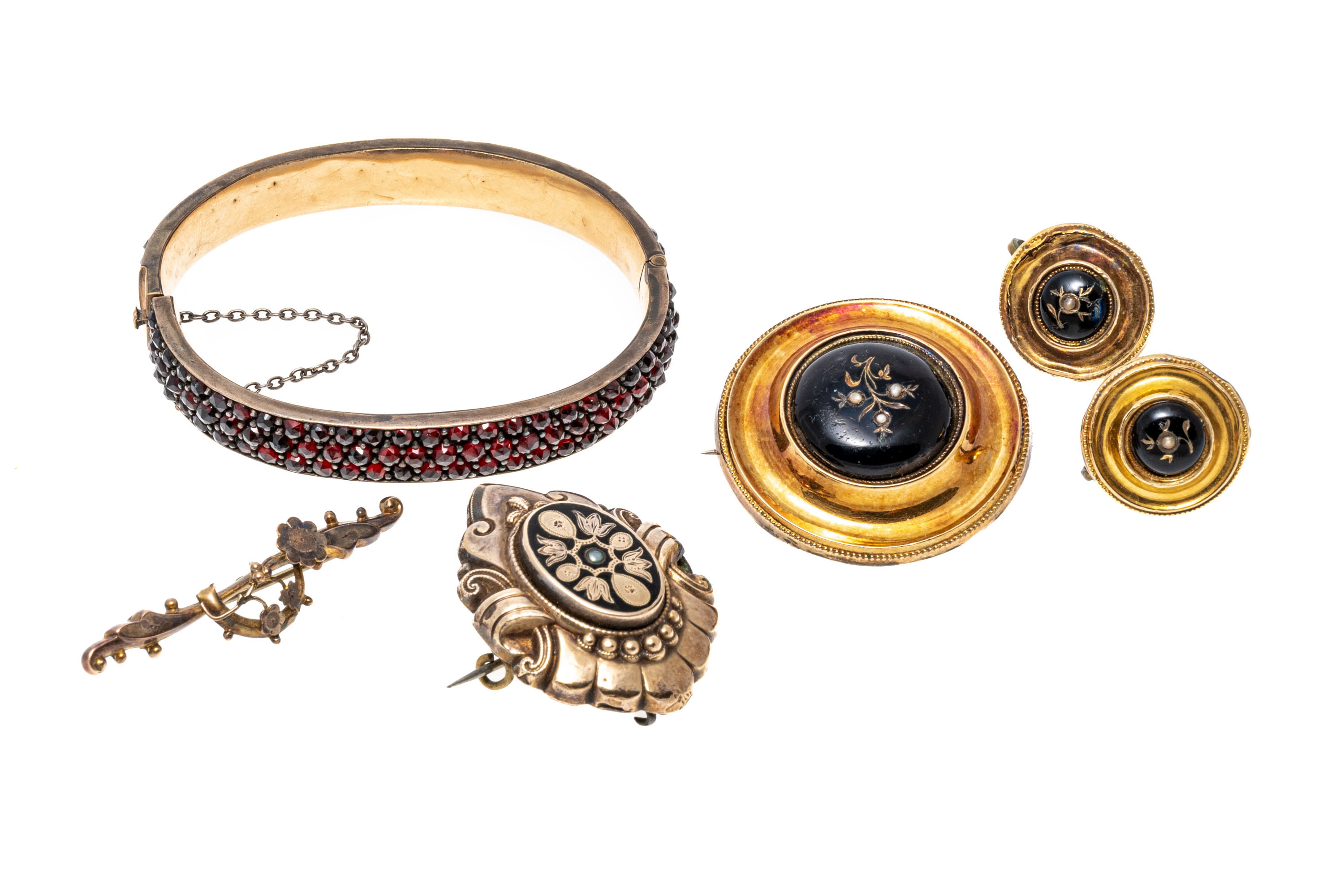 Collection of Victorian mourning jewelry, 9K and gold filled. Group of gold filled jewelry including bangle bracelet, and brooch. A gold filled and 9K circular brooch and a pair of screw clip back earrings. With this is a 9K yellow gold bar pin with a delicate floral design.